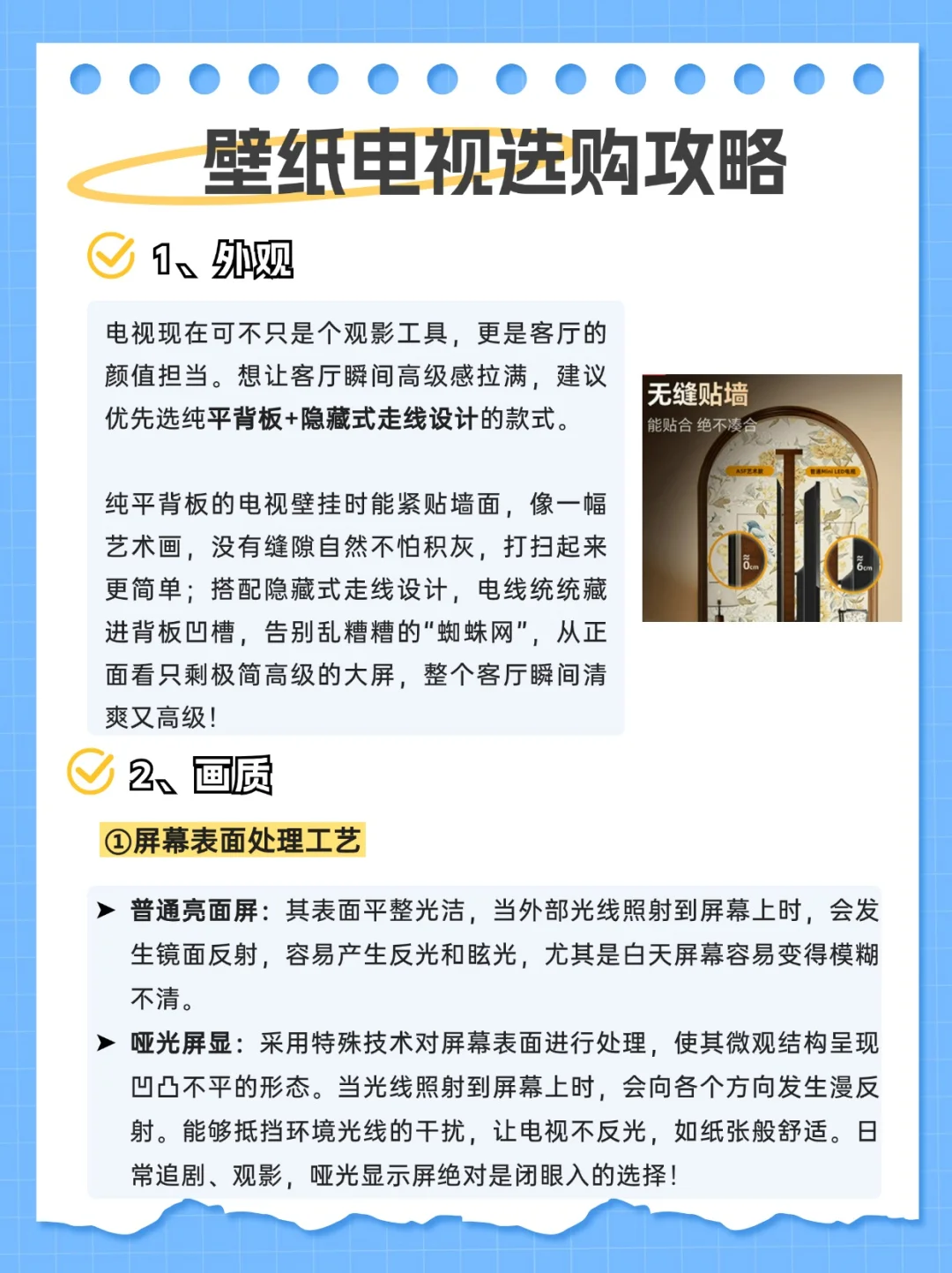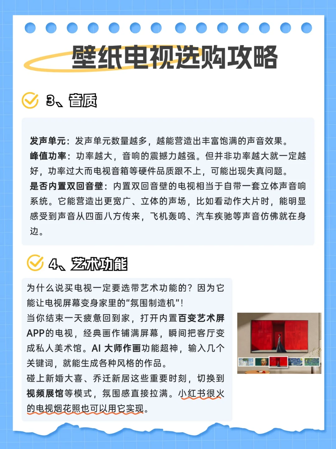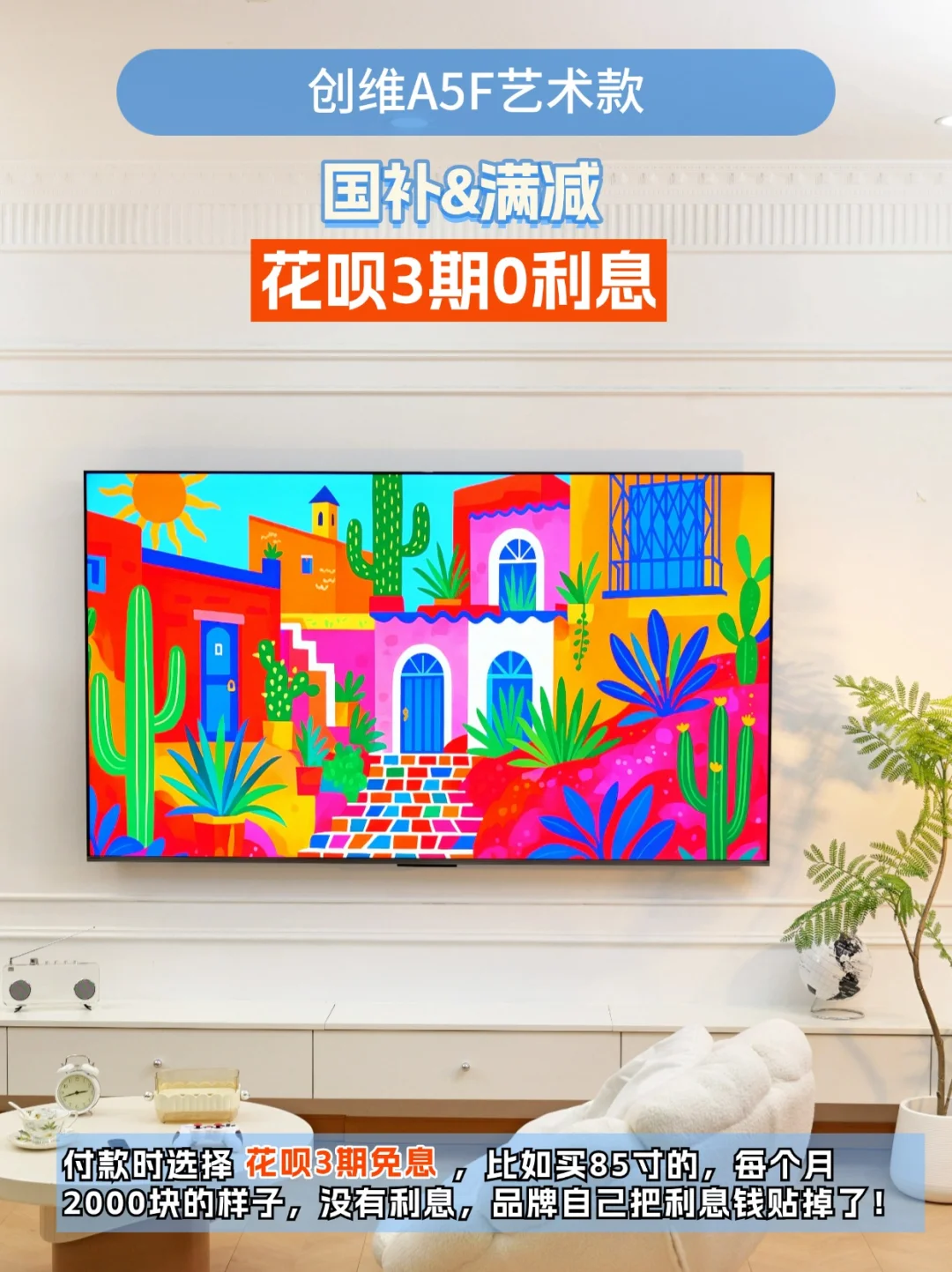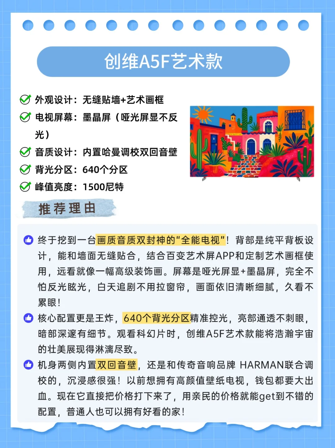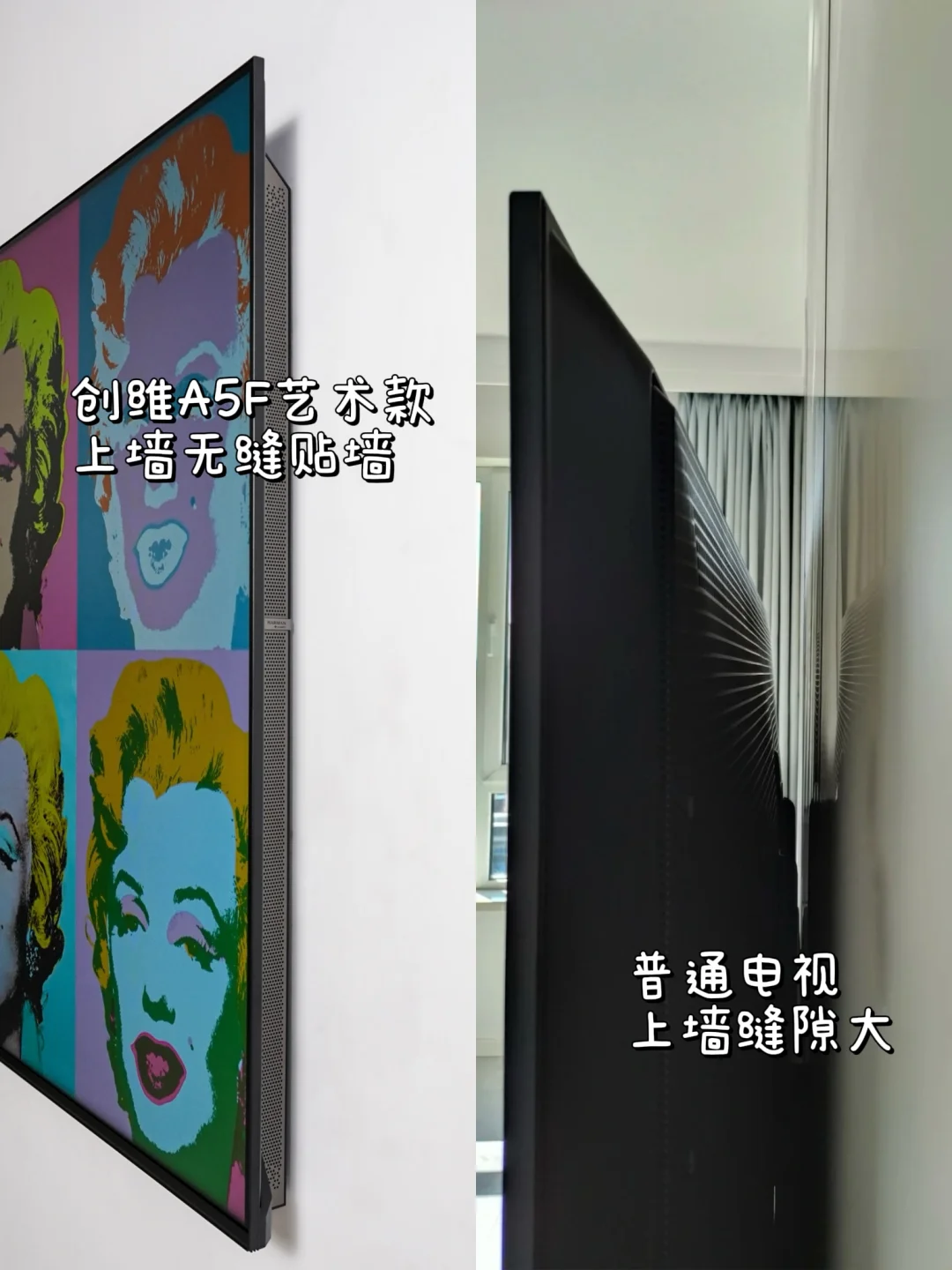 别再像我之前一样,贪便宜买的电视,画面简直灾难!看个电影,黑成一片啥细节都看不清;亮部亮得过曝,爆炸场景直接白成光斑。 中午想追剧,电视屏幕反光得像照镜子,必须得拉窗帘。背部还有个小书包,没多久就全是灰,打扫起来很麻烦。现在每次打开电视一肚子火,618这波大促想换电视的宝子,千万别盲目冲这篇踩坑后总结的选购指南,手把手教你挑到性价比梦中情机。 1⃣外观 一定要选壁纸电视,无缝贴墙+隐藏式走线设计的电视,家里直接提升一个level 2⃣画质 ①屏幕素质 优选墨晶屏,没有反光,观感干净高级。 ②背光分区 背光分区数量越多,画面显示越精准。600的分区是优秀级别 ③峰值亮度 峰值亮度越高,电视就越亮,画面就更清晰。1000尼特以上,2000尼特以下性价比高 3⃣音质 内置双回音壁的电视,相当于自带一套立体声音响系统。能营造出更宽广、立体的声场。 4⃣艺术功能 带艺术功能的电视能变身家里的“氛围制造机” 当你结束一天疲惫回到家,打开内置百变艺术屏APP的电视,经典画作铺满屏幕,瞬间把客厅变成私人美术馆。 碰上乔迁新居这些重要时刻,切换到视频展馆等模式,氛围感直接拉满。很火的电视烟花照也可以实现。 👉自用壁纸电视分享——创维A5F艺术款 终于挖到一台画质音质双封神的“全能电视”! 背部是纯平背板设计,能和墙面无缝贴合,再加上百变艺术屏APP和定制艺术画框挂在墙上,真的就像一幅高级装饰画!屏幕是哑光屏显,完全不怕反光,白天追剧不用拉窗帘,画面依旧清晰细腻,久看不累眼 核心配置更是王炸,640个背光分区精准控光,亮部通透不刺眼,暗部深邃有细节。观看科幻片时,创维A5F艺术款能将浩瀚宇宙的壮美展现得淋漓尽致,机身两侧直接内置双回音壁,看动作大片时,子弹穿梭的轨迹声从耳畔疾驰而过,方位清晰可辨,以前想拥有高颜值壁纸电视,钱包都要大出血。现在创维A5F艺术款直接把价格打下来,普通人也可以拥有好看的家 付款时选择花呗3期免息,比如买85寸的,每个月2000块,没有利息,品牌自己把利息钱贴掉了,还可以叠加国补20%和满减!