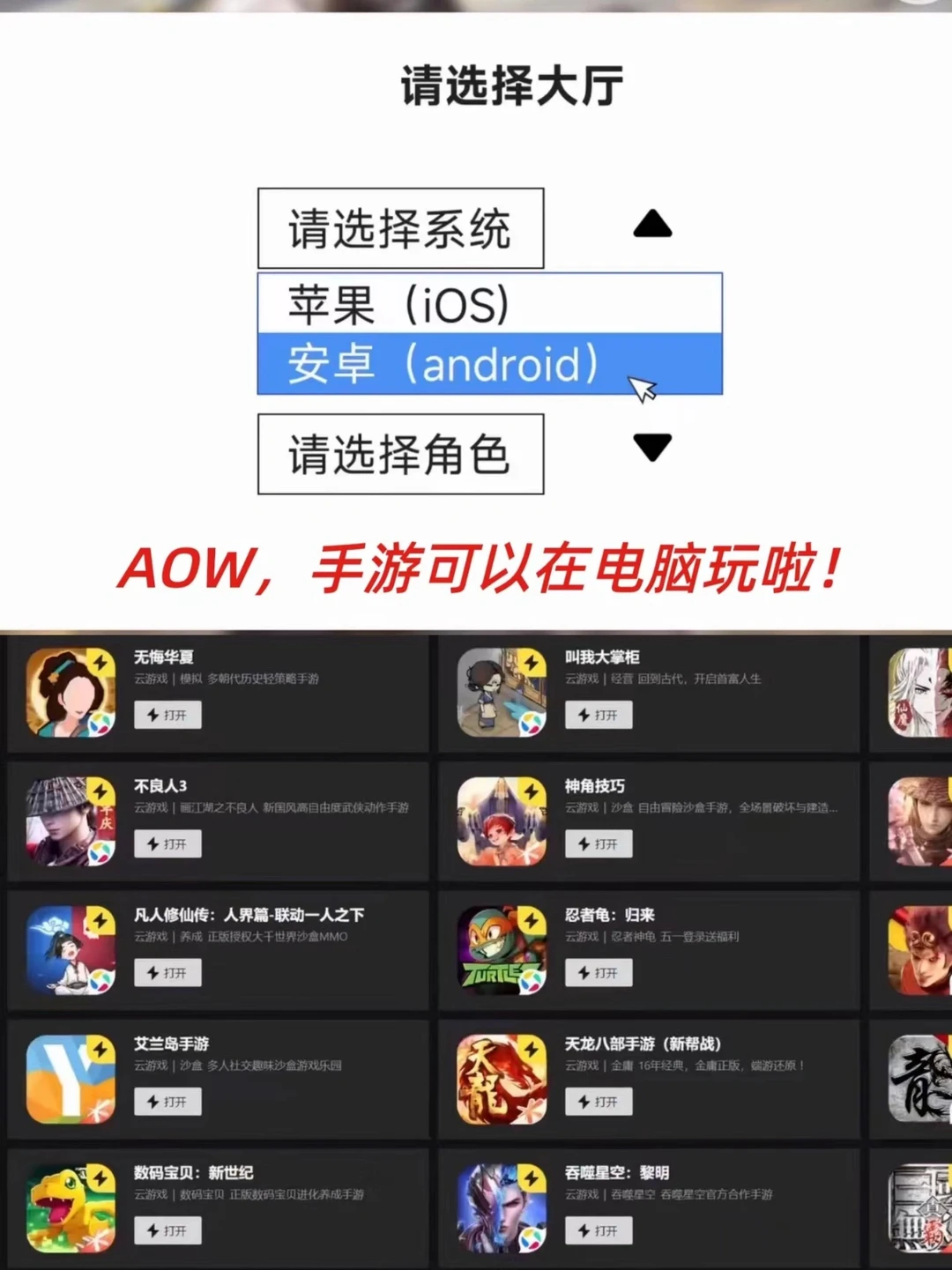 ✅AOW:简单说就是手游可以在电脑上玩,像金铲铲之类的,大屏的体验不要太爽!