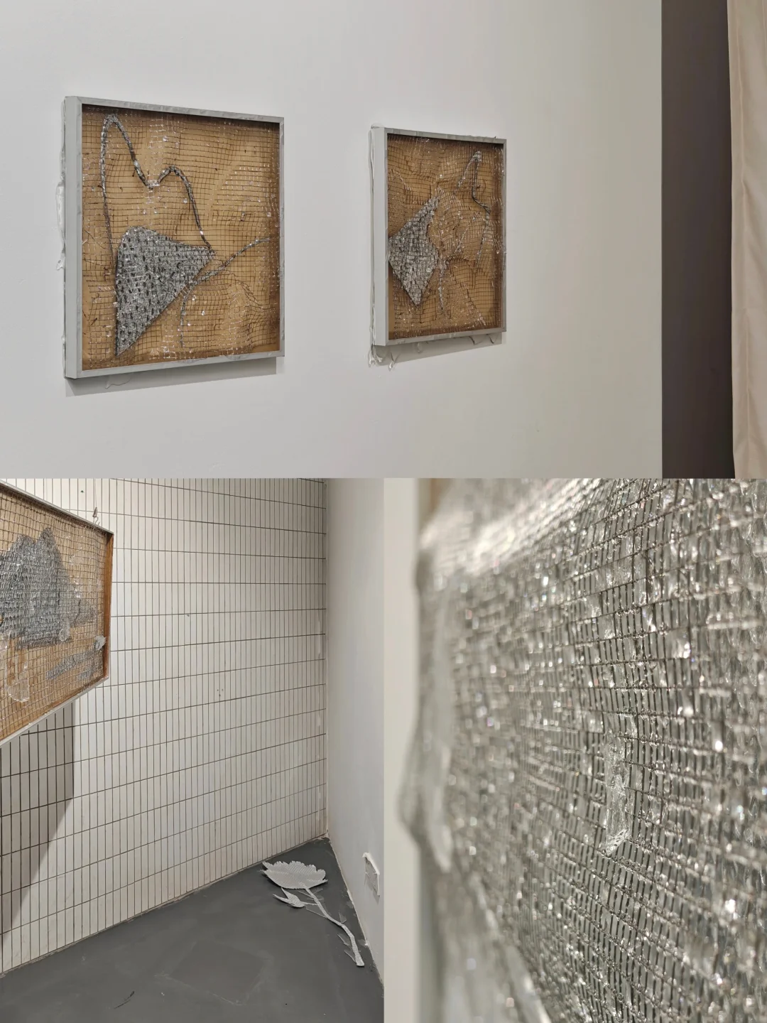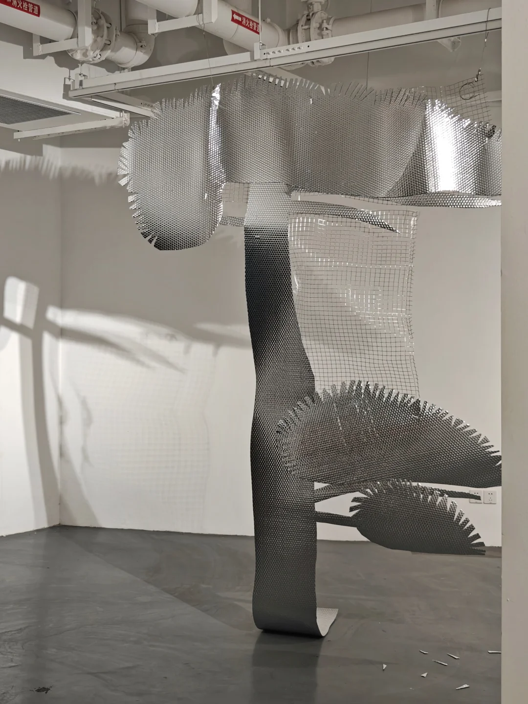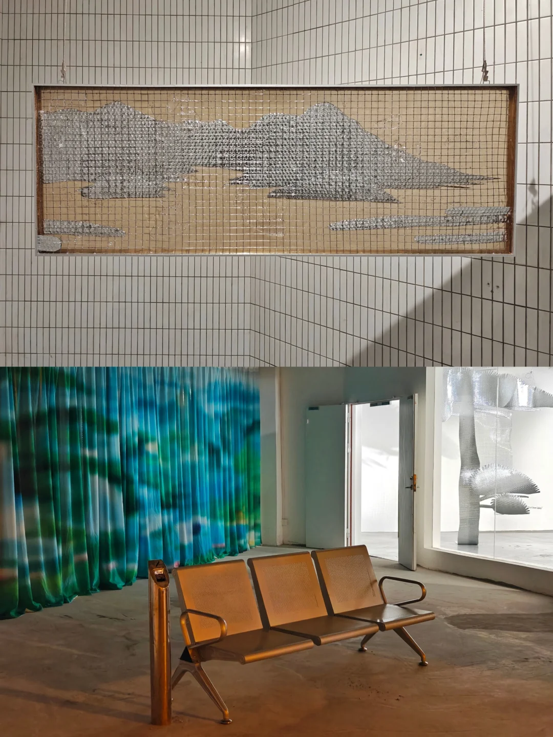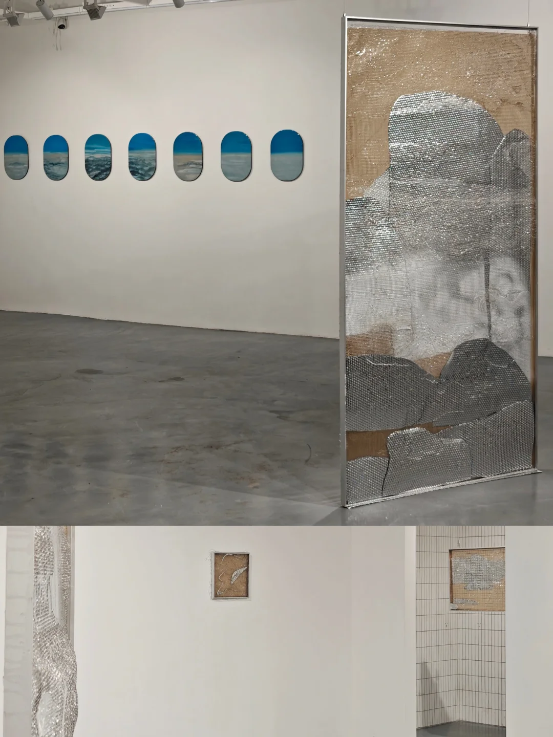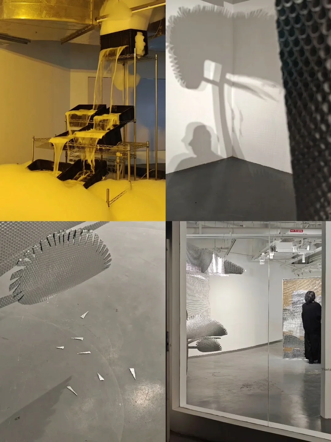 ⚪使用塑料捡货框、人造草皮、镀铝气泡膜、绢布、手表指针等工业材料,构建装置与绘画,打破传统媒介边界。