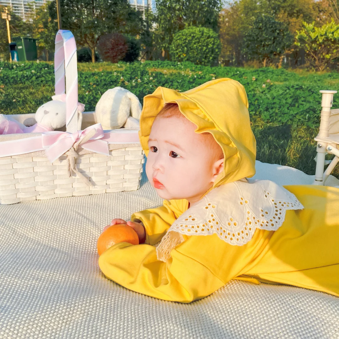 我个人比较喜欢买这种连体的三角哈衣,因为一双白袜子,基本上就可以随意搭配了。长裤的连体衣现在这个季节其实不算太推荐,因为七八个月的娃基本上都是抱着的,一抱裤子就会往上面跑,小腿基本上就全部露出来了。