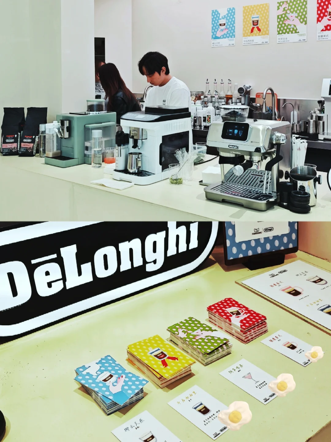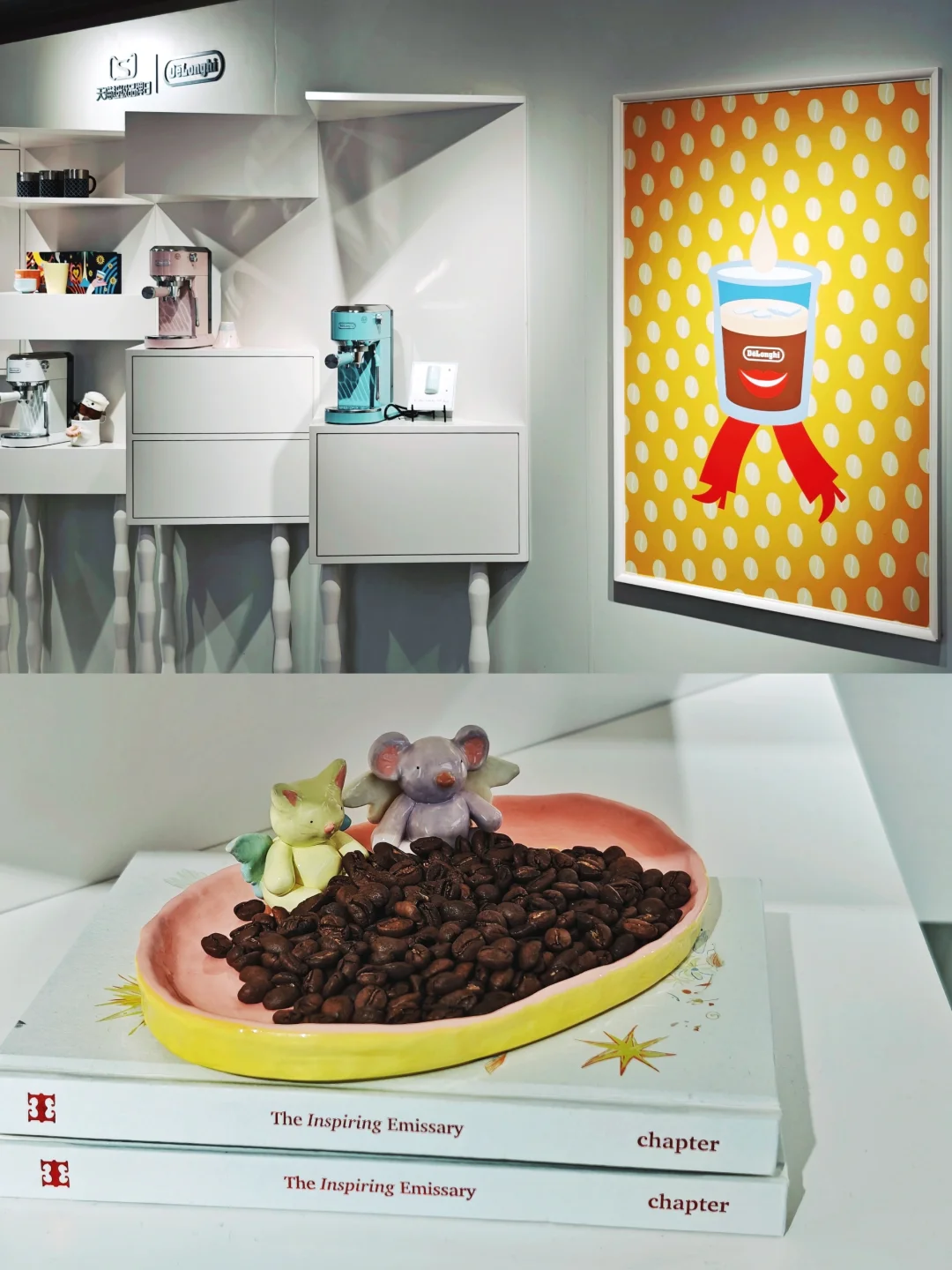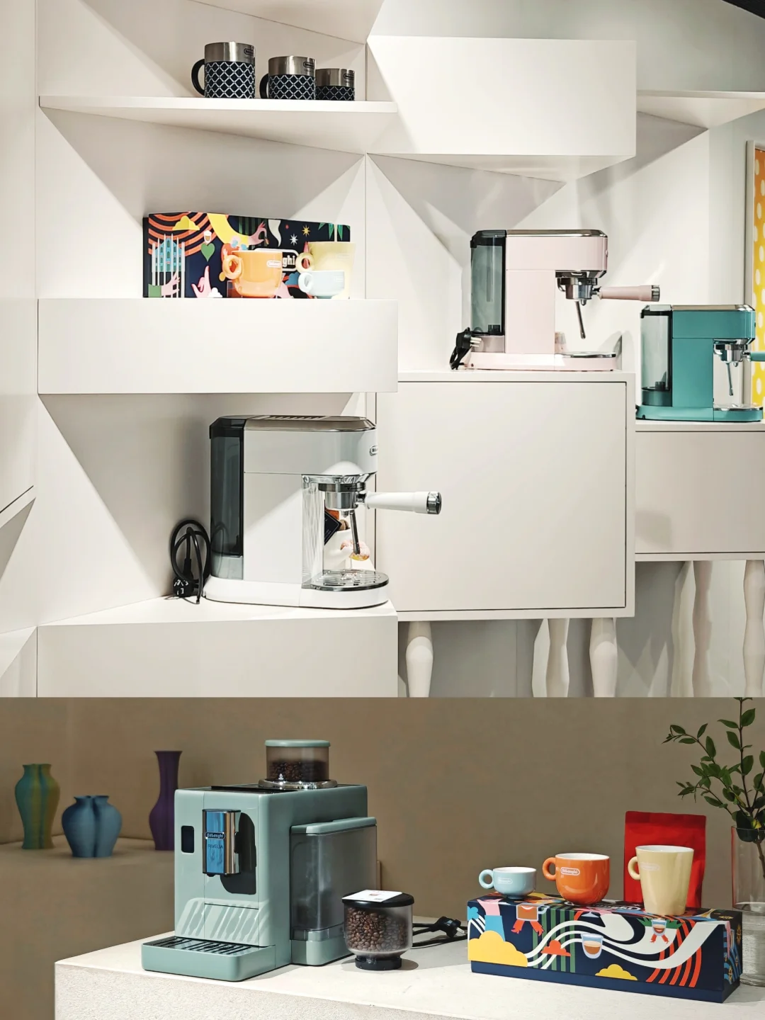☕整体多巴胺配色的布展,很解压,不过下午去人很多都坐满了,体验稍差。现场有多款半自动、全自动咖啡机陈列,都很适合家用。糖果配色的那几款搭配了同色系的艺术品,很可爱哦~
