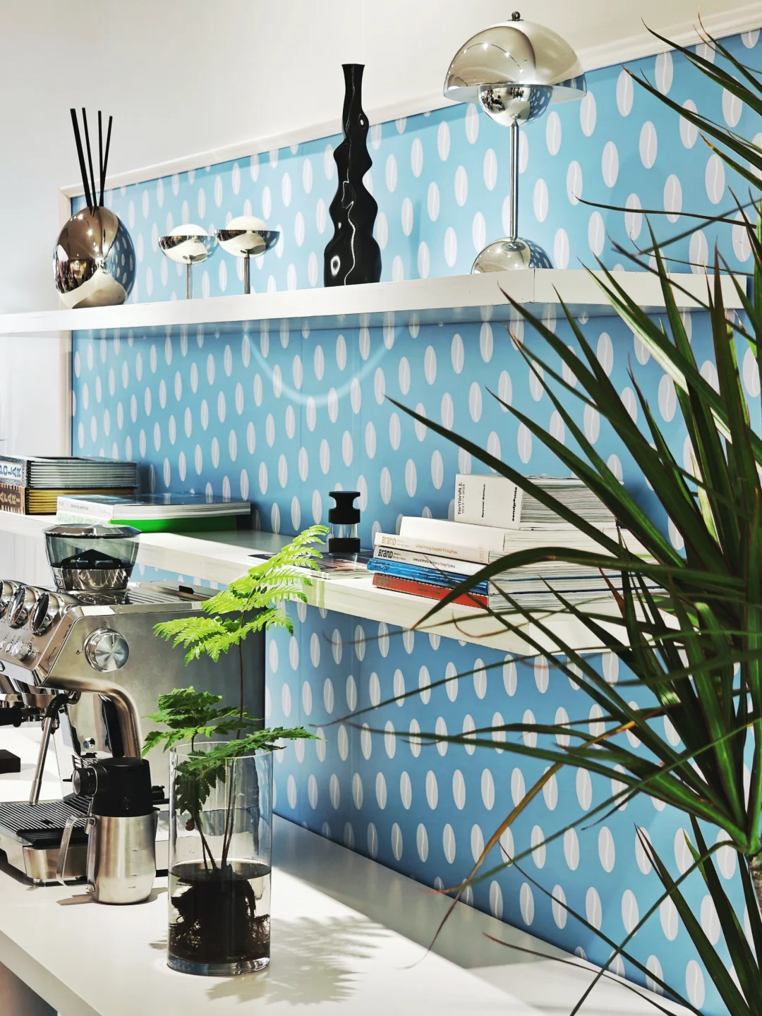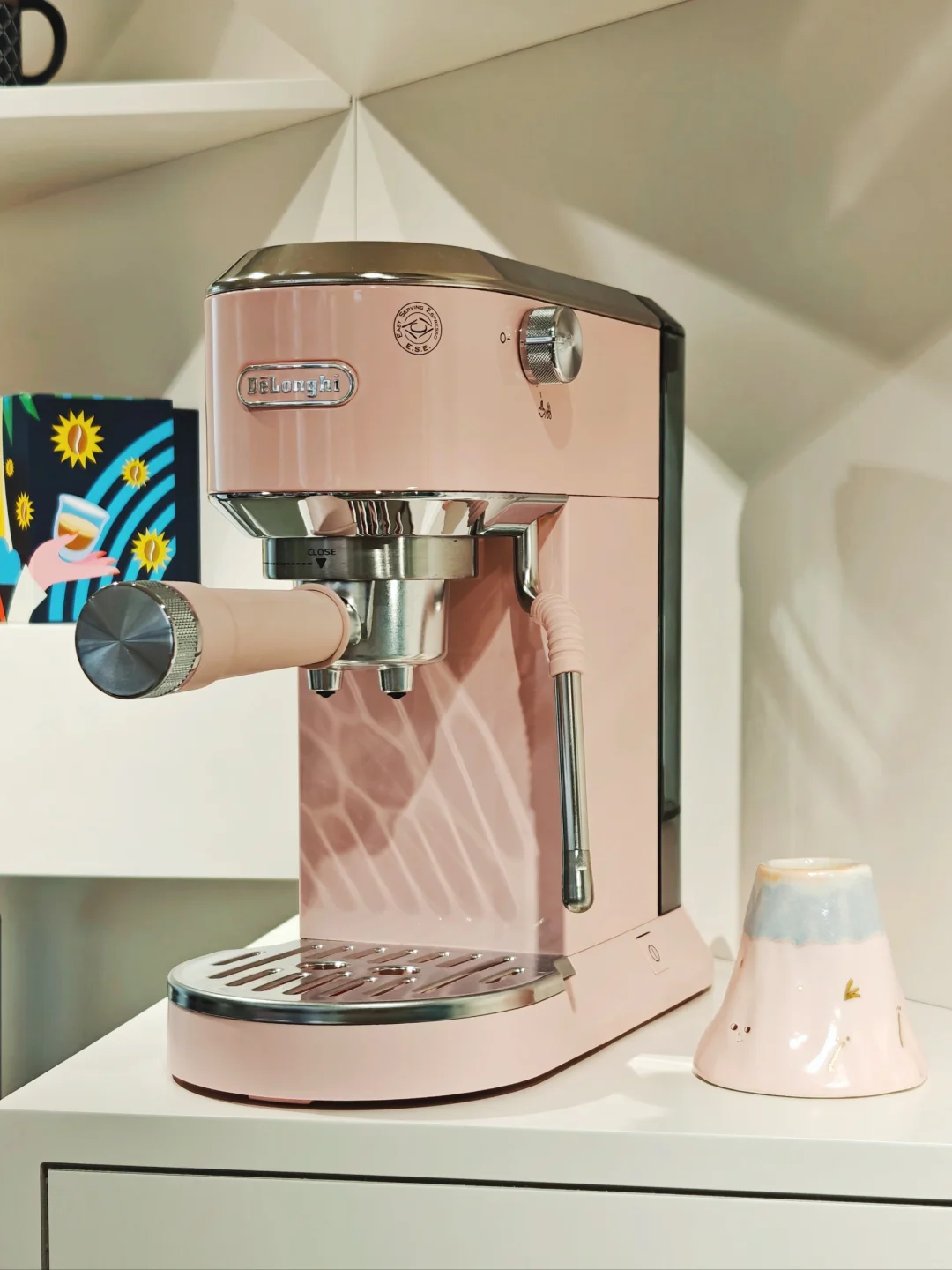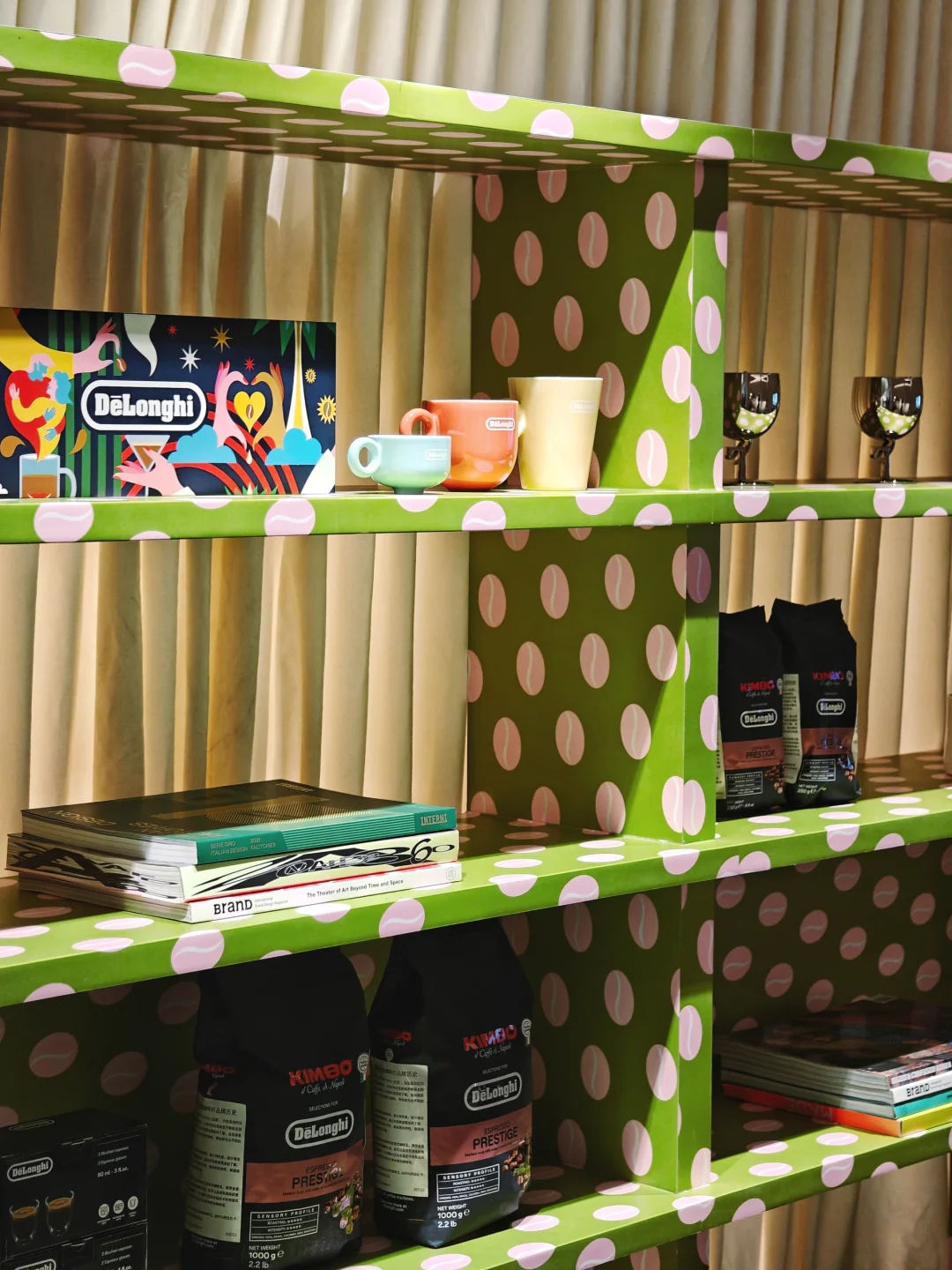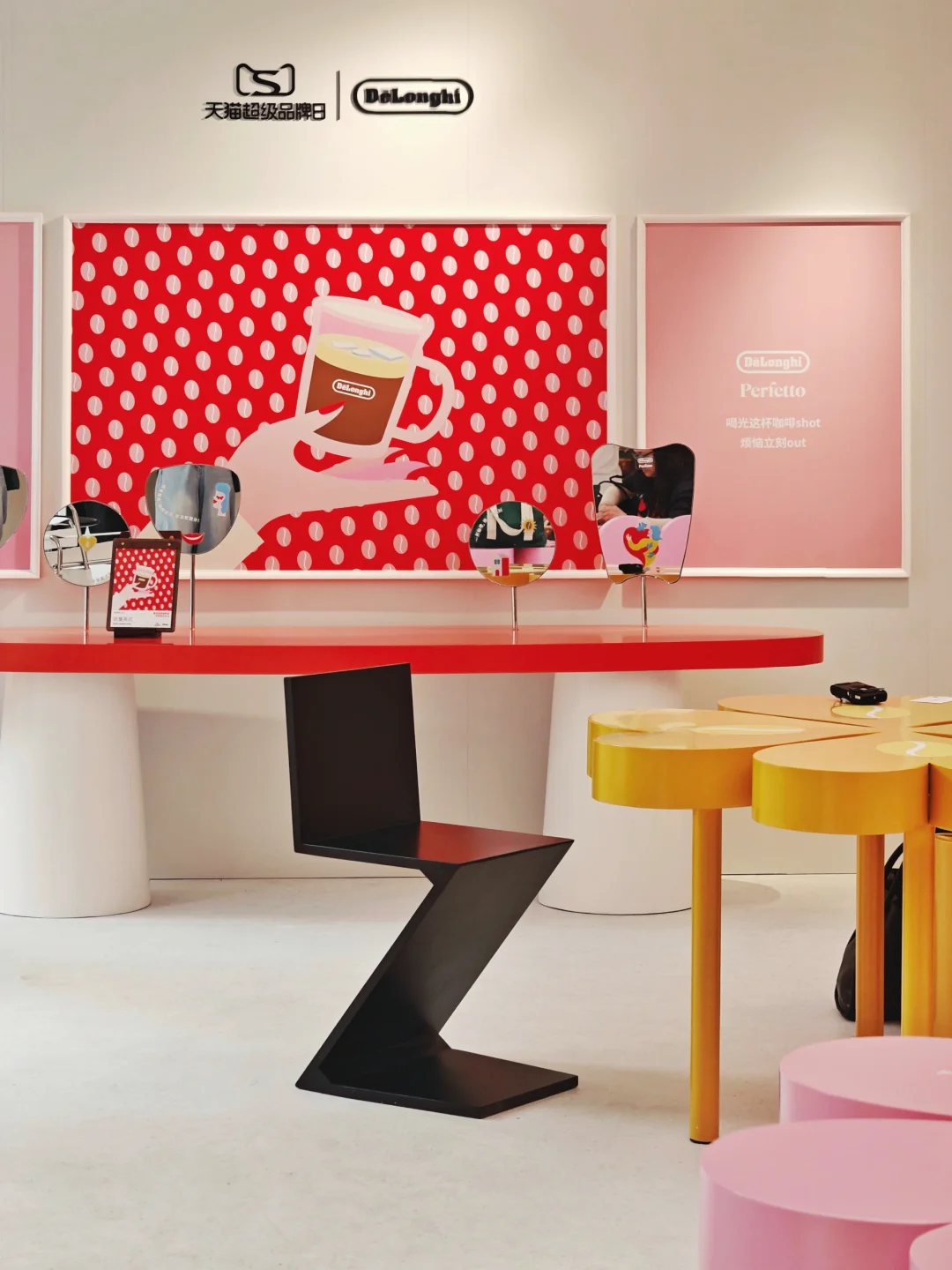 ☕整体多巴胺配色的布展,很解压,不过下午去人很多都坐满了,体验稍差。现场有多款半自动、全自动咖啡机陈列,都很适合家用。糖果配色的那几款搭配了同色系的艺术品,很可爱哦~
