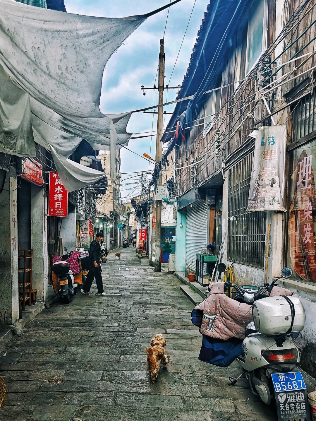 🏠整条中山路几乎都是老房子和已不多见的电线杆与蛛网般的电线,县内别处已难寻。在其间行走仿佛回到了上世纪八九十年代。沿路店铺都是街坊邻里店,比较有意思的是有不少命理店。💈理发店还都保留着古老的画风,不是那些时髦的“拗造型”故意复古的精致店铺,是那种真实的“复古”。不经意瞥见几间大方敞着门的民居客厅,主人端坐正中,面朝外,屋内格局和陈设也好像年代剧镜头一般