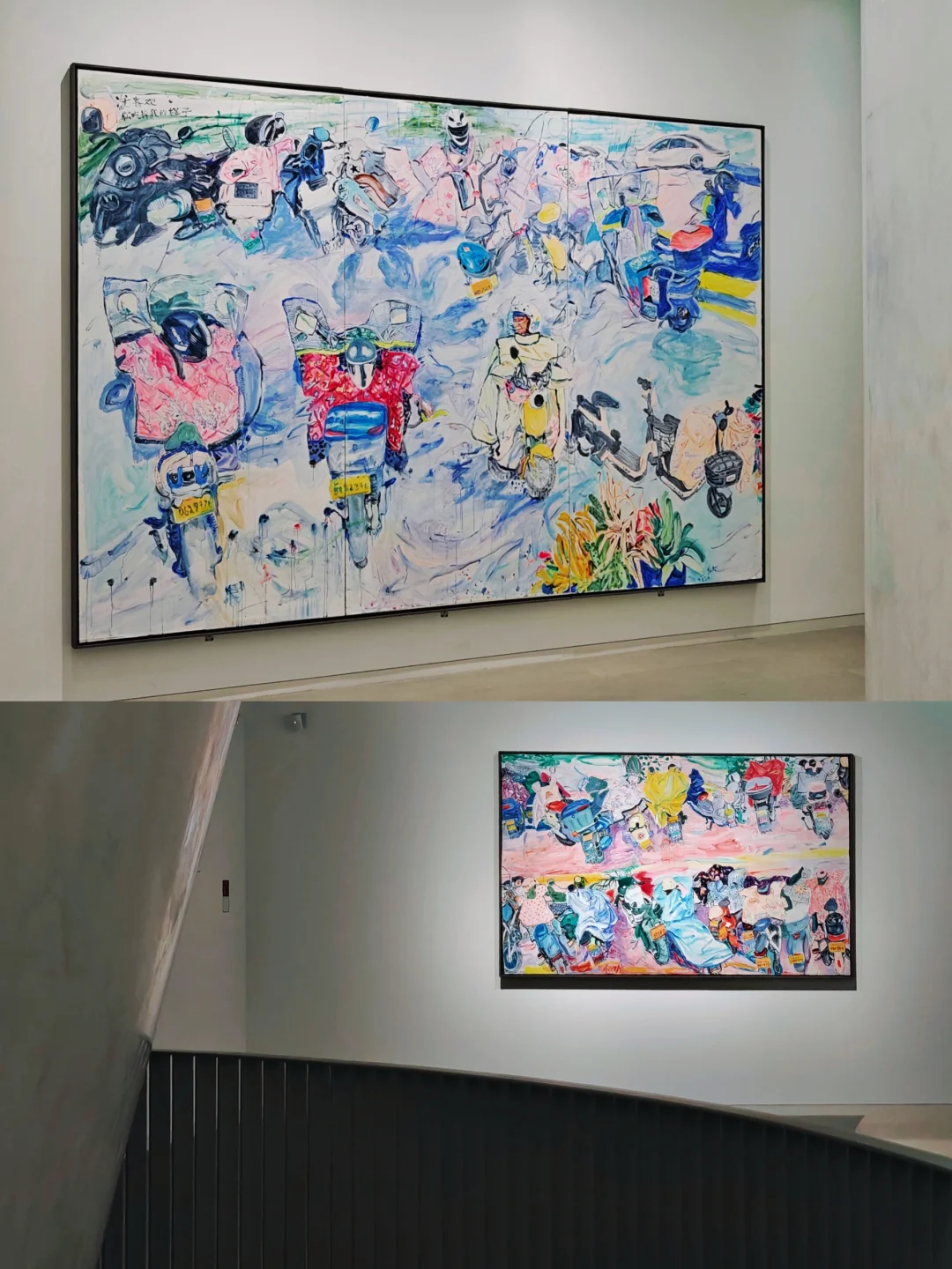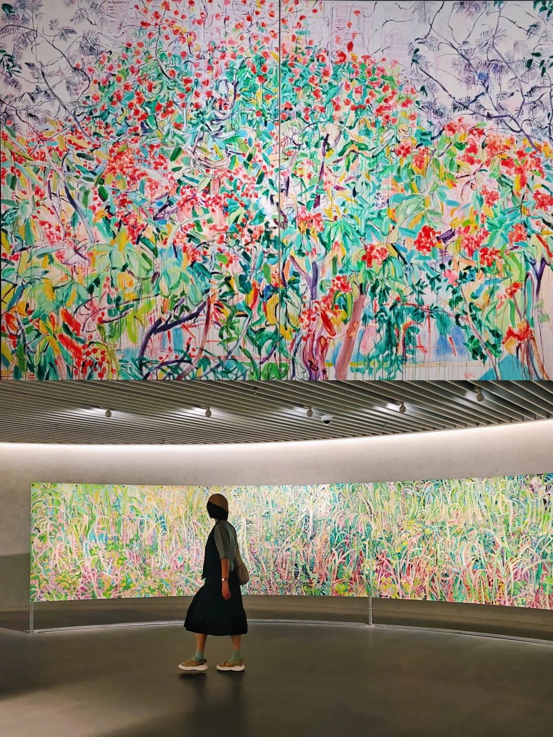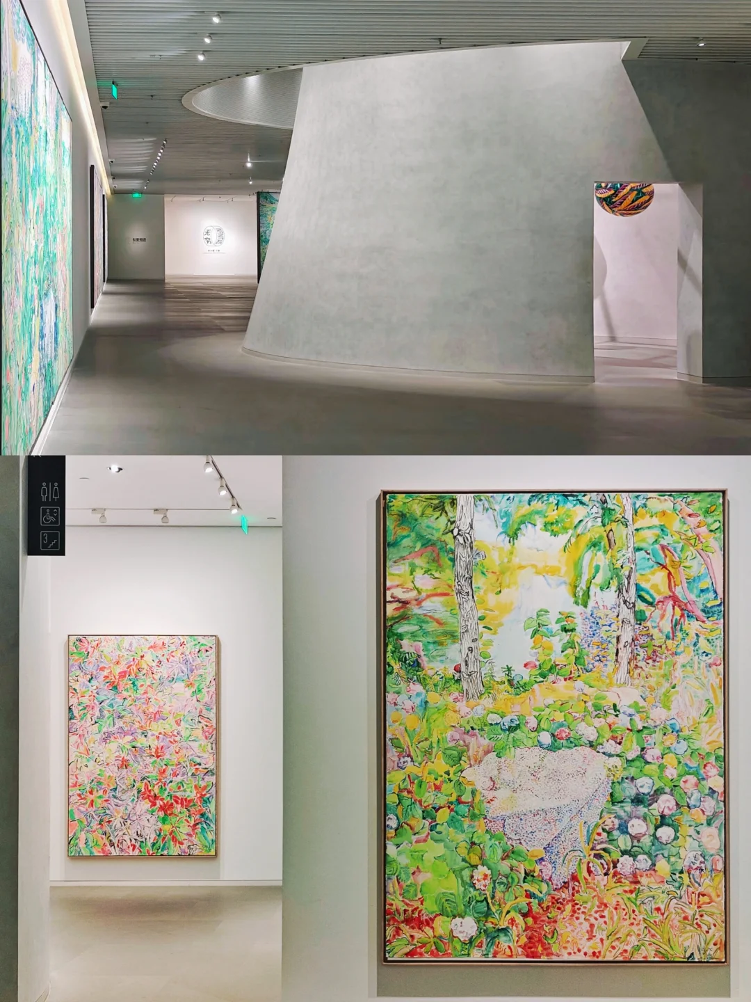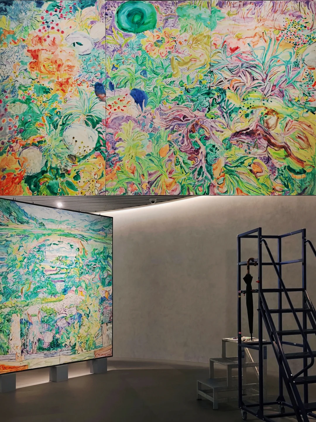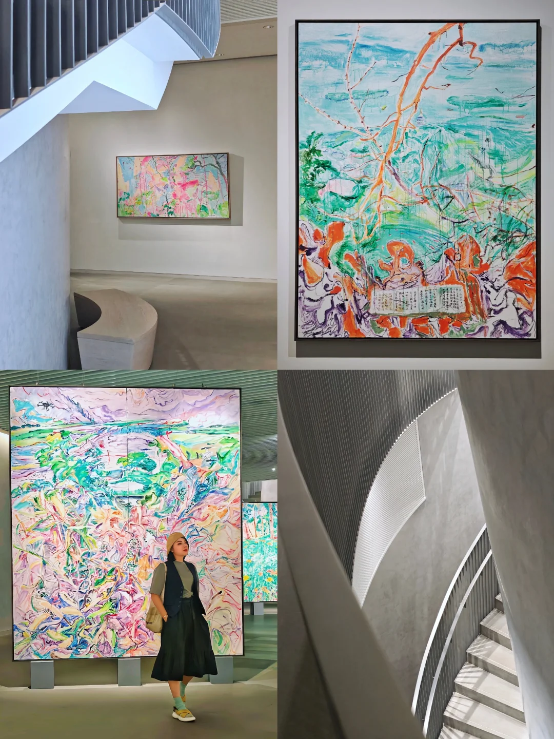 👉去年在瑀空间看过艺术家的小型个展,就觉得他的作品一定是大尺幅更好看,画廊空间限制,没有那么惊艳。这次震旦这个场地真的是很合适了。场馆本身是安藤忠雄设计的工业冷淡风混凝土灰色空间,让作品的色彩呈现更鲜明,超大尺寸的画面让人很有沉浸感。