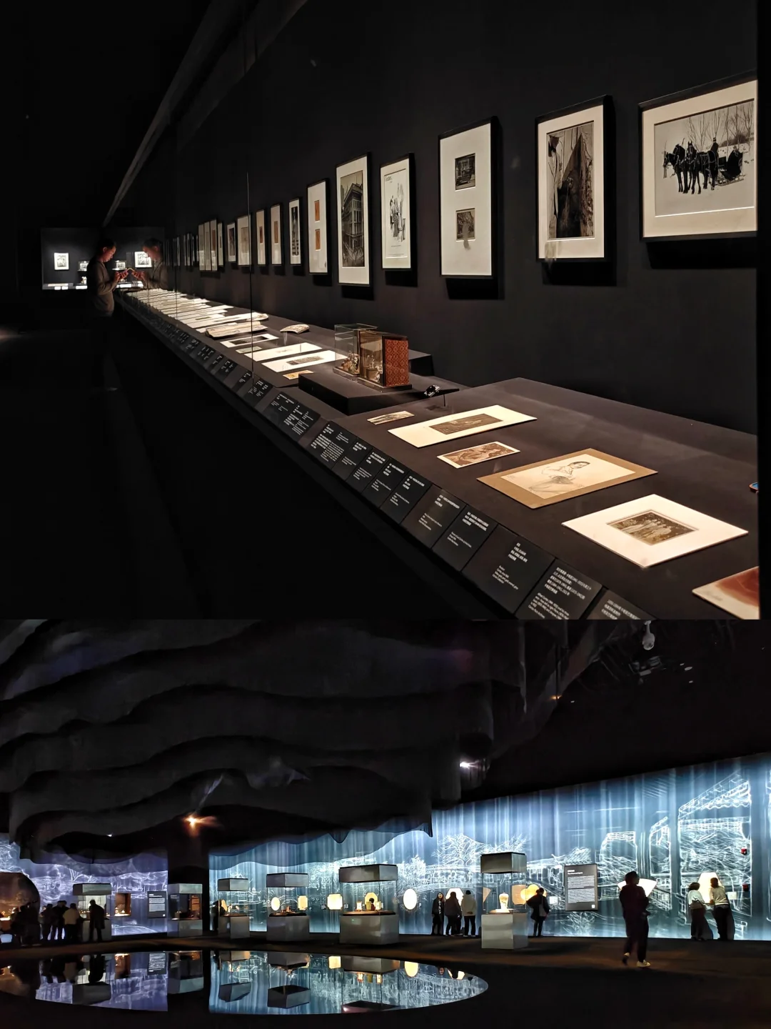 👉展陈设计也颇有噱头,使用了蔡国强团队开发的AI模型,展厅中间完全被“浪费”了。关于这个展陈网评也是挺两极分化的,个人观感还可以。视觉冲击力是有的,但所谓的江南意境,其实观感就和看那些用中国元素设计的首饰差不多。右侧的白色展柜部分的开窗风格其实让我有点想到恭王府的后罩楼那46个形状各异的窗子,左侧的水墨画风格就真的挺一眼AI的,展柜不规则开窗部分像是烧烫出来的,有点蔡国强烟火作品的视觉效果。中间模仿山峦起伏的大型装置留白,地面上的镜面效果灵感是否来自于火遍各种景区的“镜面效果”。蕞败笔的应该就是白色瓷板中间那不规则又巨大的缝隙了,其实这个我真不理解,一整块无法烧制没关系,但为啥块与快之间的拼接不能做得严丝合缝一点呢。