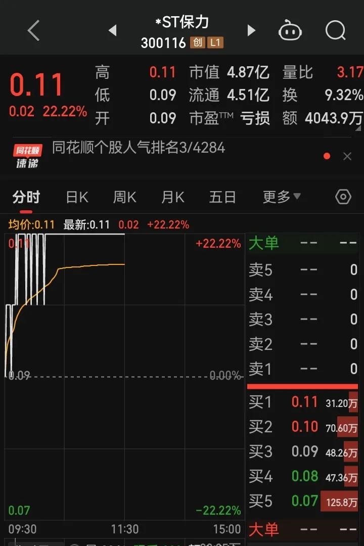 st保力昨天买的,买的时候就当玩个游戏,今天涨停价卖了,也是游戏。估计下午的某个时候,瞬间跌停,收盘这票就等于归零了。钱是自己的,看心情自己做主,但还是奉劝想赌的各位,此票若有再上市,估计你已不在了。 * ST 保力最后一天,利用股票价格极低,散户贪婪的心理,先让股票平开,充满想象,然后拉升,涨停板出货。尾盘下杀。利用新三板的重新上市给散户们希望,可是国九条出来之后,这个希望很渺茫,如果没有国九条,或许有大资金操作一下,还是比较有想象空间的,毕竟现在的价格也就是新三板最后差不多的价格。但是现在非从前,无论多少钱都是钱,切勿进,个人观点。 ST 左江也是我之前提到过的,有一部分人没有听,现在退市了,而且价格偏高,三板之后会跌更多。加油,都是为了赚钱,且行且珍惜。