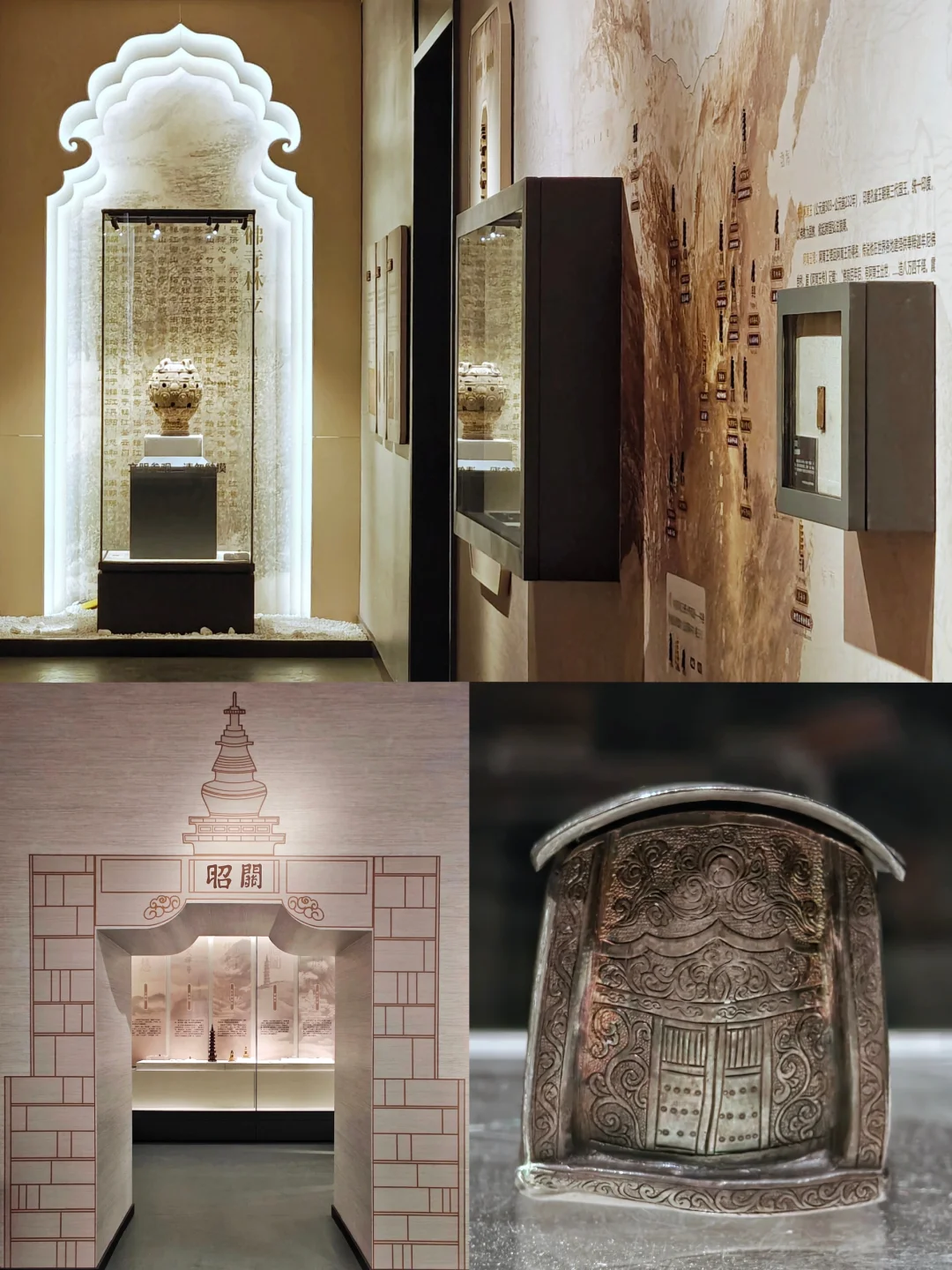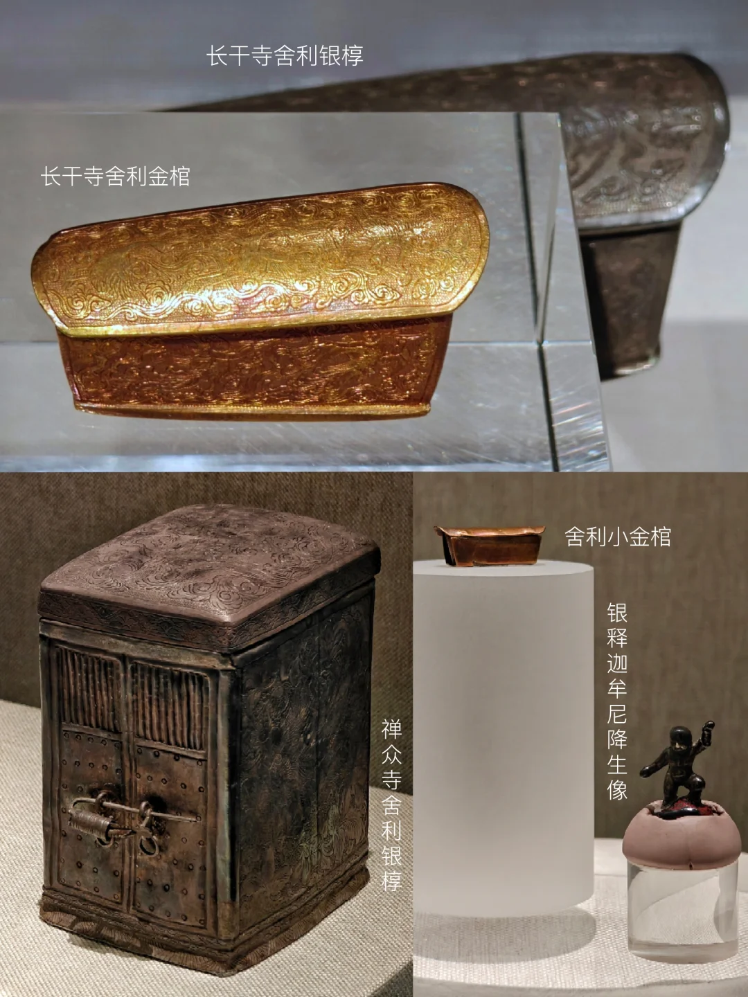 长干寺舍利金棺、长干寺舍利银椁、禅众寺舍利银椁(含禅众寺僧众舍利子)、舍利小金棺、银释迦牟尼降生像。精湛的工艺,反映了唐代金银器工艺的制作水平。