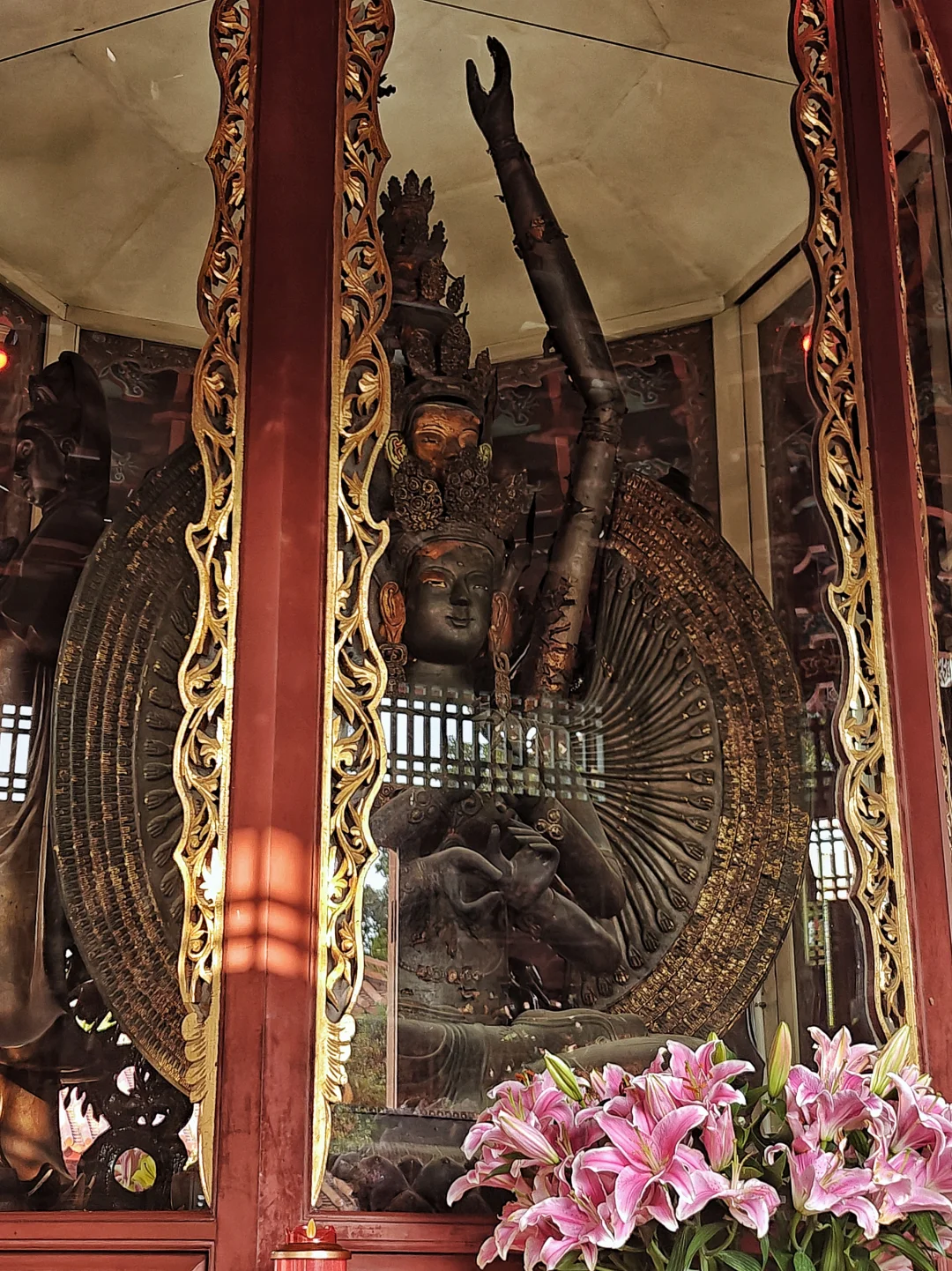 🙏🏻两尊佛像不可错过:法堂内铜铸阿弥陀佛(网上大多说隋代,年代有争议,但寺内却标注为元)高二米,重一吨多,右手下垂的姿态,甚为罕见。大悲殿四面供奉观音塑像,南面佛龛的明代千手千眼十一面观音菩萨塑像,据说是五台山请来的,带有浓厚的藏传佛教风格,甚是宏伟。