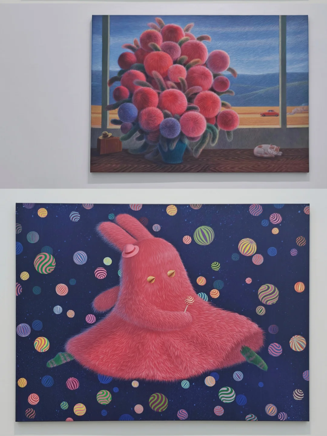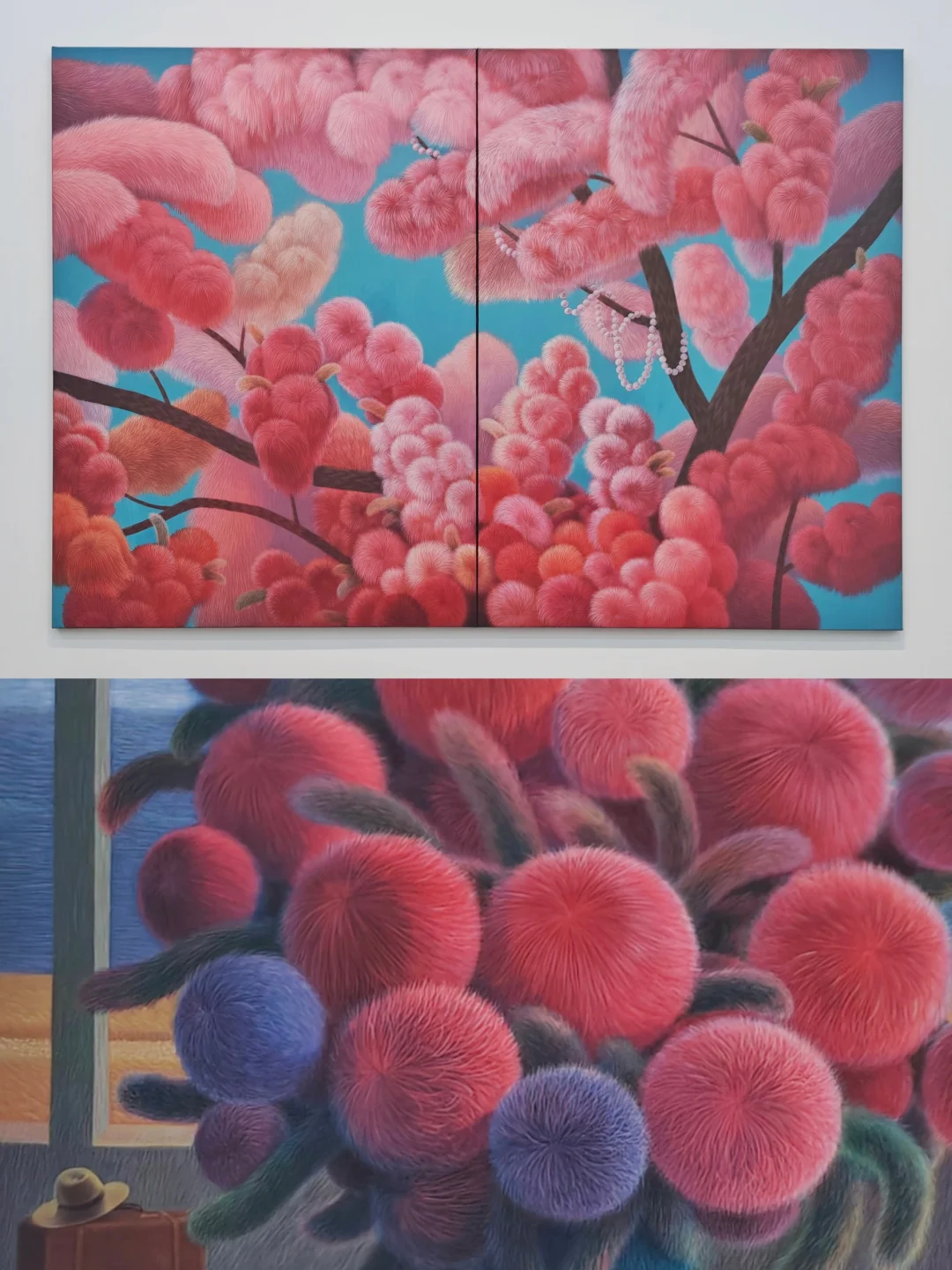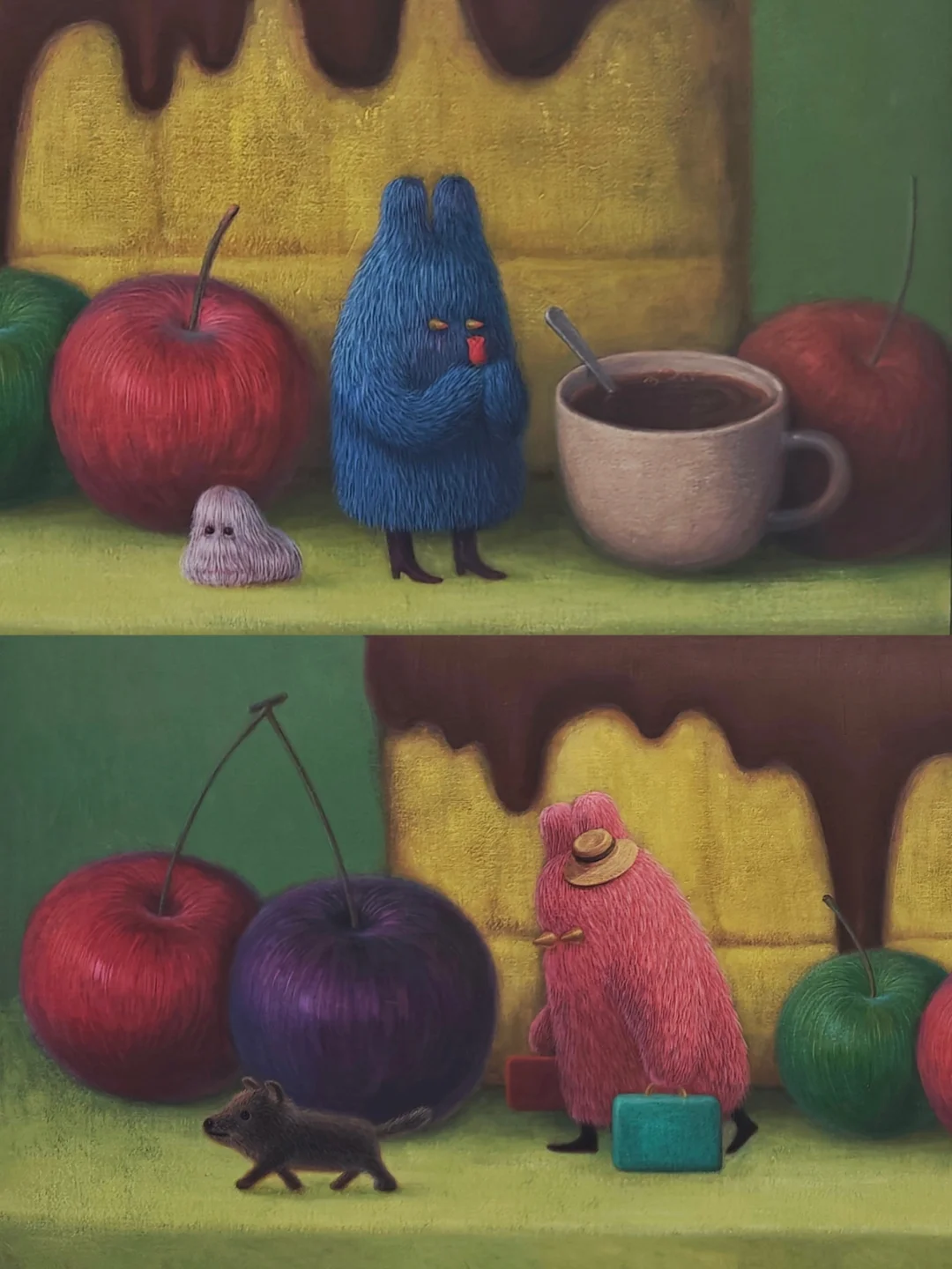 🔵这位艺术家的作品画面整体质感是“毛茸茸”的,其中的物品和生物都“长毛”,色彩柔和中又不失鲜艳,观感活泼又治愈,让人忍不住想伸手摸摸。充满细腻笔触的超现实主义画面中蕴含着许多让人熟悉的叙事感。