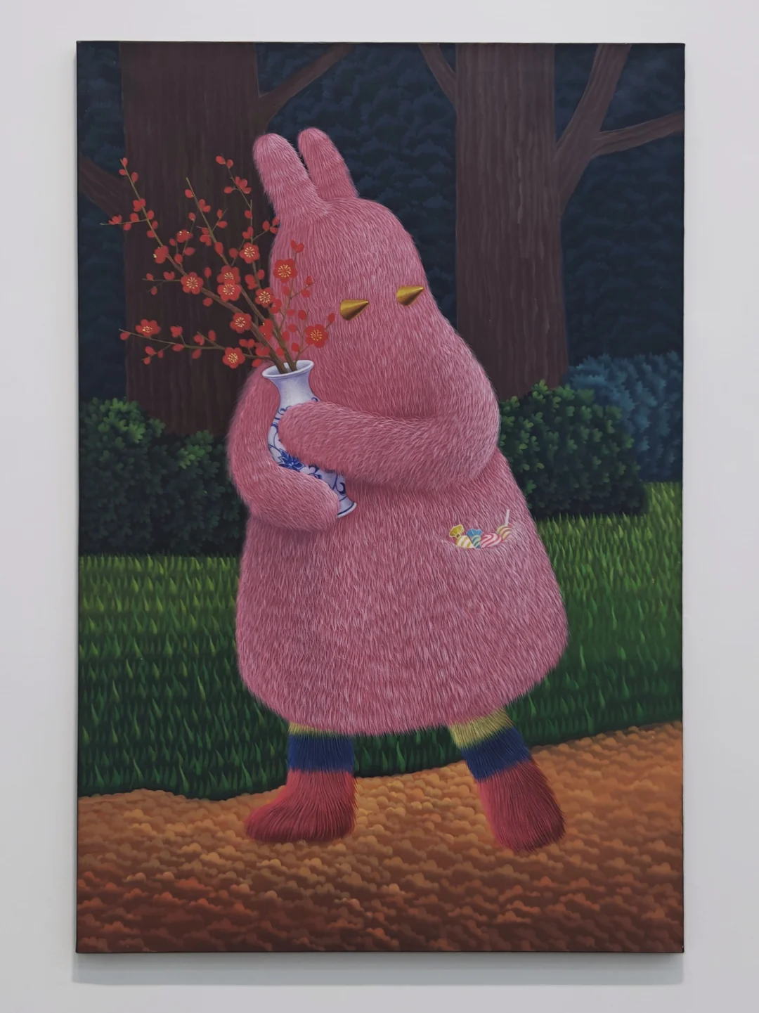 🔵一个看起来像是🐰的人形生物形象常常出现在画面中,柔软而亲切的外观以无限的宽容接纳着外界所有的不安与危险。如圆锥形般尖锐而危险的眼睛以锋利的侵略性打破了安逸和宁静,它以审慎的姿态凝视画框外观者的目光。