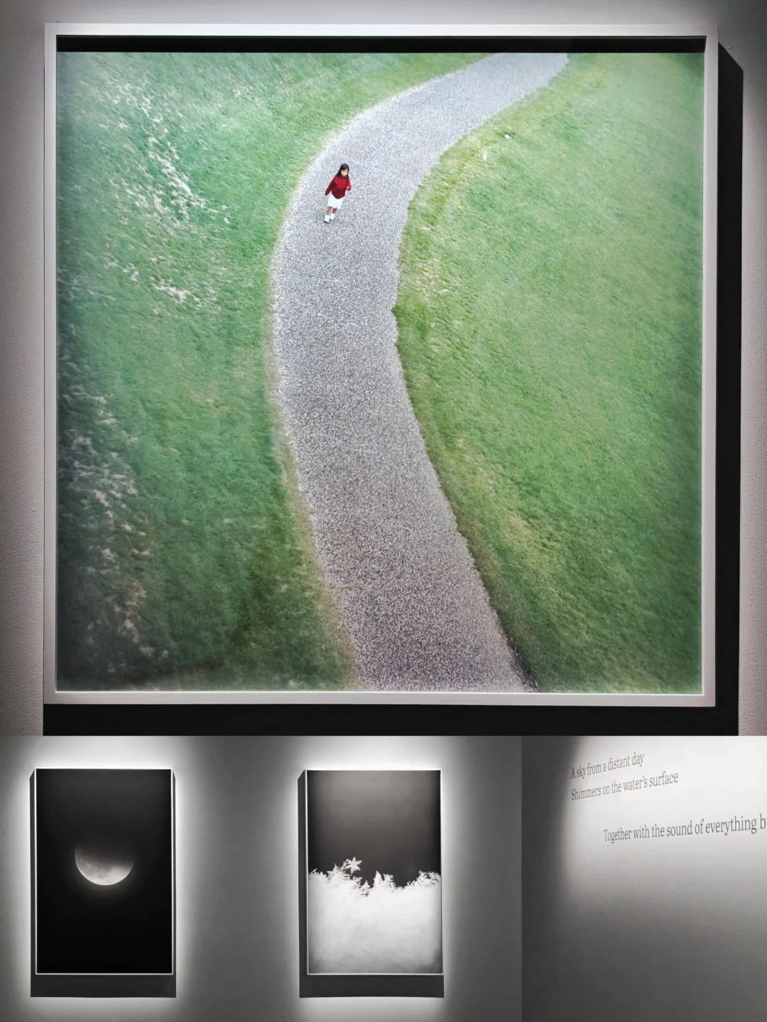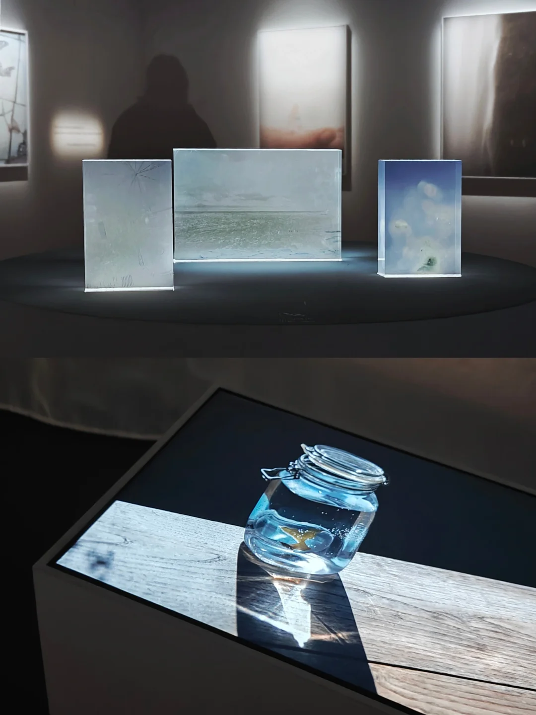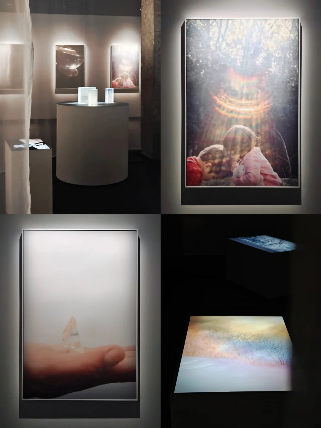 🔴亮点:展厅中心用半透明薄纱围合灯箱装置,复现摄影师在冰岛洞穴中“被地球包裹”的体验。部分作品采用俯视角度(如露珠、沙粒),强化观众与影像的“共时性”感知