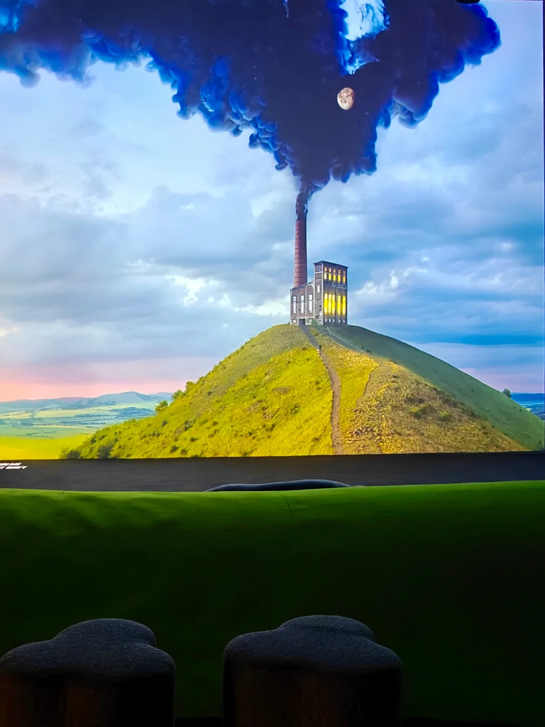 沉浸式展陈设计,展厅中央大片仿真草坪装置以及座椅设置,部分作品分时段呈现,增强观众的动态感知
