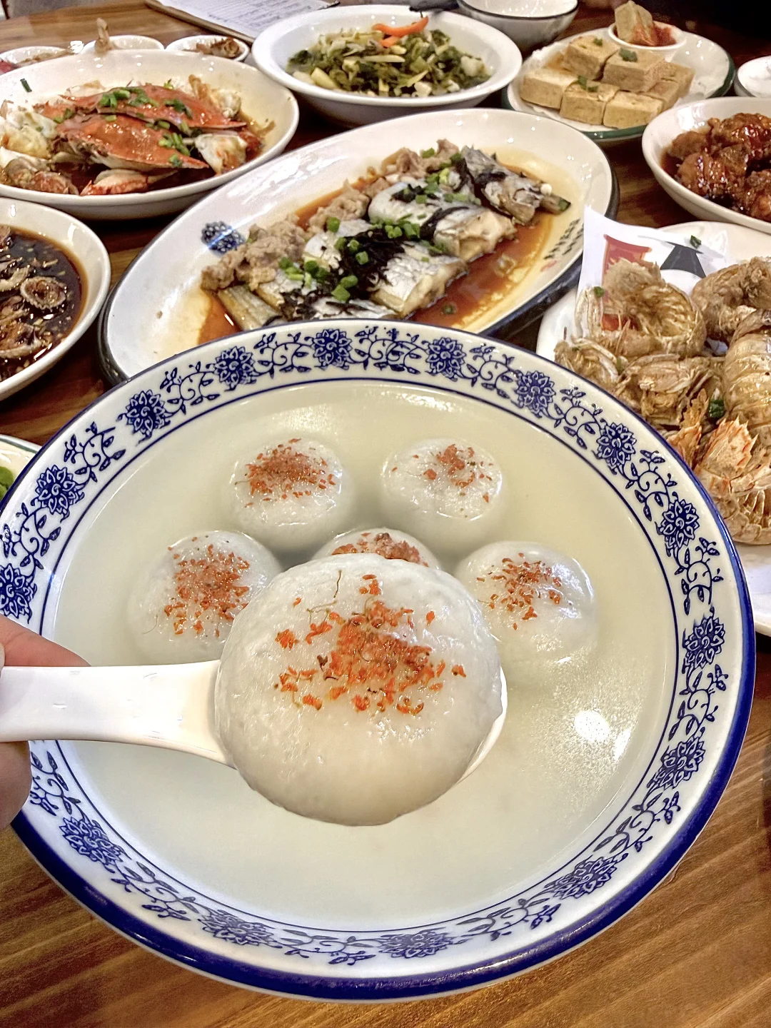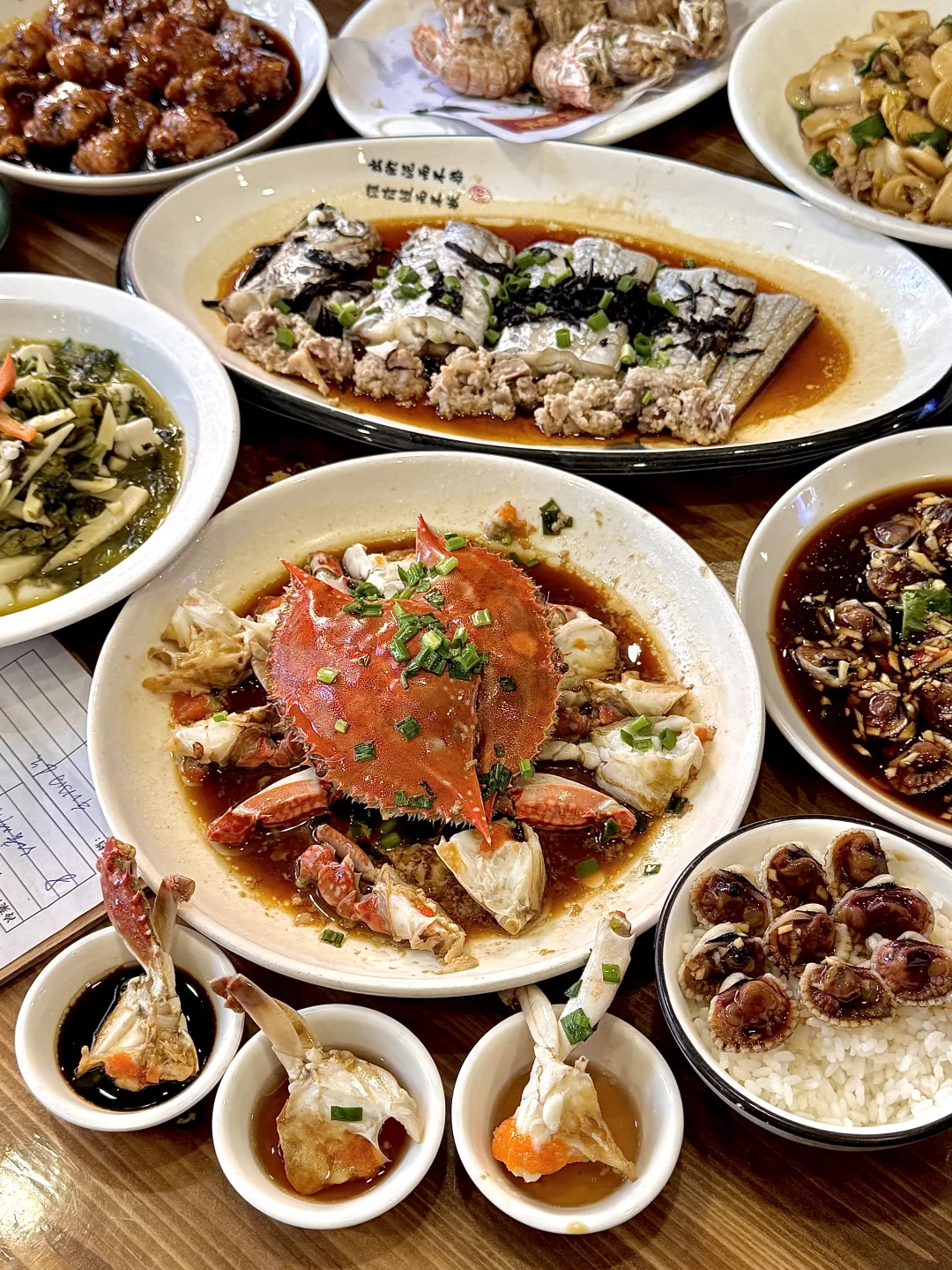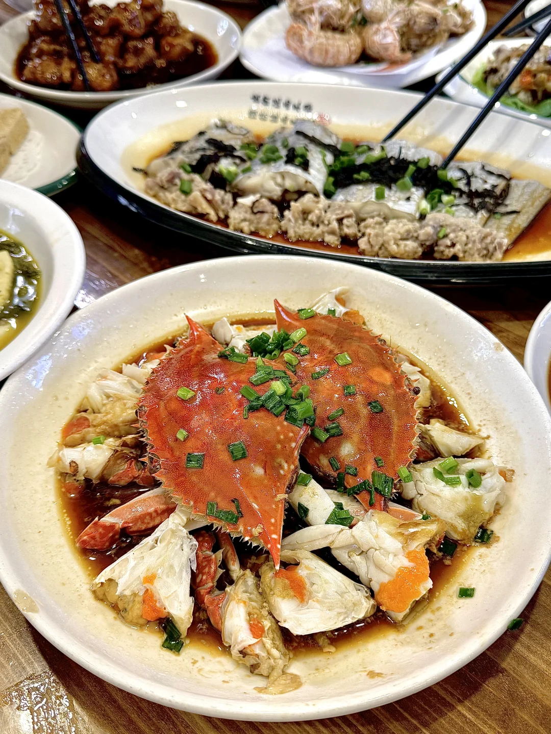 一家宁波很老的店了,很有烟火气!人气很高! 明档点菜就是菜都摆在面前,想吃什么就点什么,很多都是宁波特有的菜,小海鲜都很新鲜! 葱油梭子蟹🦀真的很肥,也只有浙江人能懂这份又滑又鲜的梭子蟹快乐🎉吧!蘸酱油或醋都很不错👍 还有清蒸鲜带鱼,都是大块带鱼比手掌厚,旁边还有肉丸吃起来那叫个嫩!椒盐皮皮虾,雪蛤这都是宁波特色,大颗的宁波汤圆一咬都爆汁很好吃的,来宁波旅游必吃啊