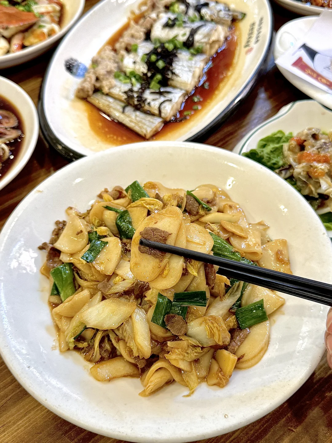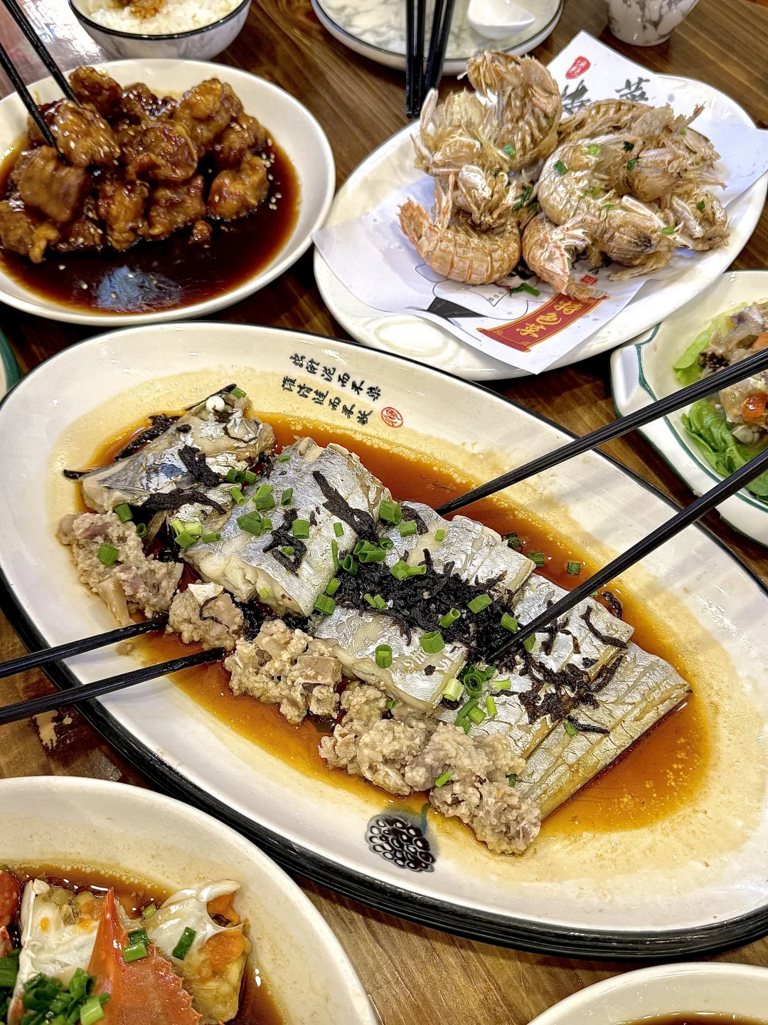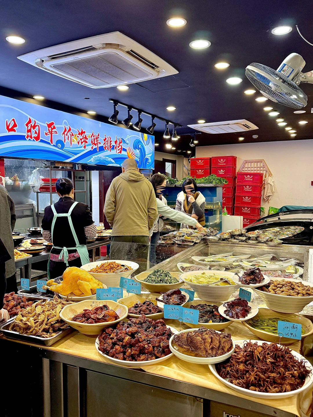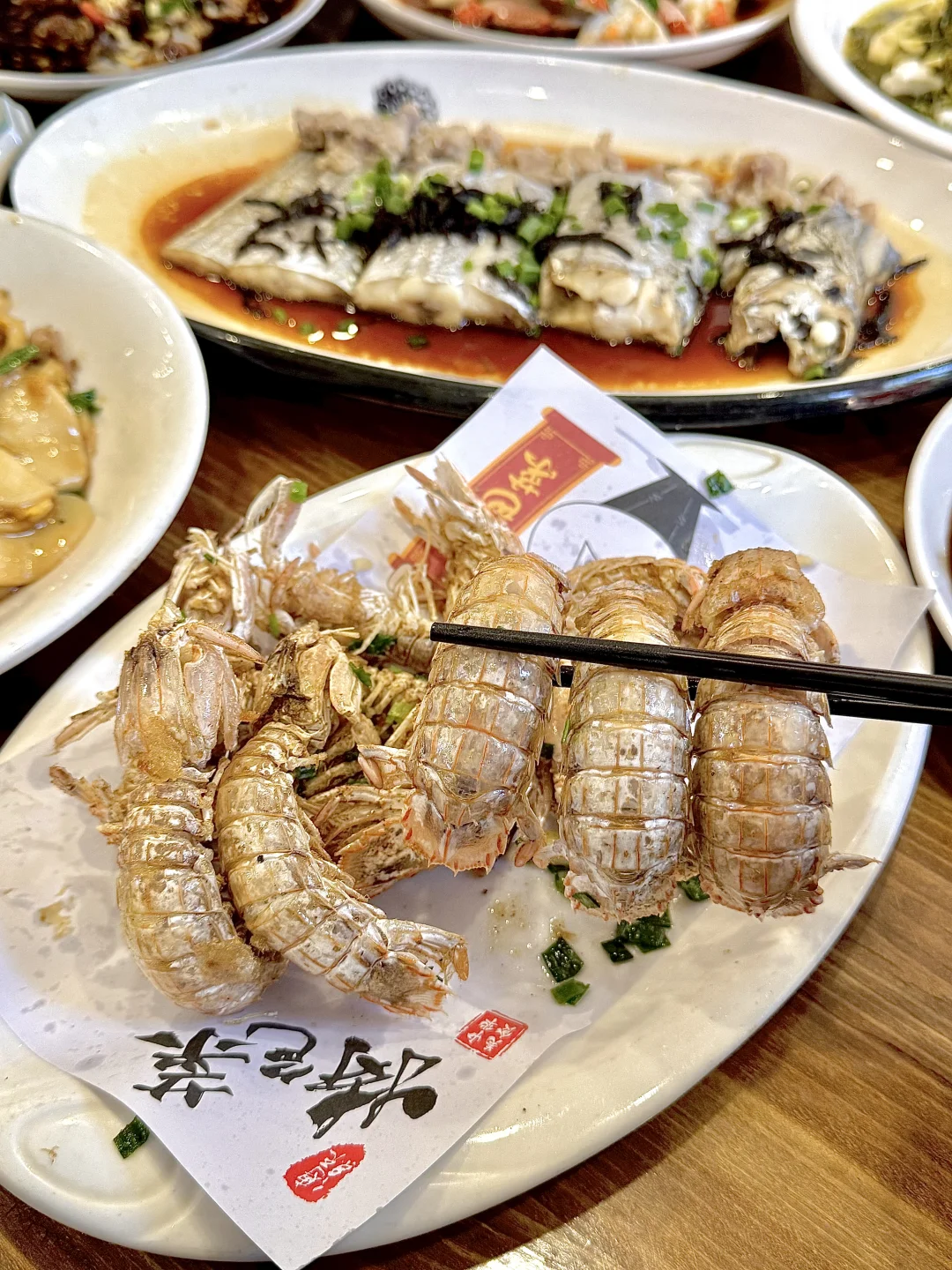 一家宁波很老的店了,很有烟火气!人气很高! 明档点菜就是菜都摆在面前,想吃什么就点什么,很多都是宁波特有的菜,小海鲜都很新鲜! 葱油梭子蟹🦀真的很肥,也只有浙江人能懂这份又滑又鲜的梭子蟹快乐🎉吧!蘸酱油或醋都很不错👍 还有清蒸鲜带鱼,都是大块带鱼比手掌厚,旁边还有肉丸吃起来那叫个嫩!椒盐皮皮虾,雪蛤这都是宁波特色,大颗的宁波汤圆一咬都爆汁很好吃的,来宁波旅游必吃啊