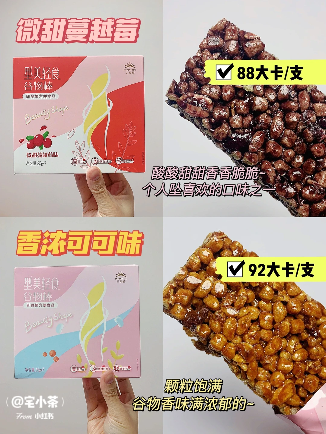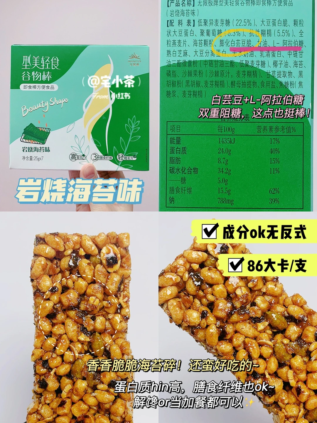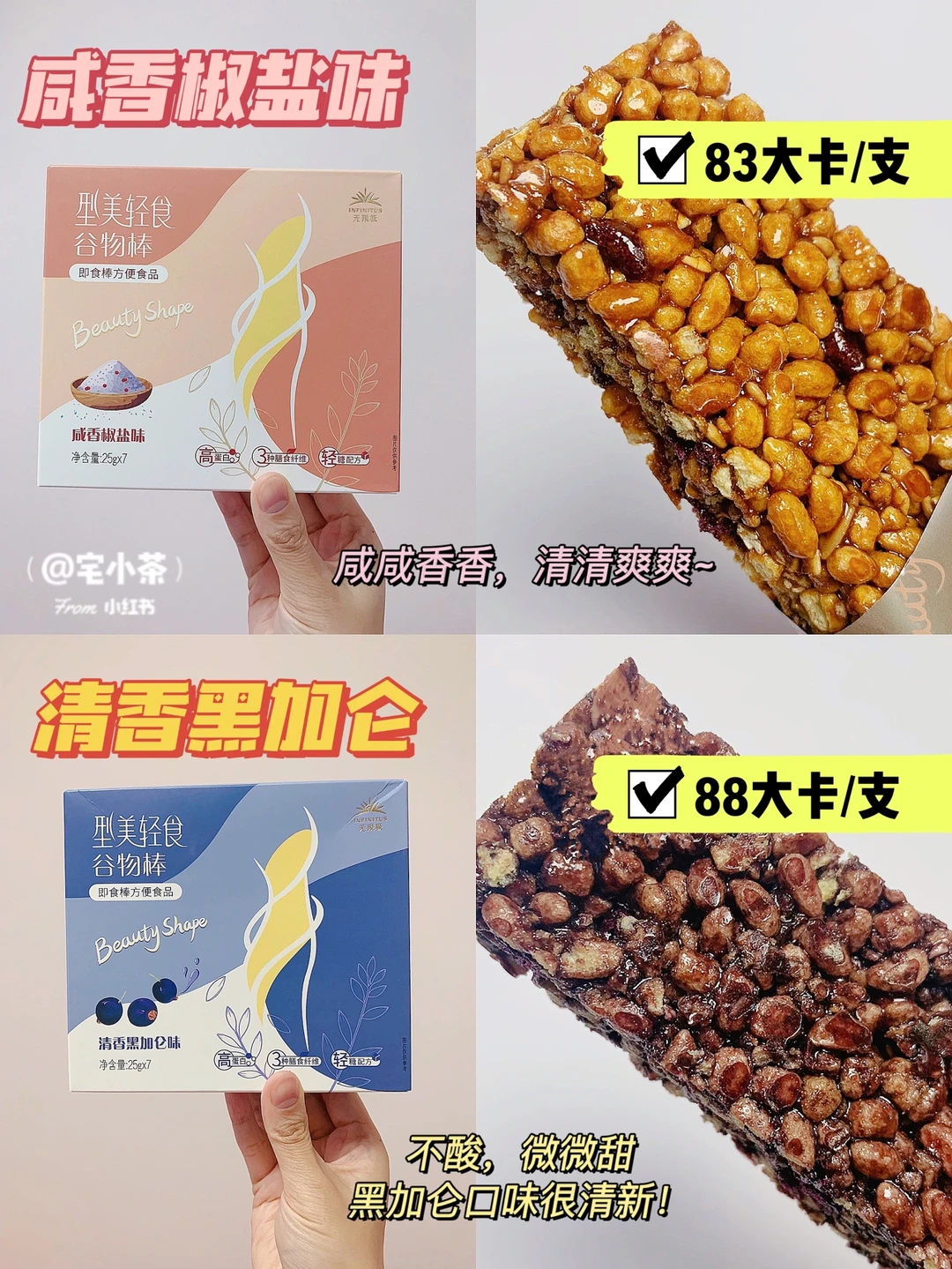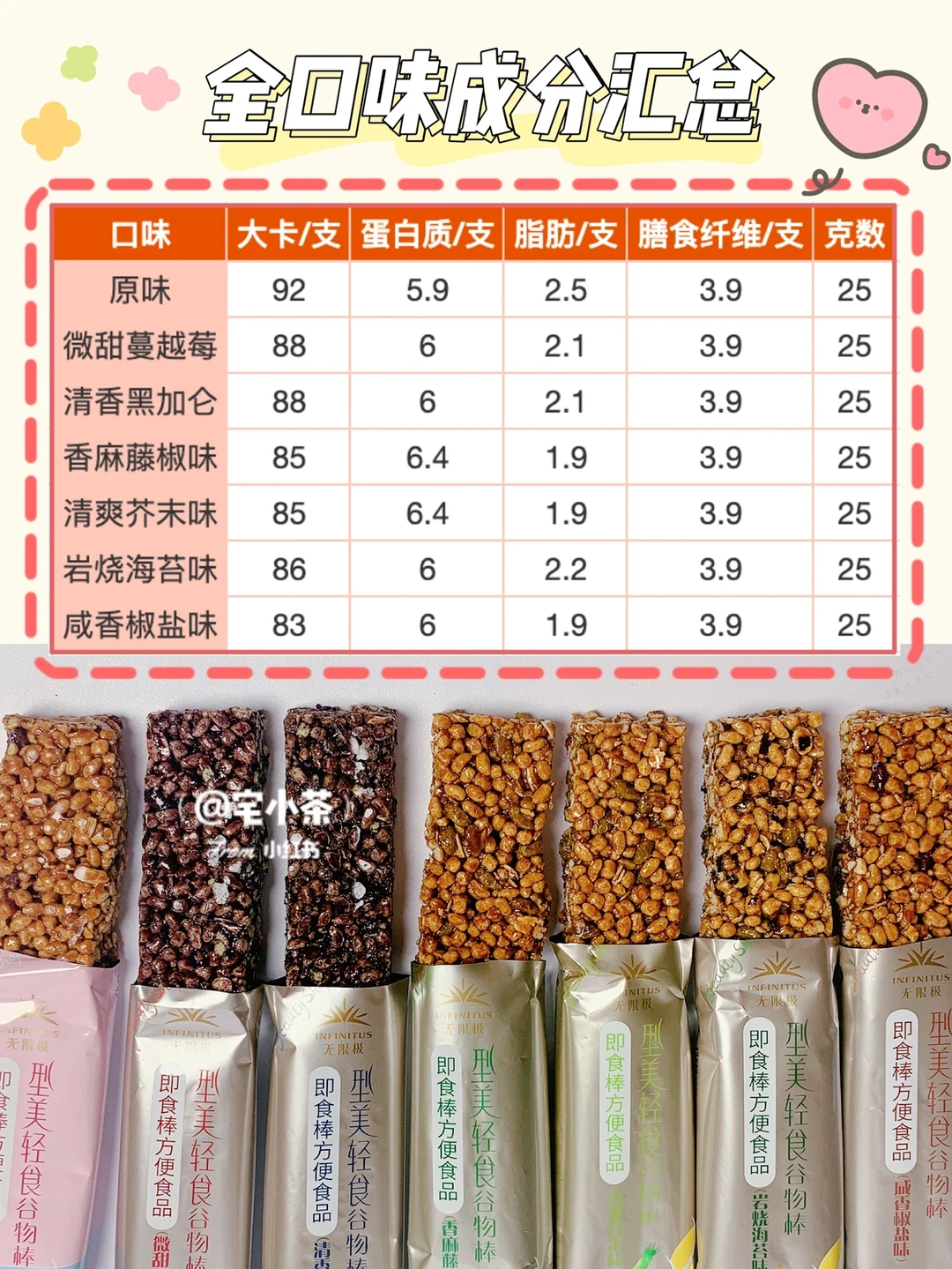 总的来说,他们家谷物棒每根卡路里控制在100以内,蛋白质hin高,膳食纤维也ok~解馋or当加餐都可以。