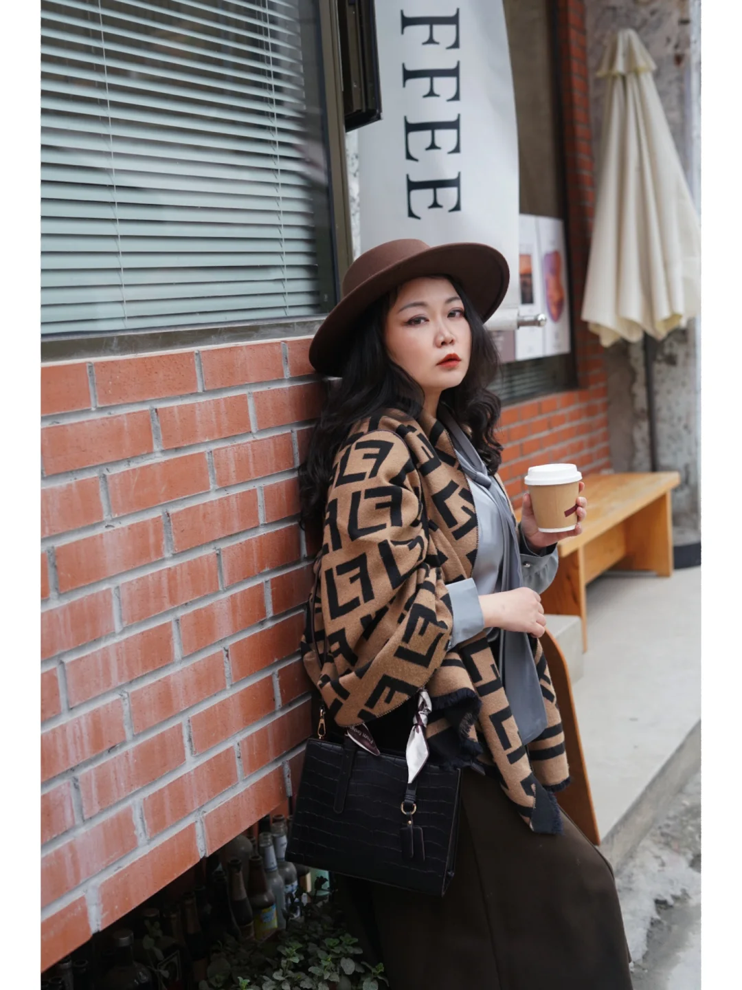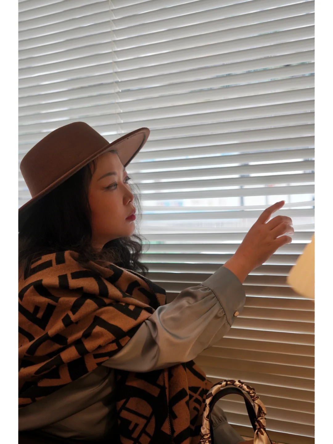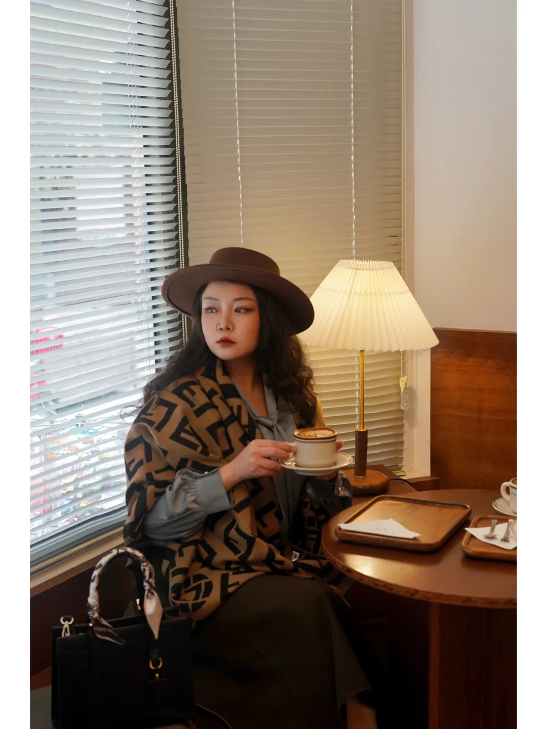 ①衣服🧥:整体大地色系,灰色真丝飘带衬衫+棕色A字长裙,搭配一条同色系的披肩是点睛之笔,优雅复古;