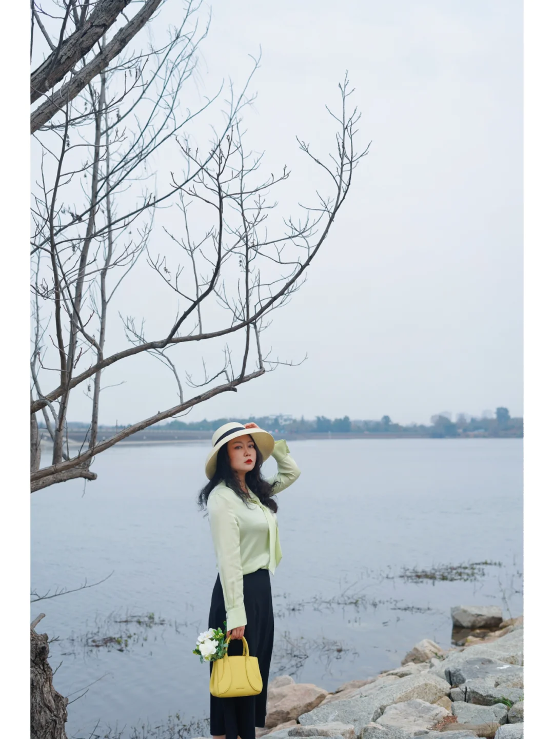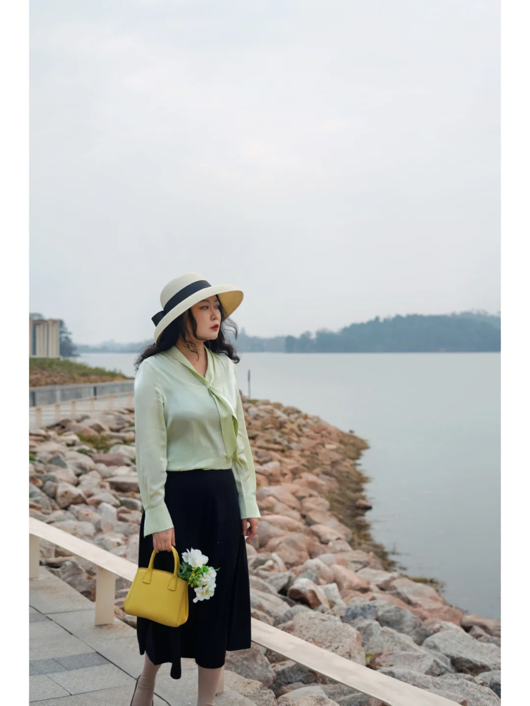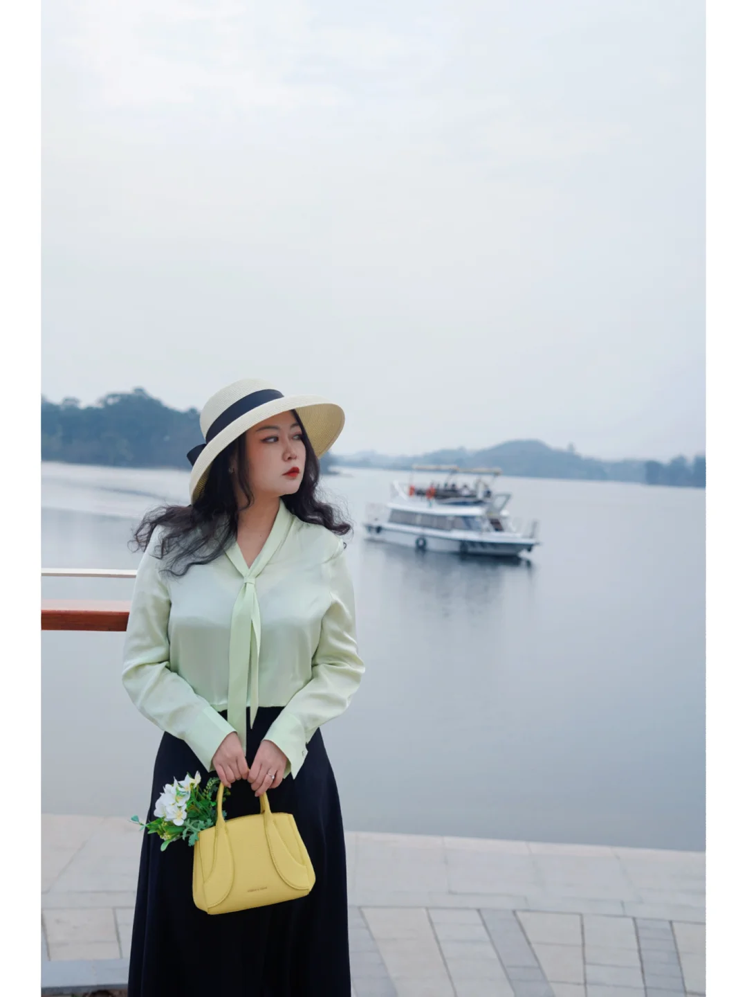 👜包:嫩黄色的手提包装上一束花花也很春天;