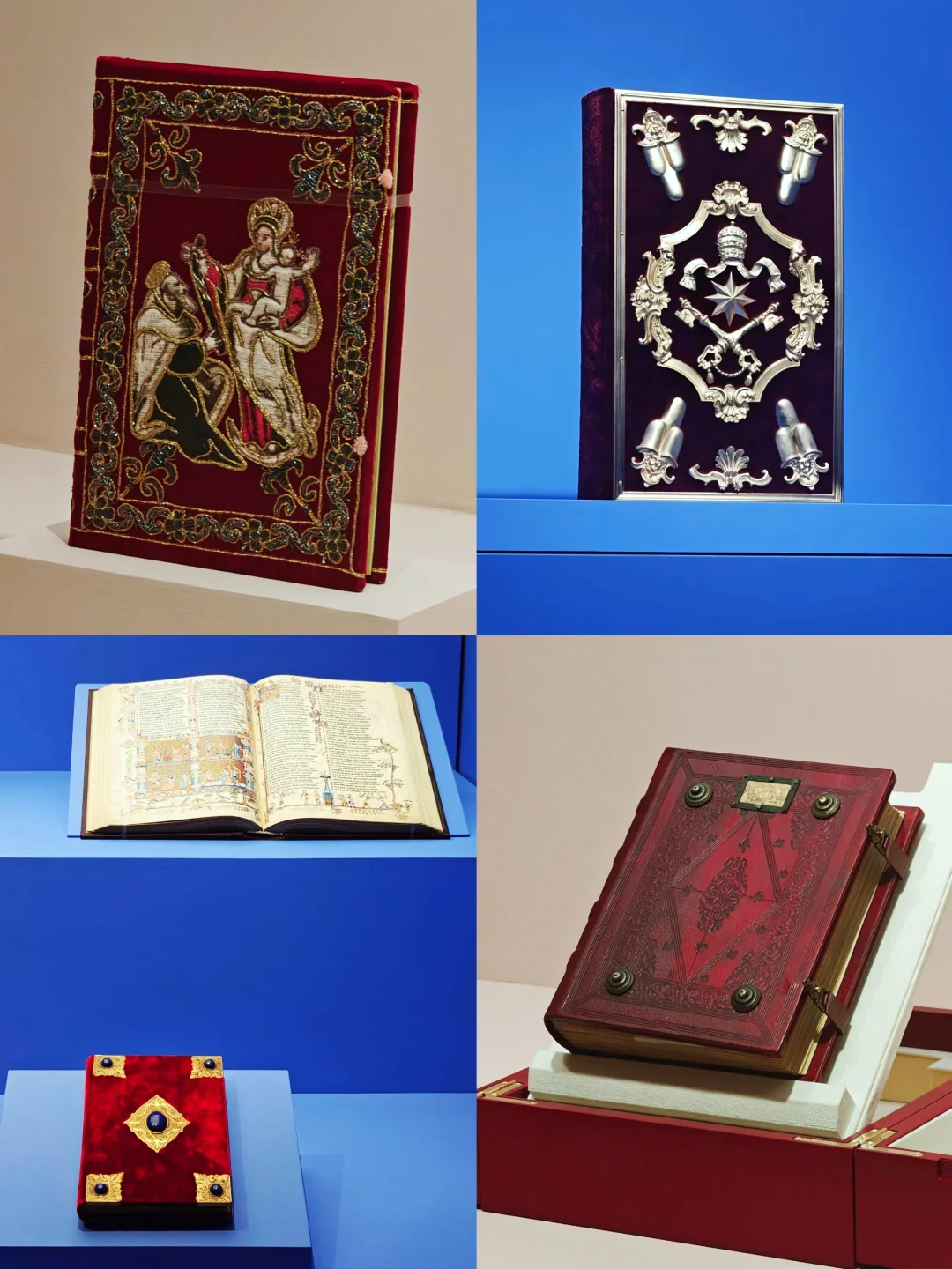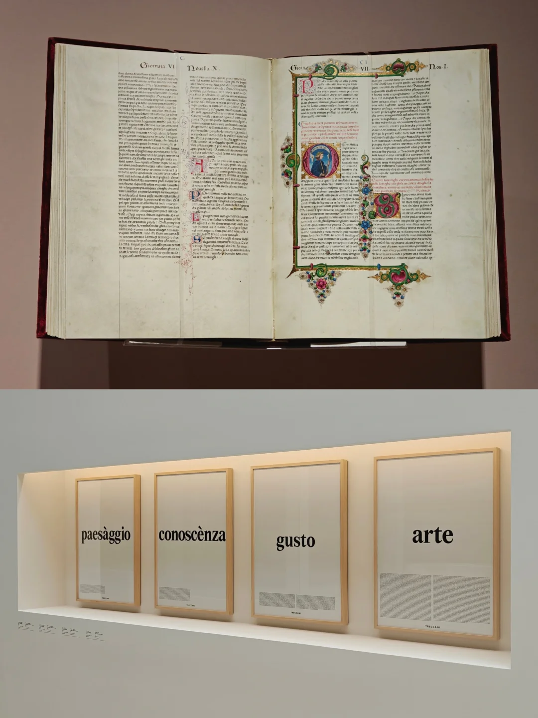中世纪10个世纪里,羊皮纸上的作品是美学宝库,却大多未被修复。特雷卡尼致力于研究、修复并数字化传播相关艺术。展览展出多件特雷卡尼制作的,根据散落于世界各地的珍贵古籍制作的精美仿真件。