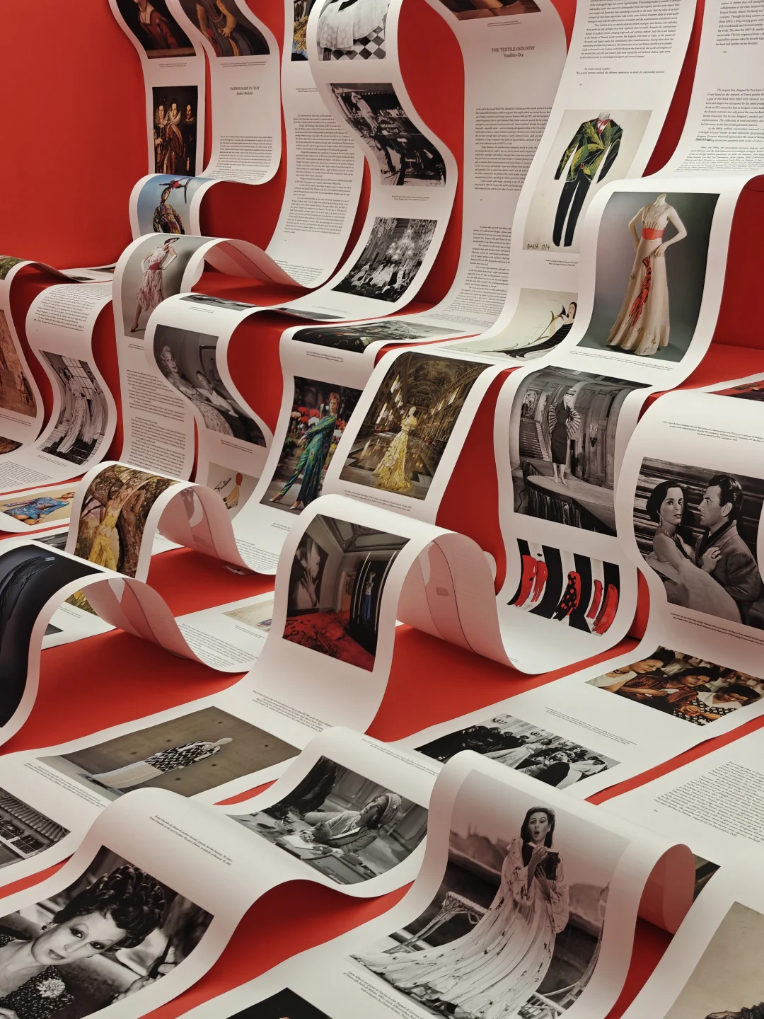 全球限量150本的典藏书籍《梦想的着装:意大利服饰文化》在本次展览首度亮相,以红色天鹅绒制作封面封底,饰以由意大利艺匠手工金线刺绣的文艺复兴时期纹样,内页沿则袭意大利出版业传统的印刷和装帧技艺。