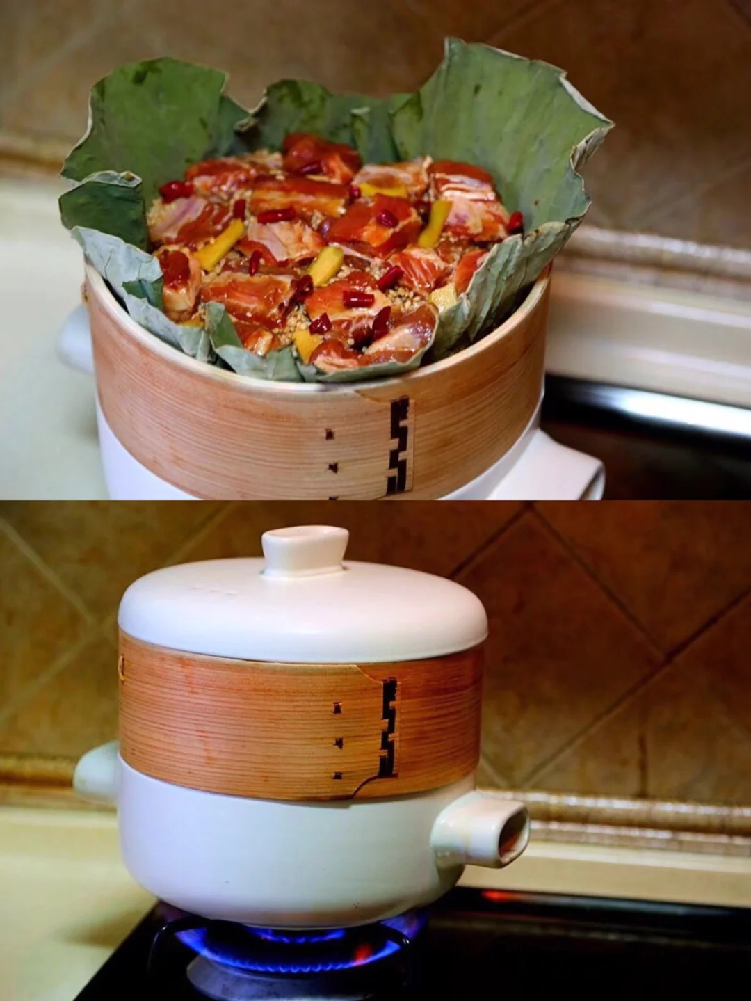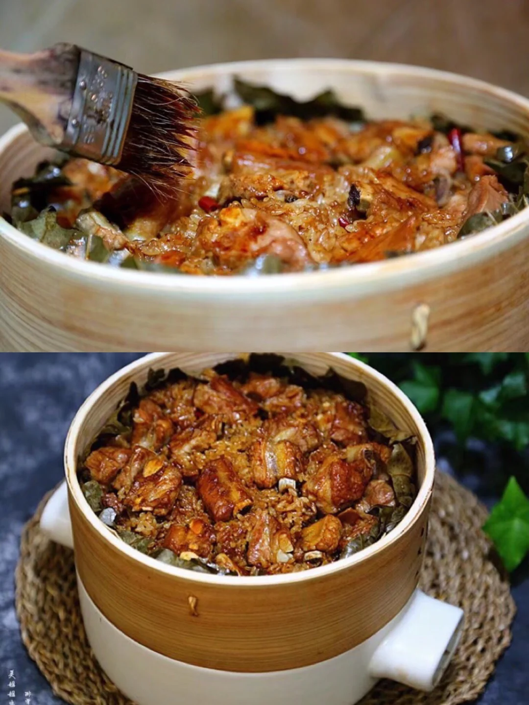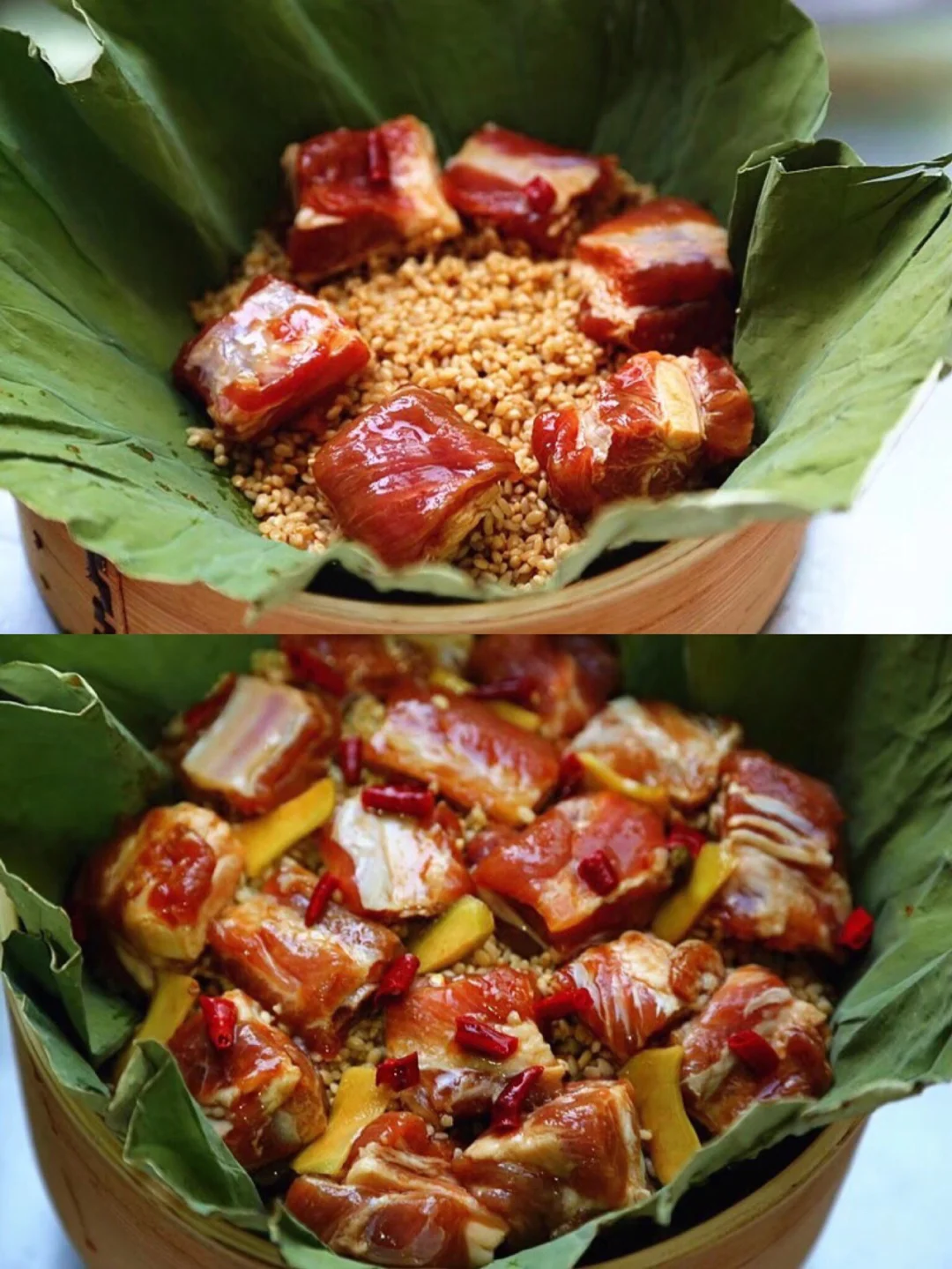 9.露出来荷叶的部分用牙签缝起来 盖在肉上 10.大火开蒸大概一个小时左右吧