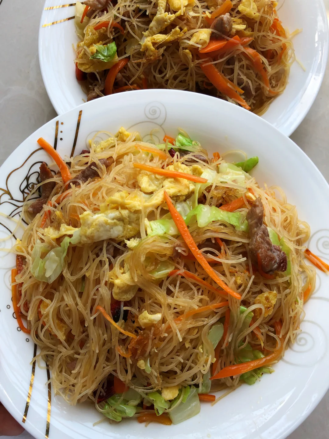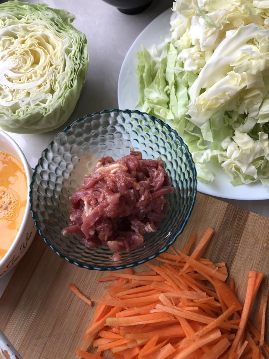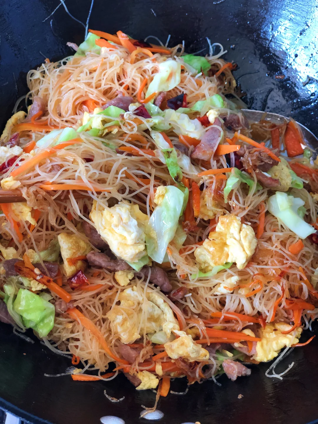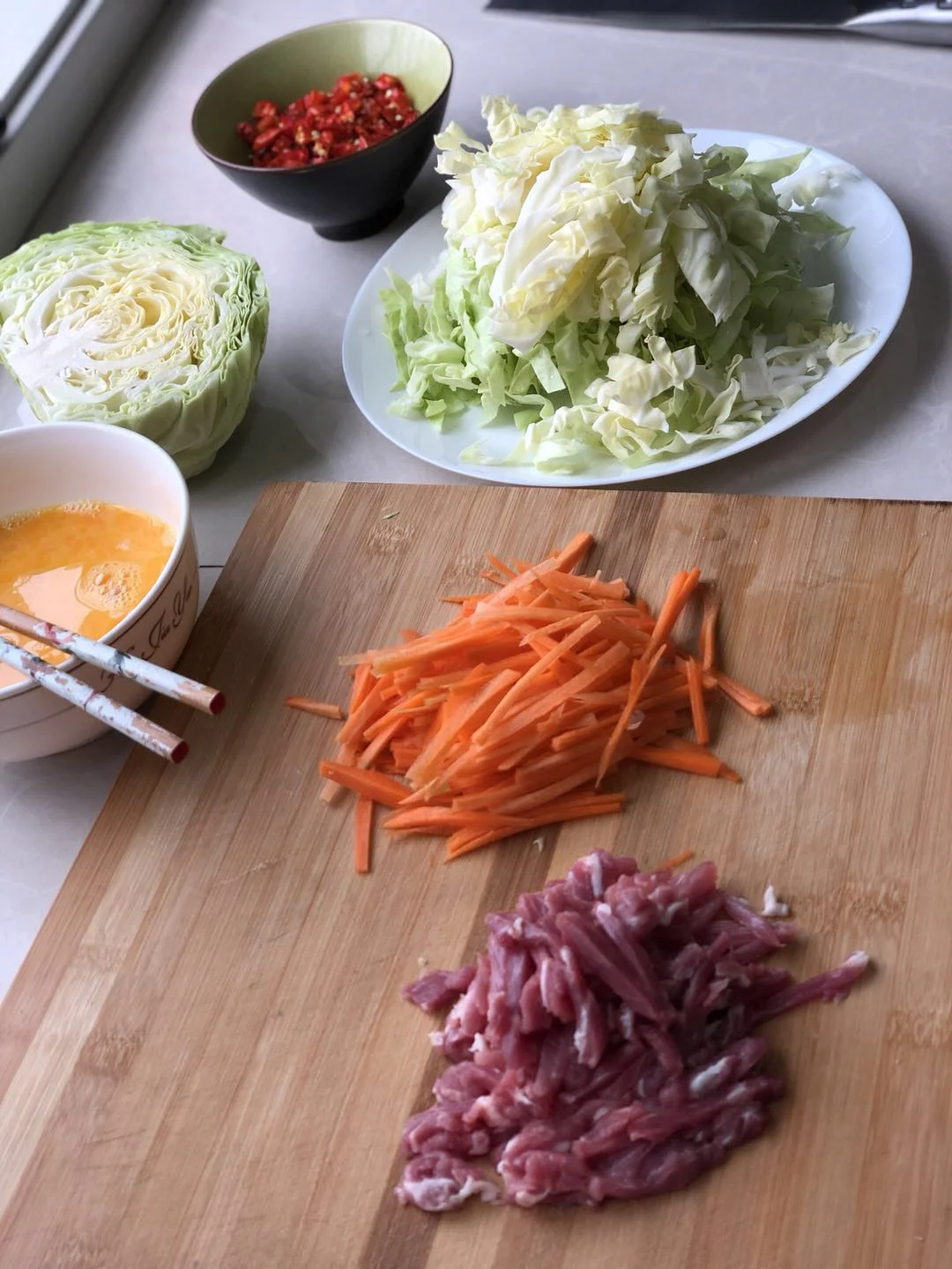你们炒粉干都喜欢放什么配菜啊[害羞R]今天放了包菜,肉丝儿【腌制了一下】胡萝卜丝儿,鸡蛋,这几天天气也太热了,随便炒一盘好吃省事儿,估计你们也不想下厨房,中午吃的啥捏