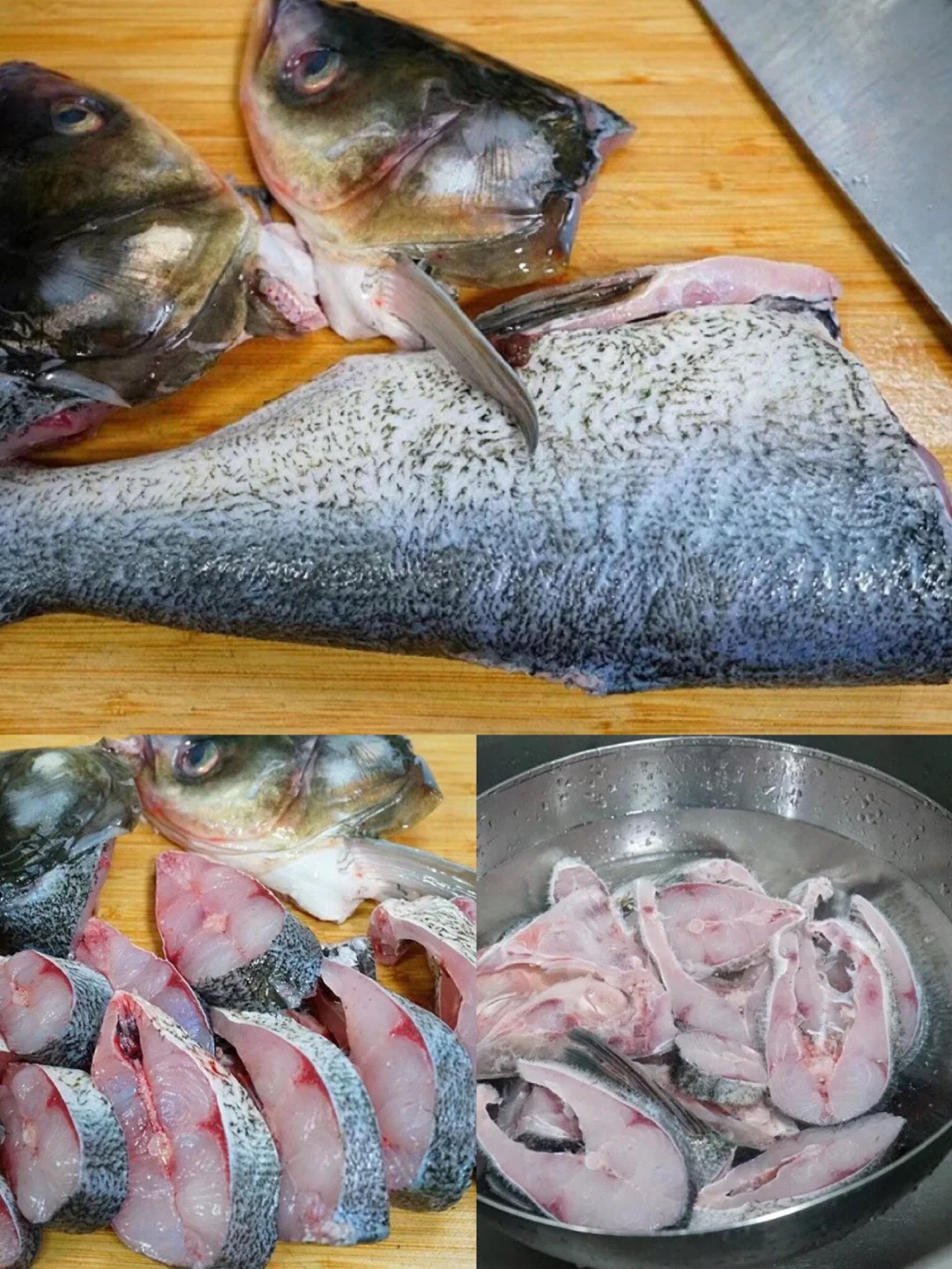 1.准备草鱼一条,那天有事情耽误到下午六点才去买菜 结果草鱼没有得卖了 只好买了条花鲢回来 清洗干净,头剁下来切开,鱼肚子不要全部剖完 2.鱼身体切成稍微厚一点的段