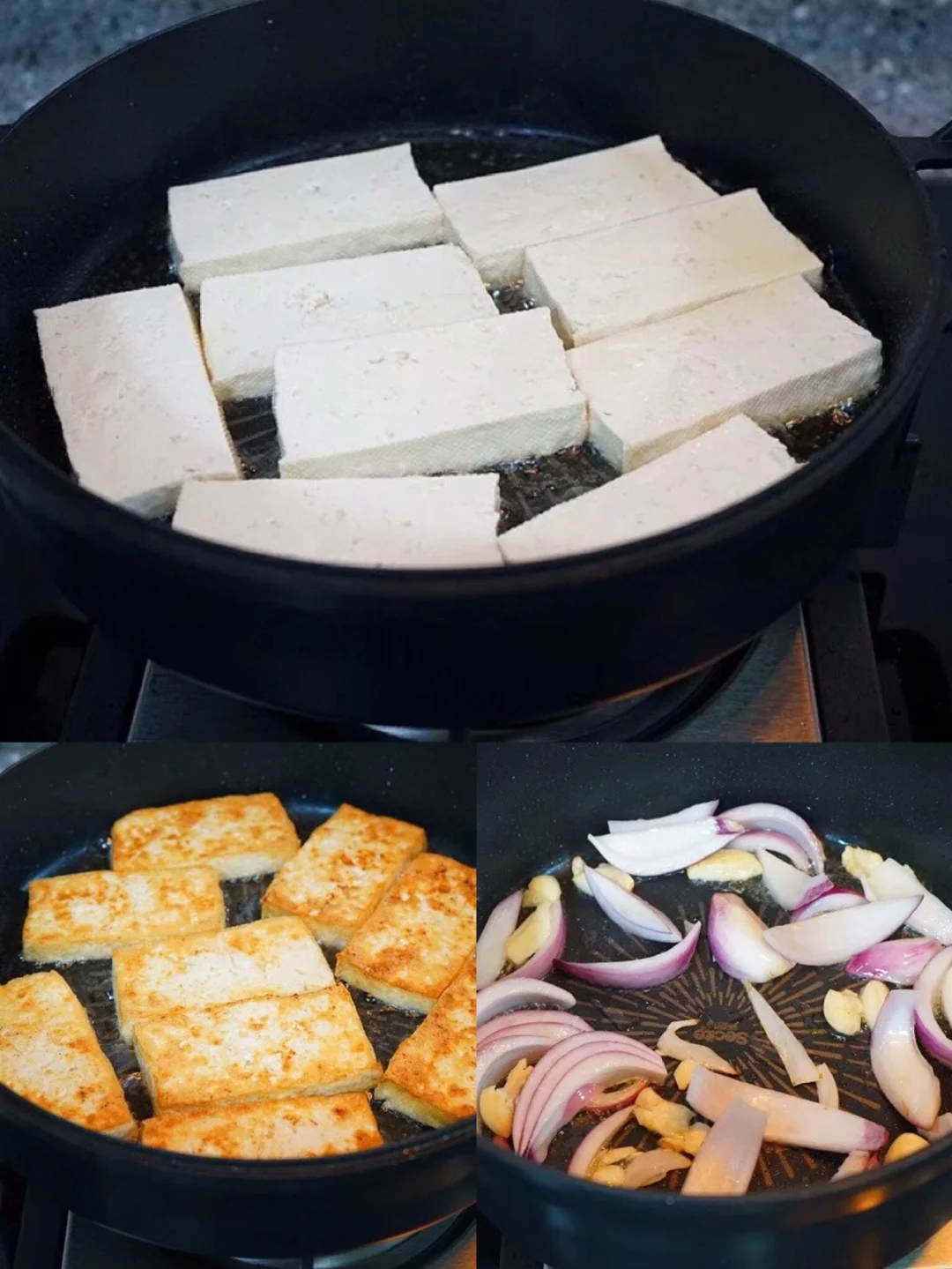 8.平底锅里放少许油,烧热之后切好的豆腐片铺上去 中小火慢慢煎