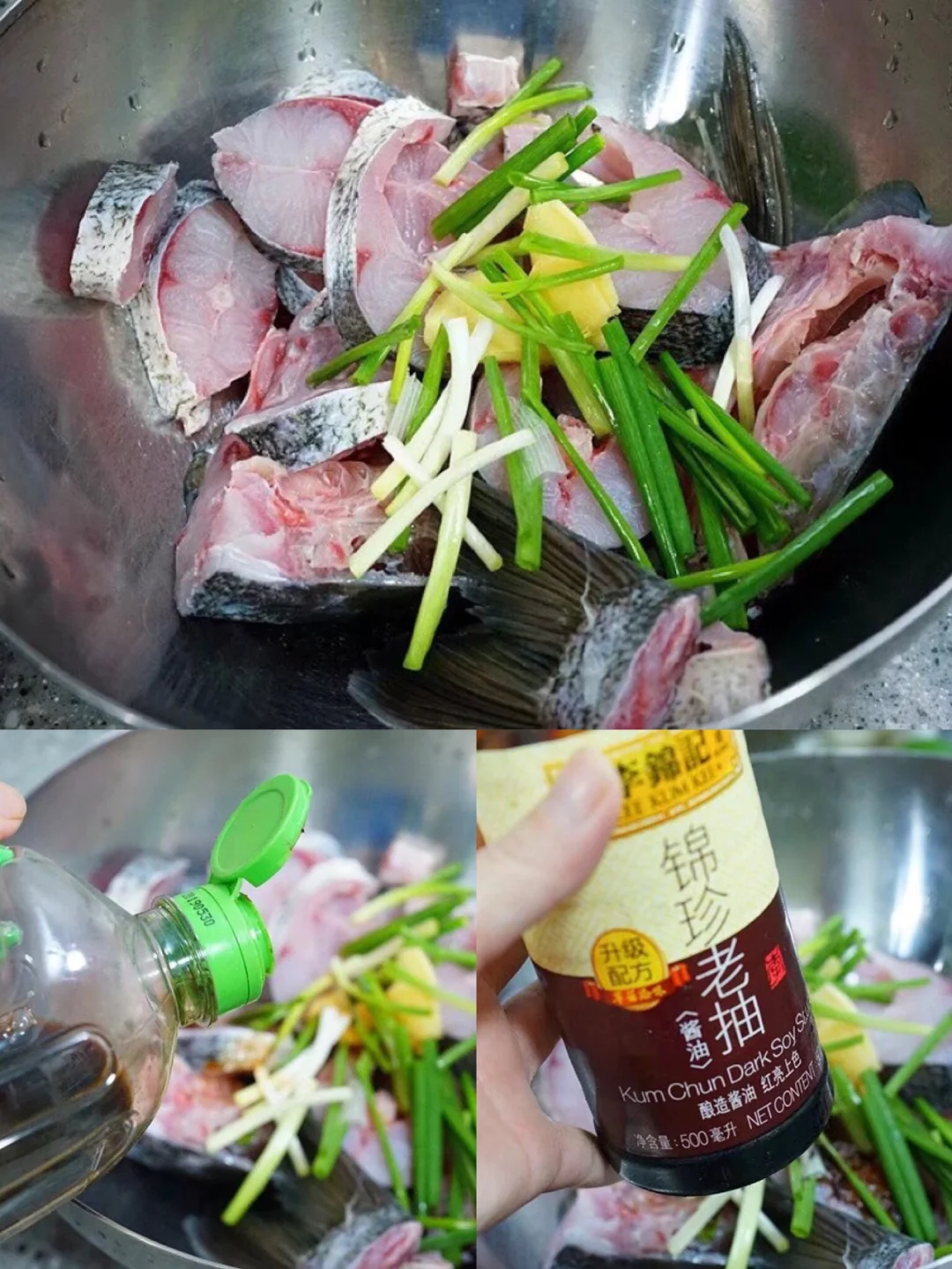 4.沥干水,鱼肉加入葱段,姜片儿