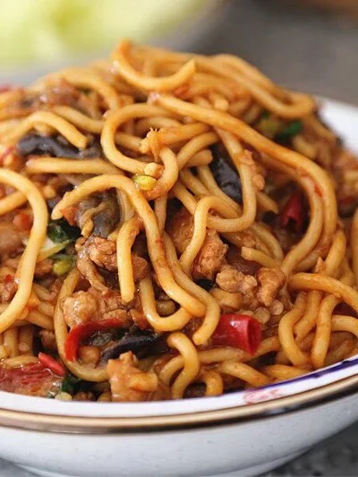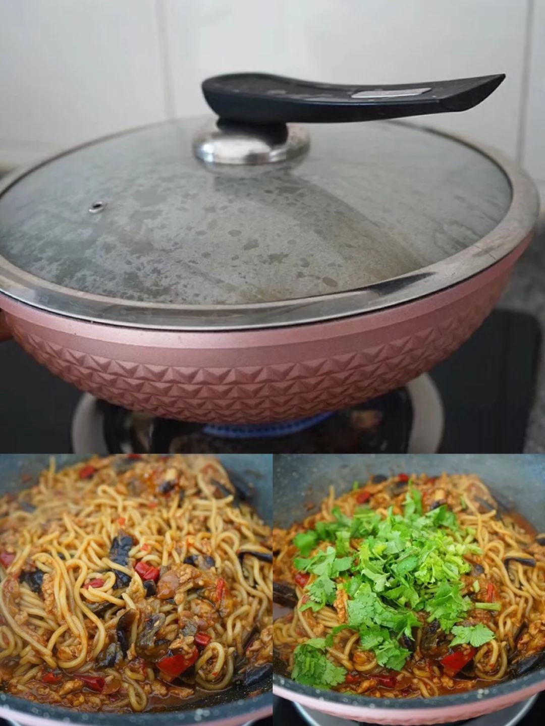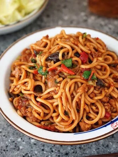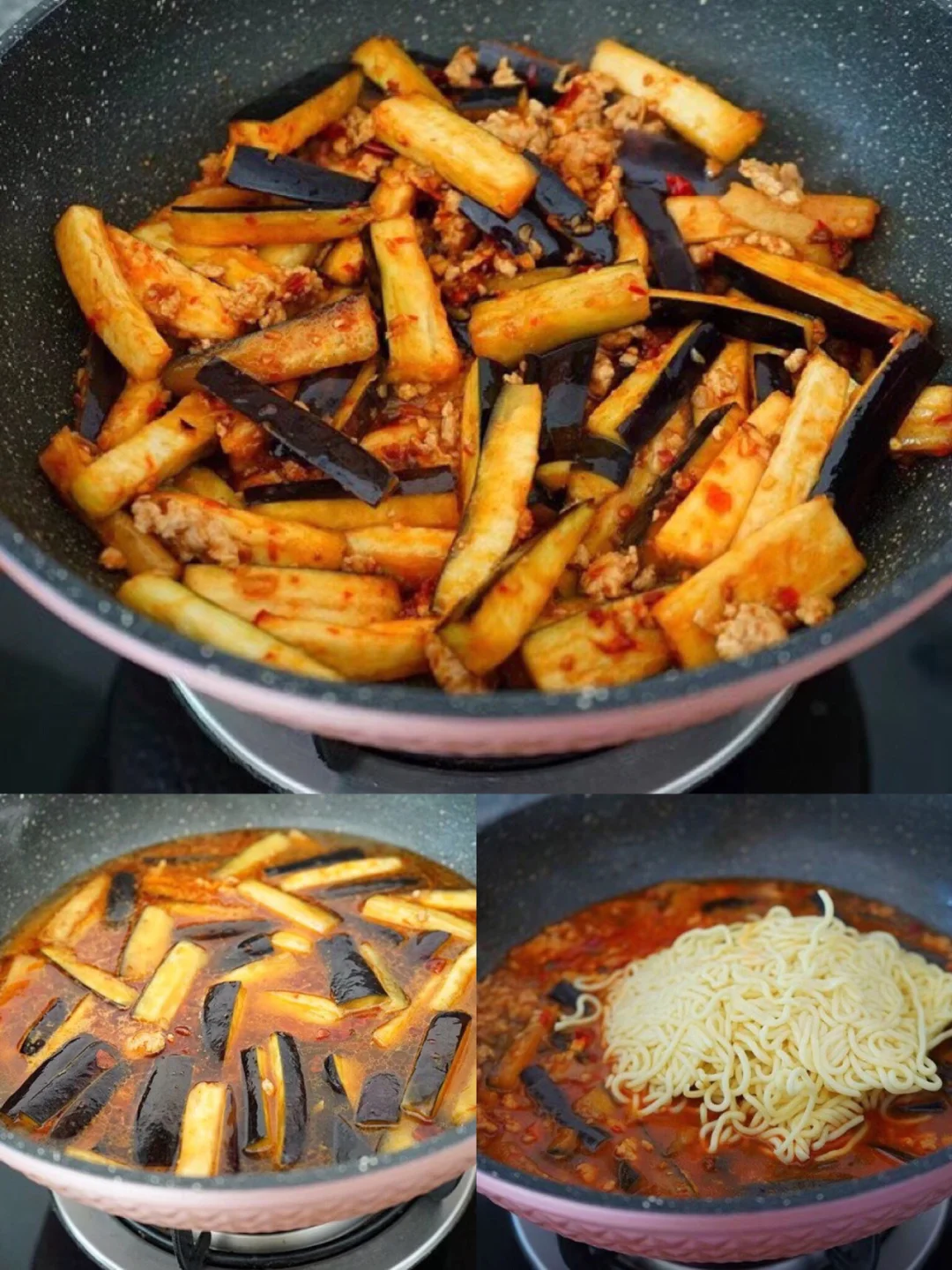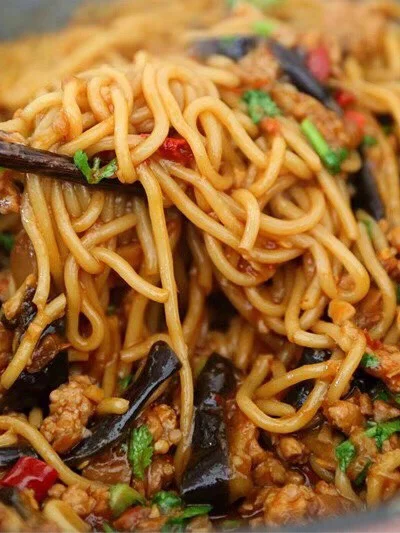 12.转小火翻炒至出红油,茄子也有点变软了 13.加入没过茄子的热水,如果茄子块比较大的话水要适量多一丢丢,不然茄子焖不烂,口感就不好了 14.汤汁差不多三分之一多一丢丢的时候面丢进去 【面是直接买的炒面那种,你们菜市场或者超市一般的都行】 用筷子搅散尽量埋在汤里面