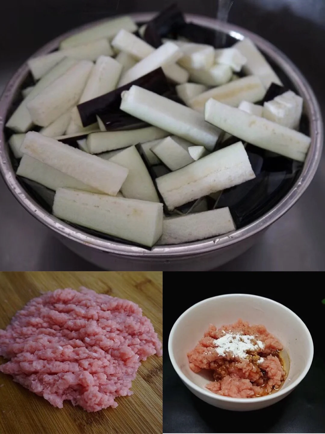 1.茄子切成这样均匀的长段,然后泡在一个大一点的容器内,加适量盐泡一会儿 防止变黑