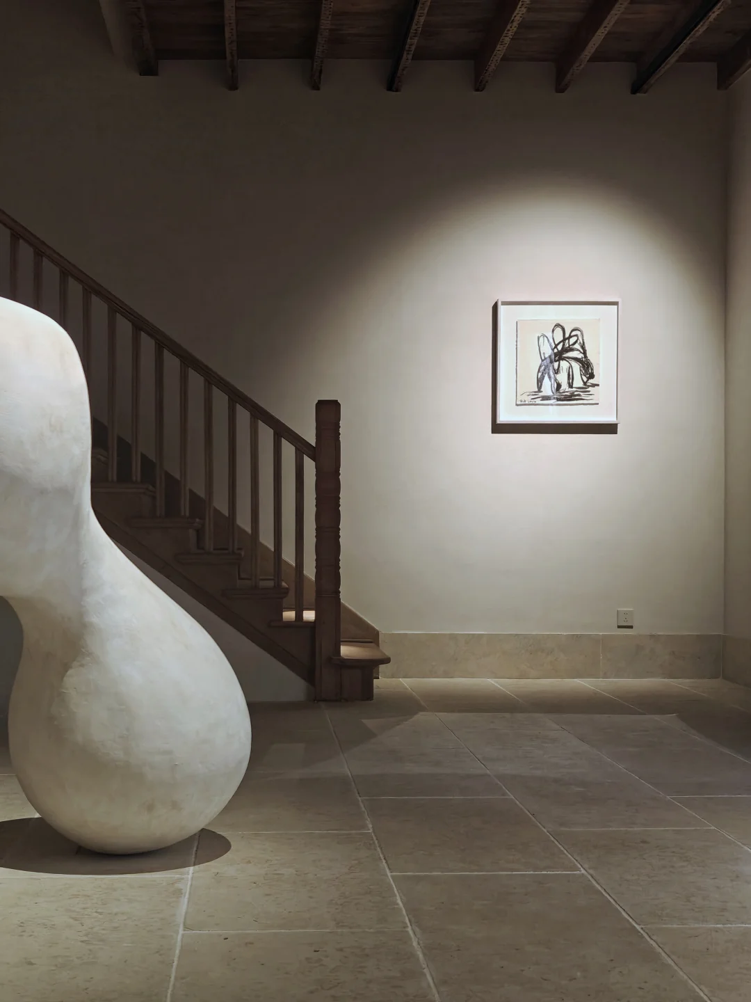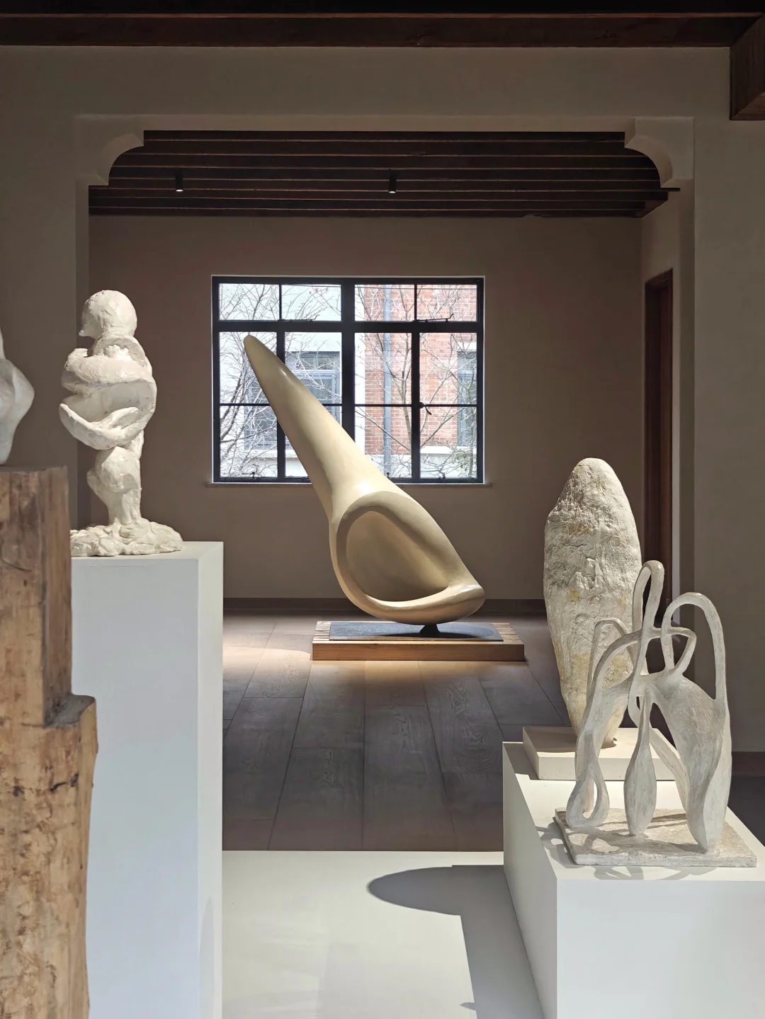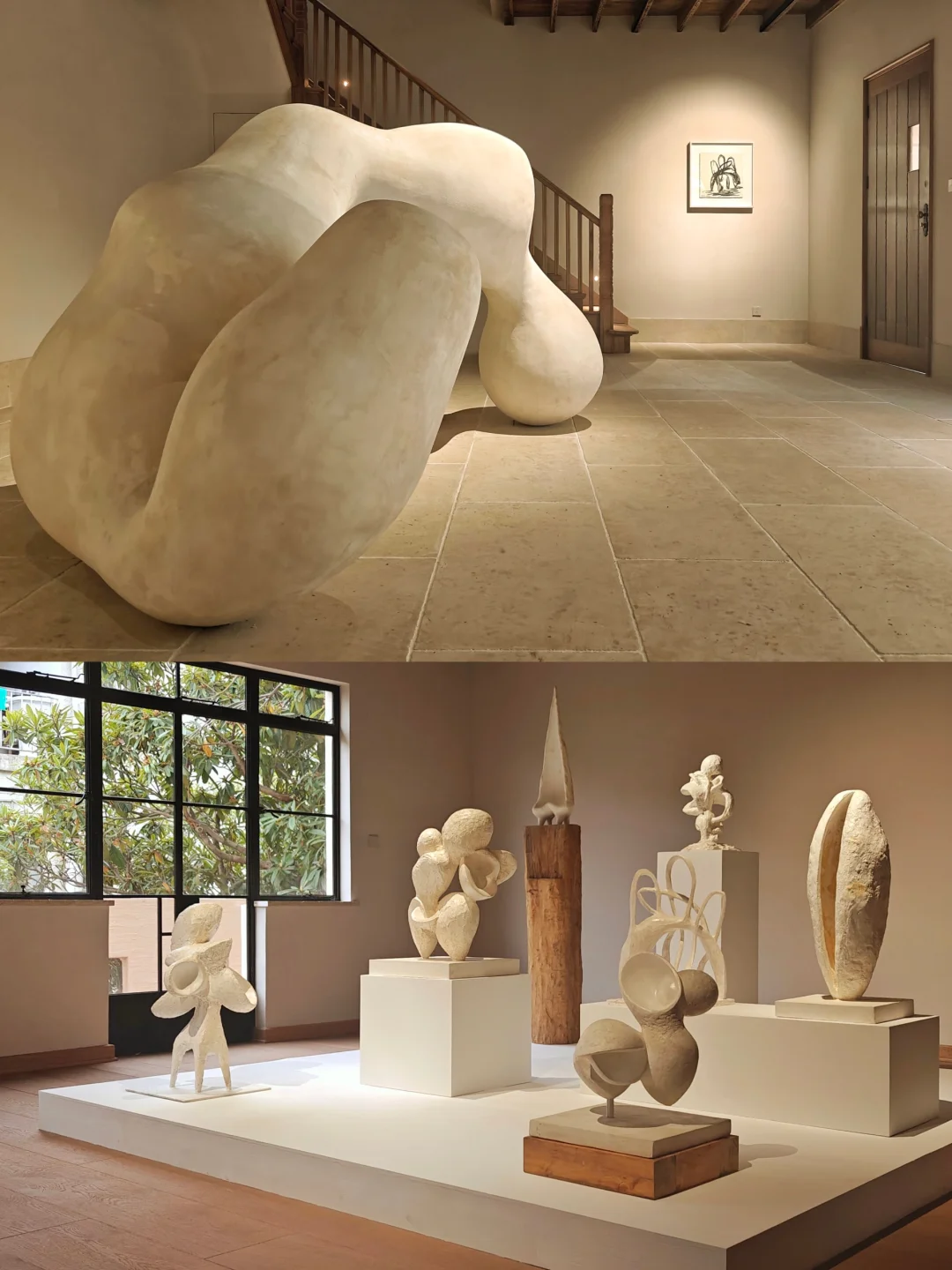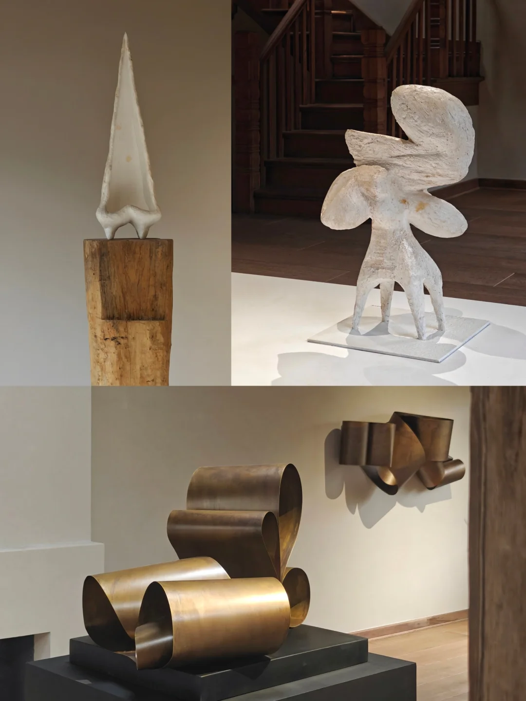 👉似乎从简洁又带有历史感的空间中,生长出有体量感的自然风格单色极简抽象雕塑。布展很克制,没有任何“多余”的东西,疏密得当,气场很和谐。