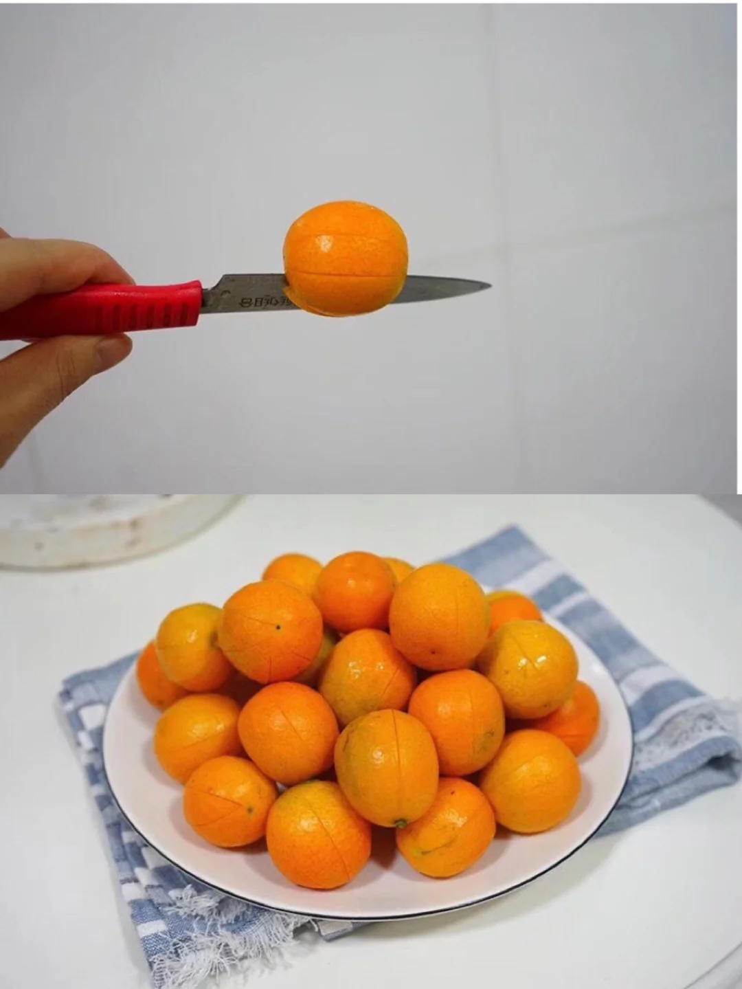 3.用水果刀沿着金橘一圈儿划口子,口子之间的距离要均等 而且不需要划得太深 不然等会儿煮的时候皮掉出来就不好看了