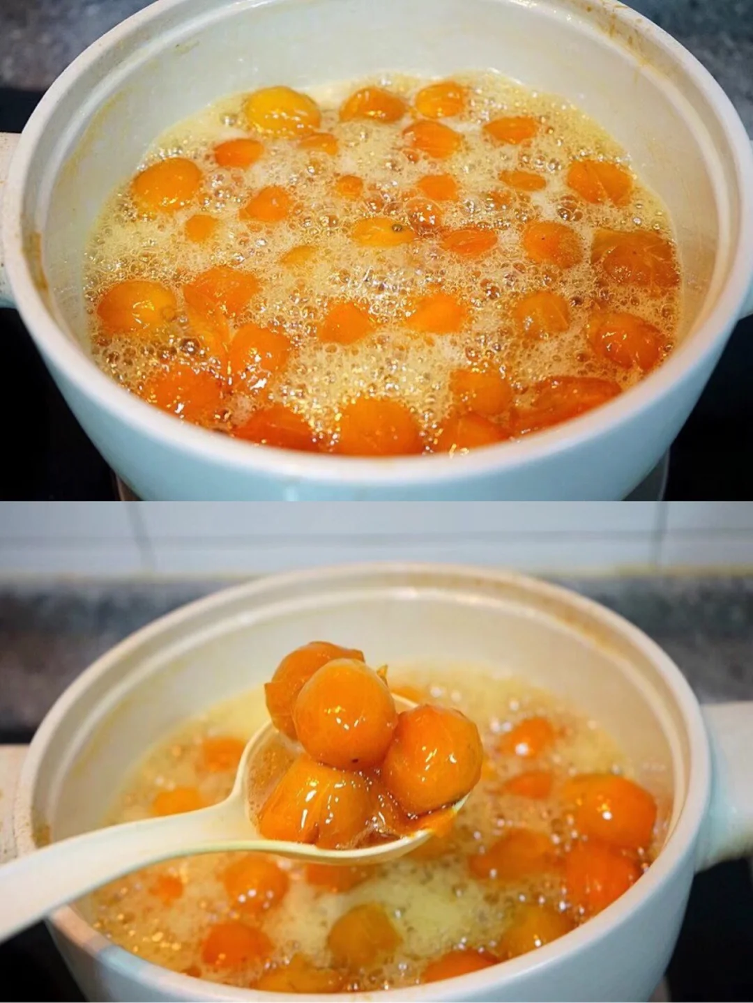 8.哈哈,可以留一些糖汁,差不多这样就好啦,一个个晶莹剔透 满屋子弥漫着橘香