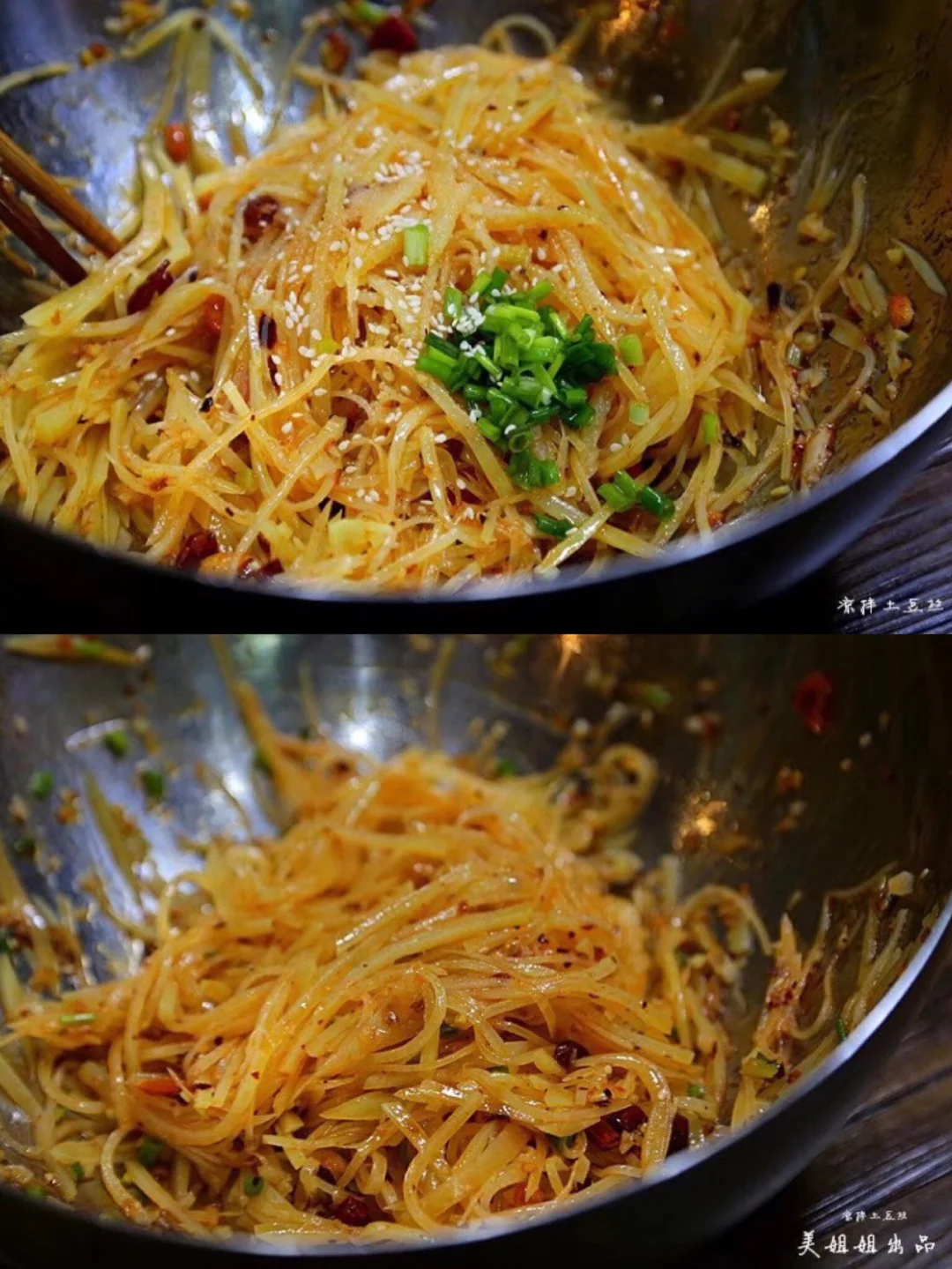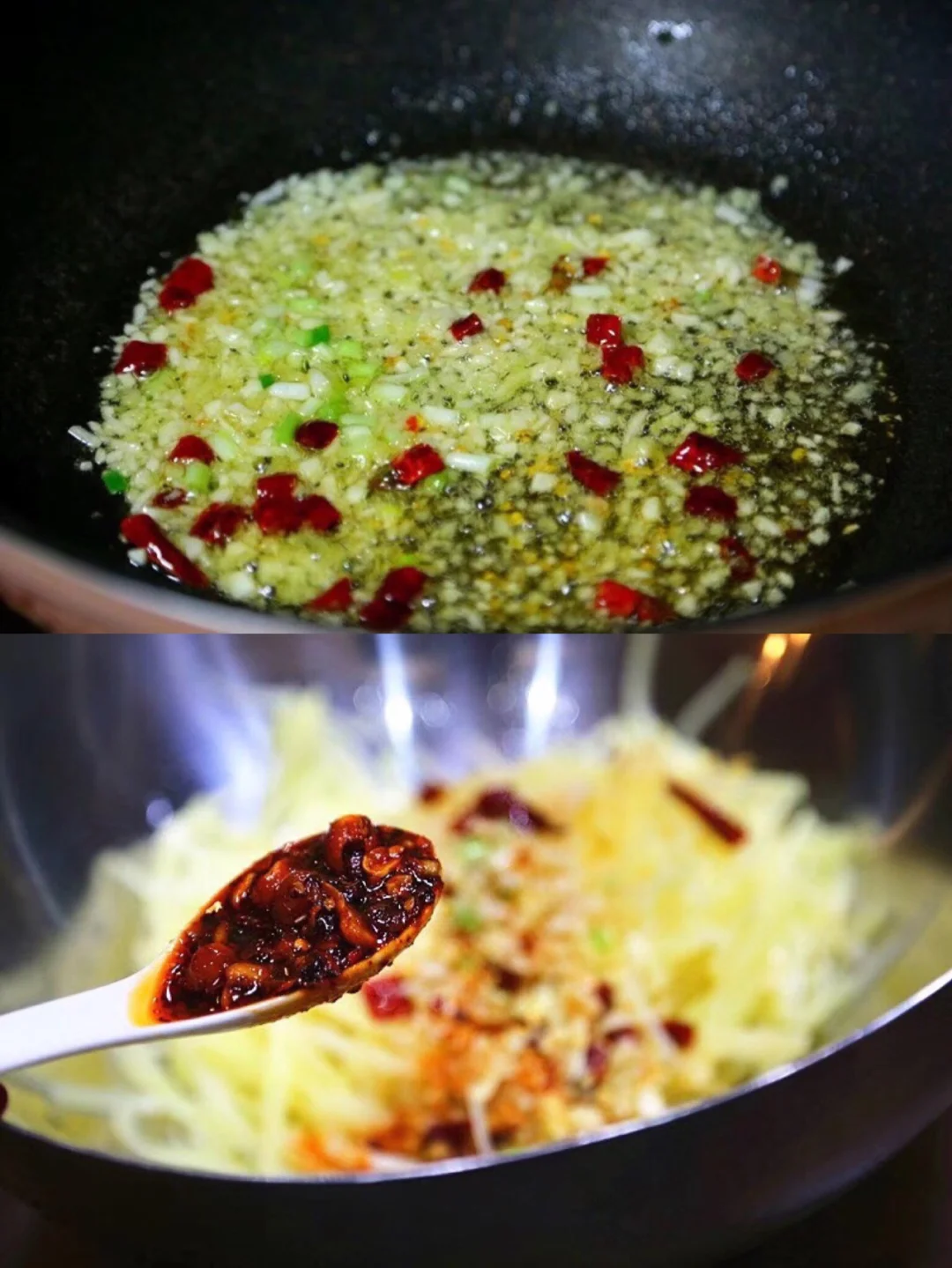锅里上油,小火加热,倒入大蒜生姜沫爆香,还放了点葱白段 喜欢辣的人加入一些干辣椒 慢慢炒香 6.泡好的土豆丝彻底沥干水分 炒好的大蒜生姜末倒入到土豆丝上面