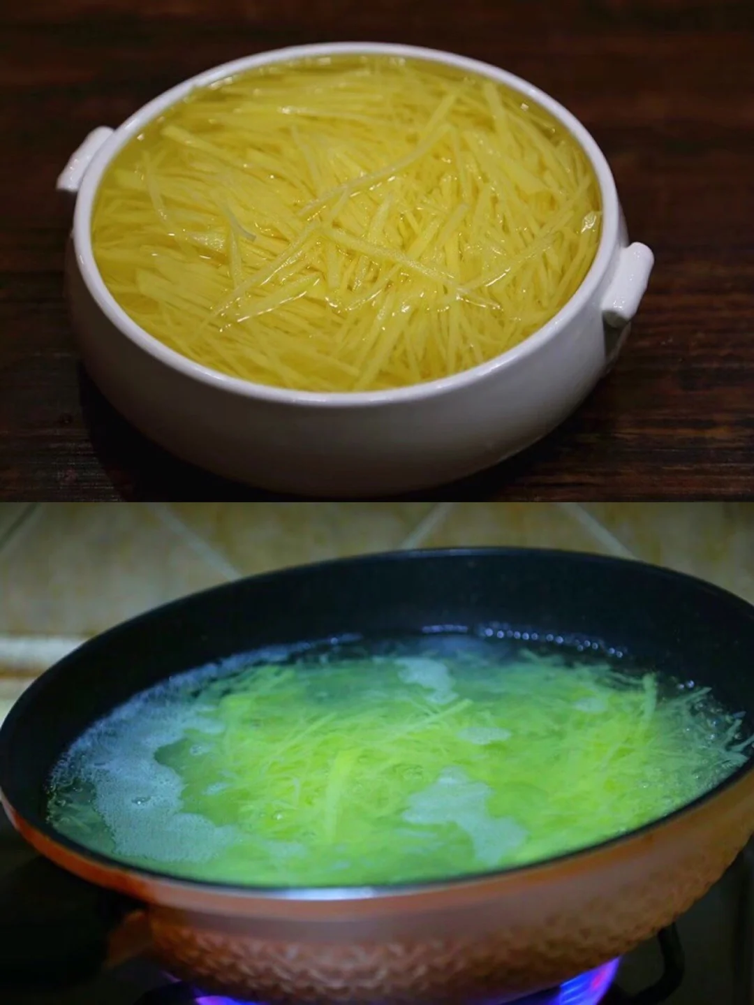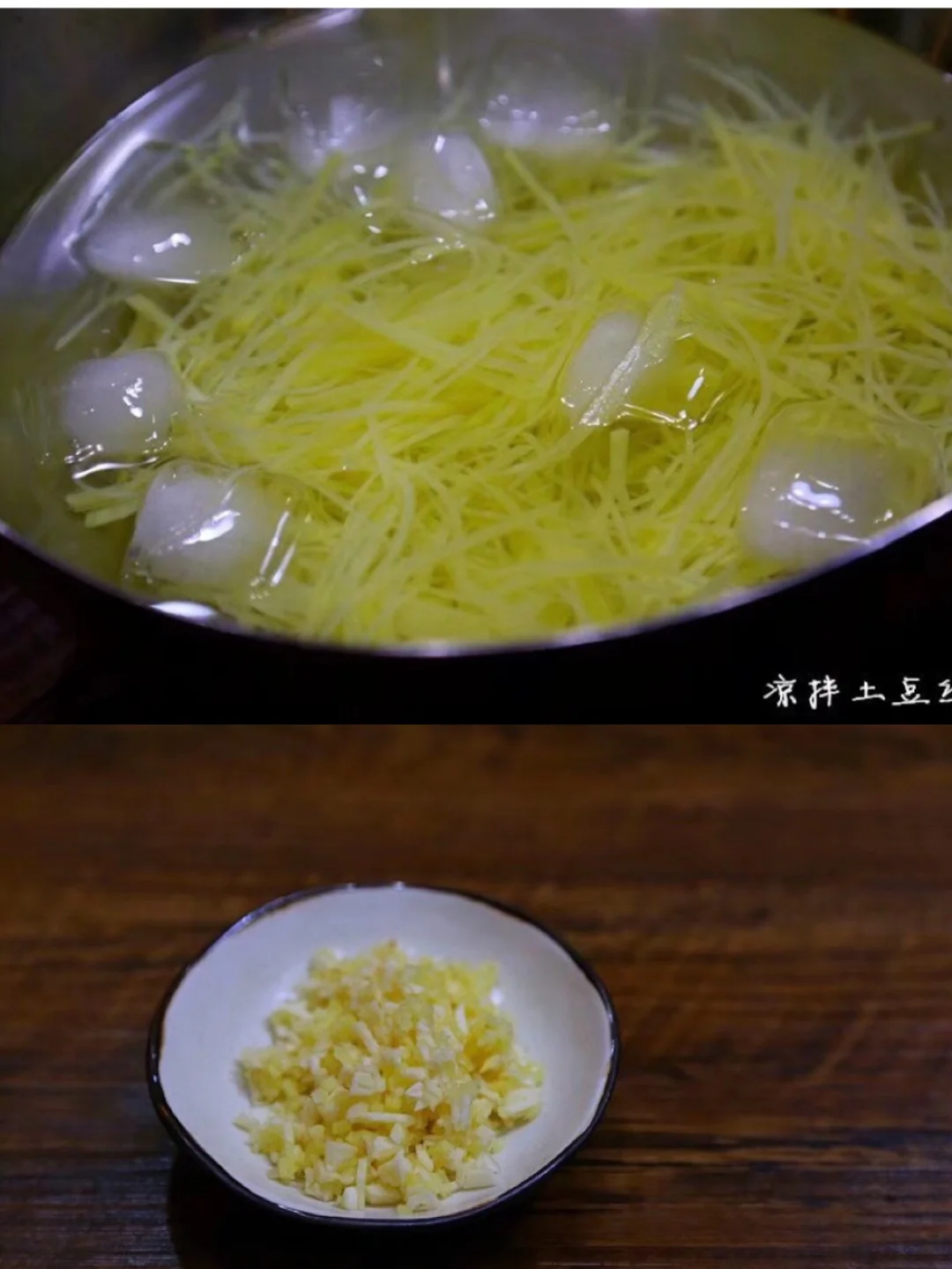 3.煮好的土豆丝沥干热水 然后放到准备好的冰水中激一下 口感更脆 没有冰块的话那就凉水的 反正冬天水都是冰的