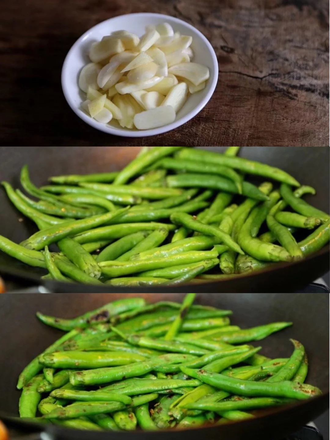 8.锅里烧热,不要放油,直接放入青椒扁炒,记得用锅铲压一压 时不时翻炒一下