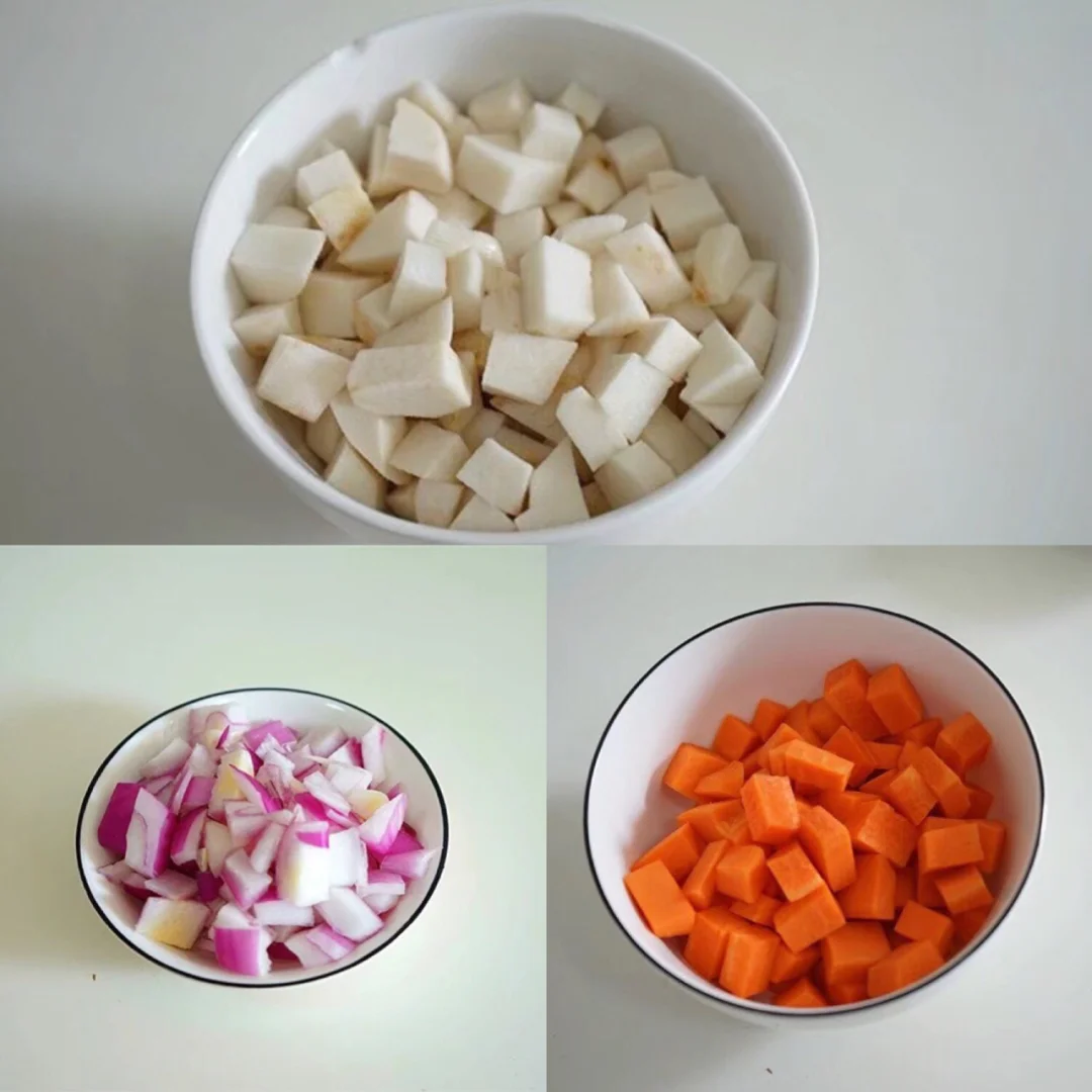 我今天刚好有芋头,就去皮切丁, 洋葱一样切小丁,胡萝卜去皮切小丁,这样是一是为了营养