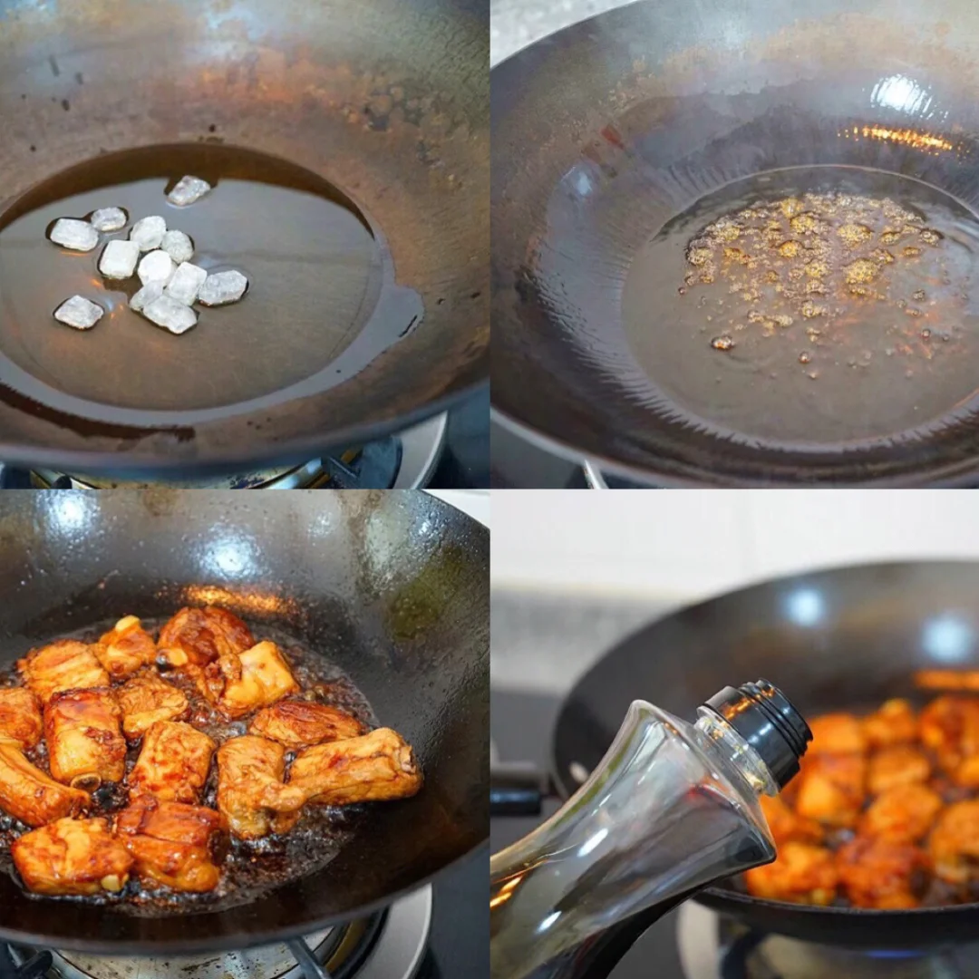 冷锅入油,加入少许冰糖