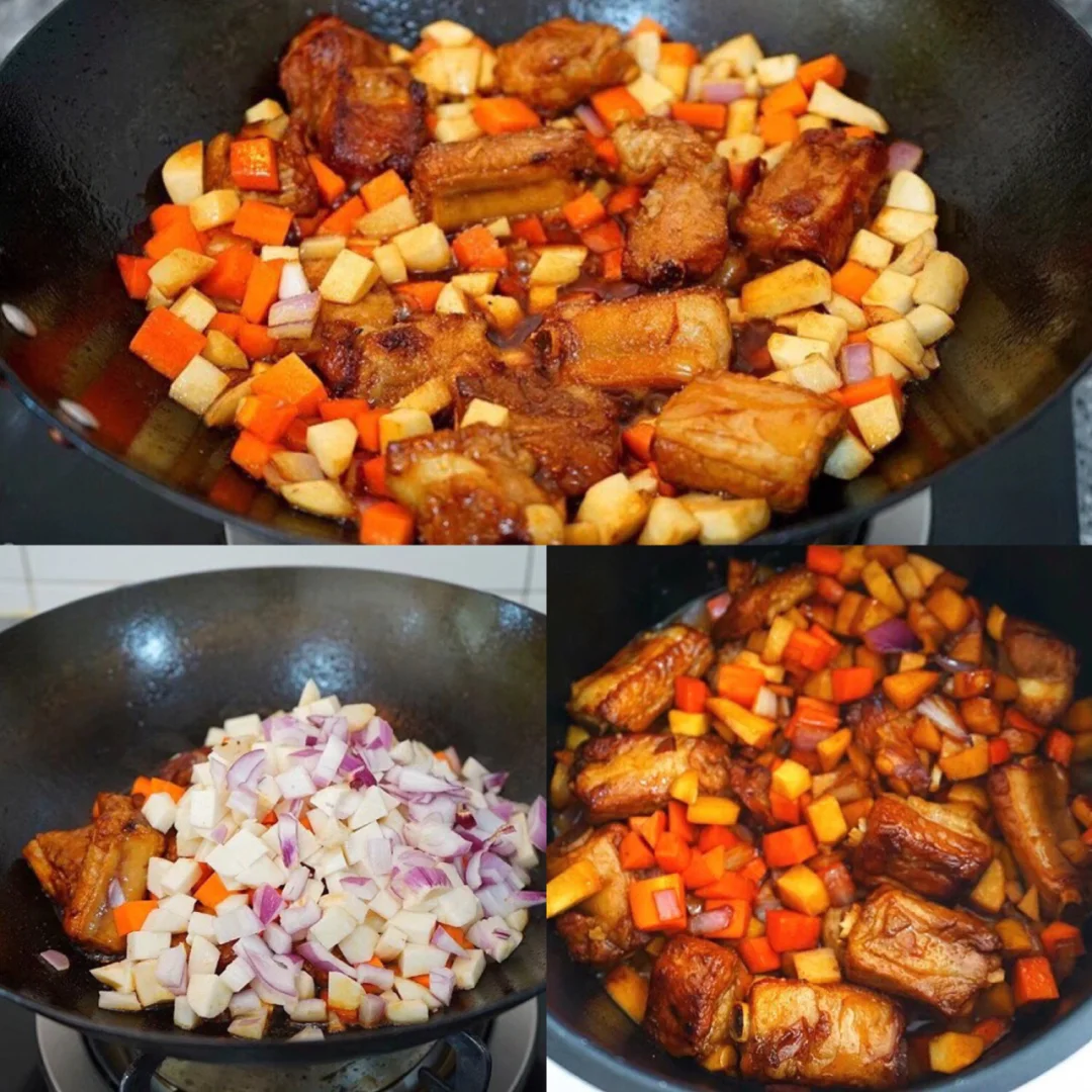 小火慢慢炒糖色,中间可以用锅铲押押,冒泡泡,沥干水的排骨倒进去,快速翻炒,全部裹上糖色,口味重的亲们可以放少量生抽,然后刚刚切好的配菜全部倒进去,快速翻炒,这个时候转大火没事