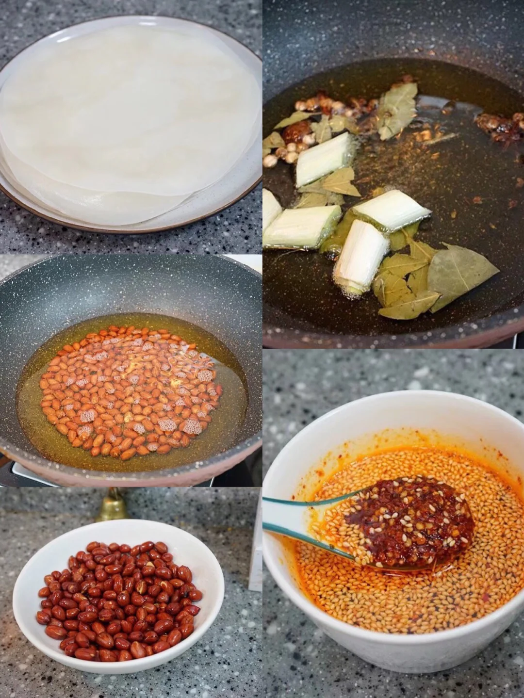 21.全部摊好的皮儿盖上保鲜膜放冰箱等会儿口感会更好哦 22.炸花生米开始:花生米冷油入锅,小火慢慢炸至七成熟就可以