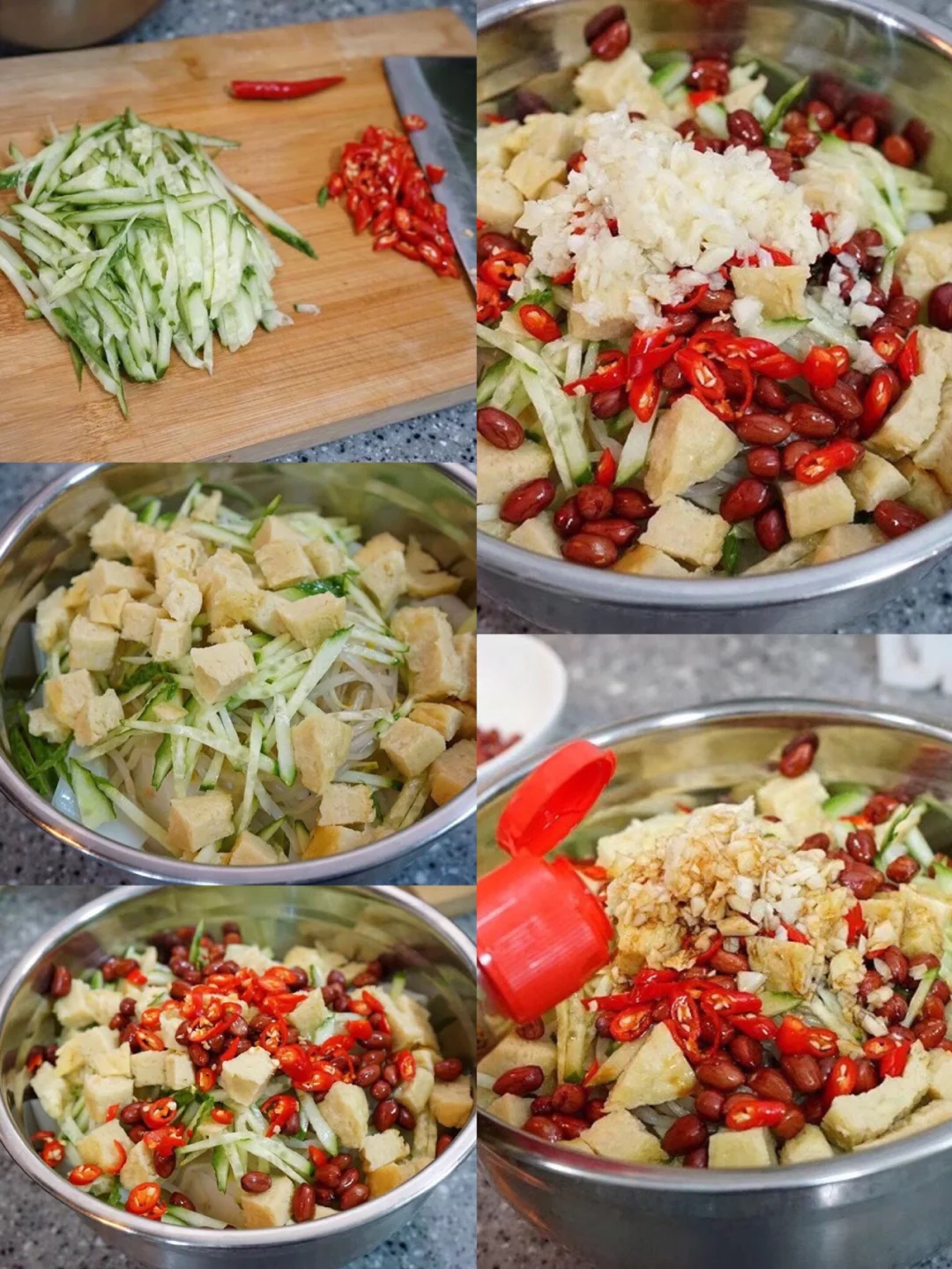30.凉好的面筋切小块黄瓜切丝儿,小米辣切小段31.凉皮碗里加入黄瓜丝儿,面筋块儿
