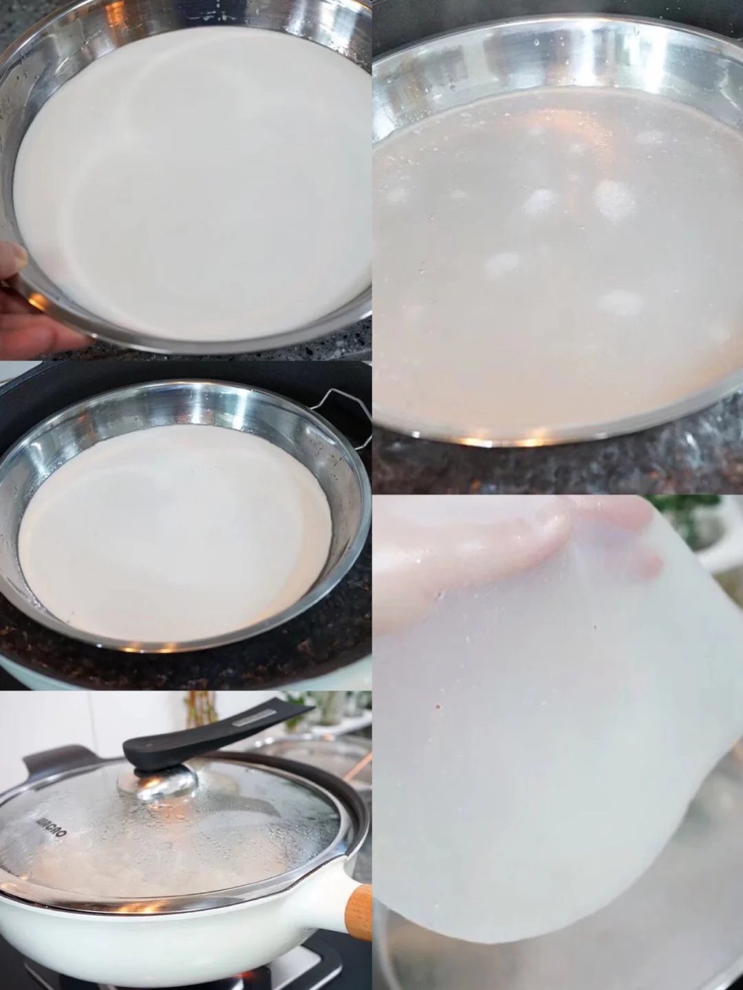 20.把已经蒸好的面皮连锅带盆一起放到提前准备好的凉水盆里,面皮冷却一下下,面皮揭下来,蒸好的面皮是半透明的抖一抖,很有韧性哦