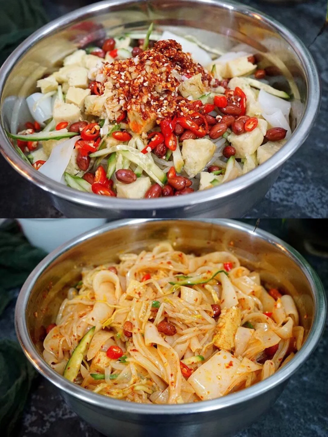 34.两勺凉拌汁儿,一勺生抽,两勺香醋,一勺芝麻香油,35.放入刚才准备好的辣椒油,少许盐,鸡粉,白糖,筷子搅拌均匀,尝尝味道缺啥放啥