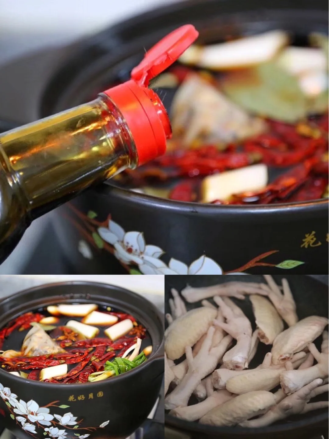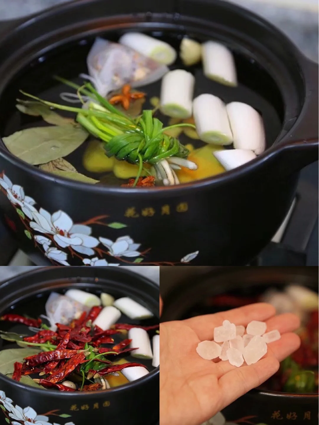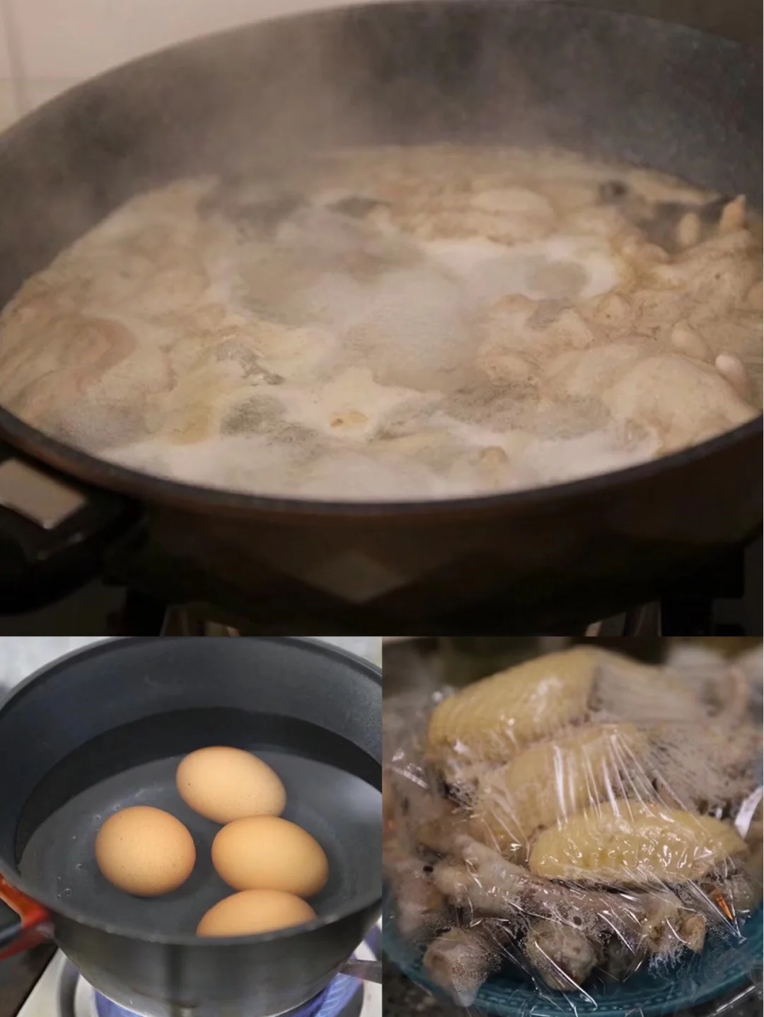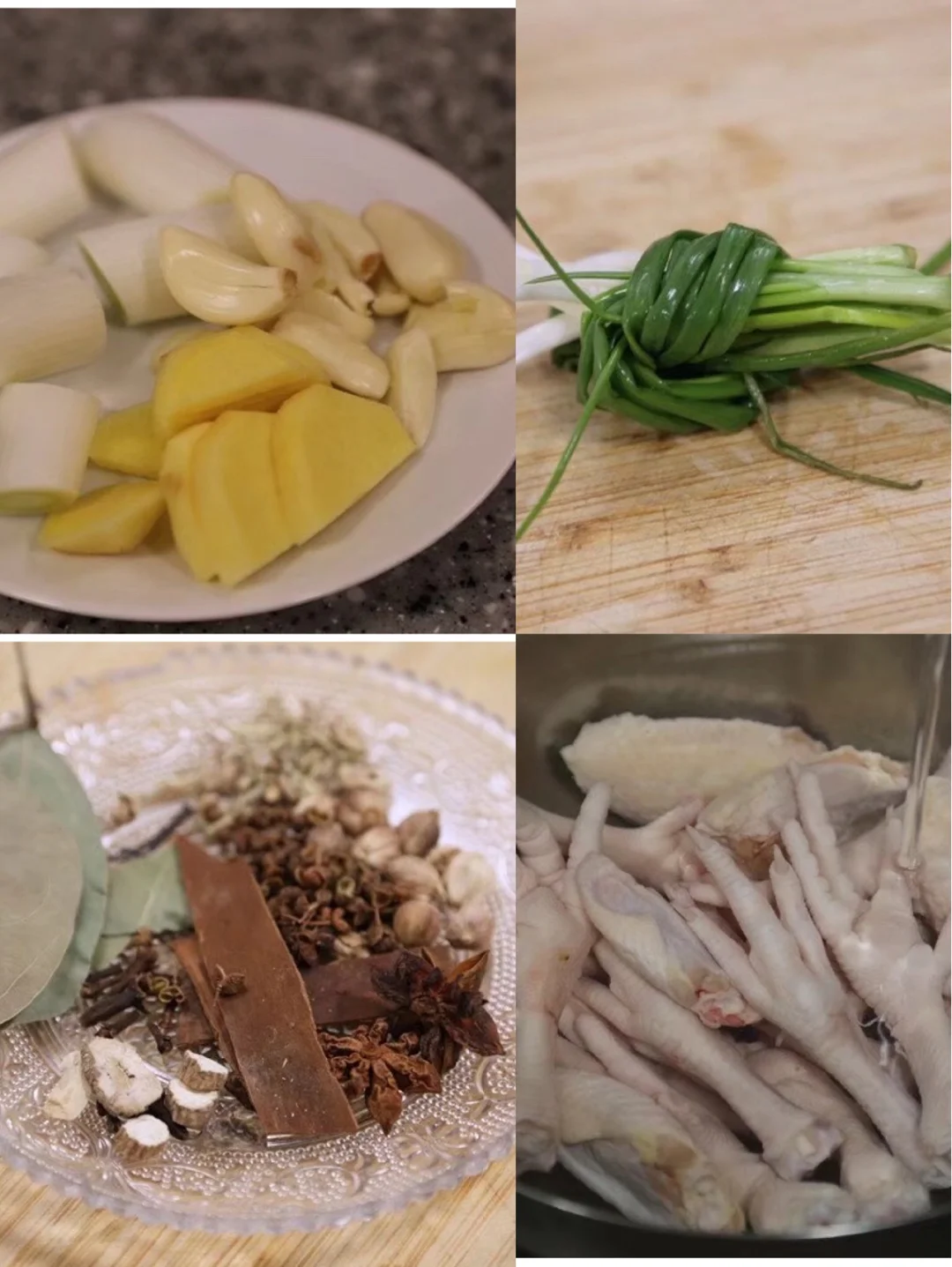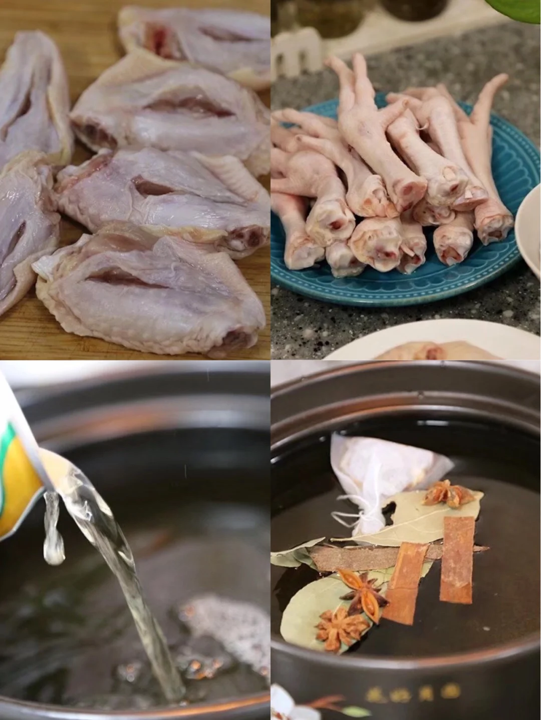 18.全部好了以后盖上盖子大火煮开之后转中小火慢慢煲 把味道先弄出来 这很关键的,煲四十分钟以后熄火焖一个小时 如果没有时间就忽略,直接放食材19.鸡翅鸡爪冷水如果,一勺料酒大火开煮