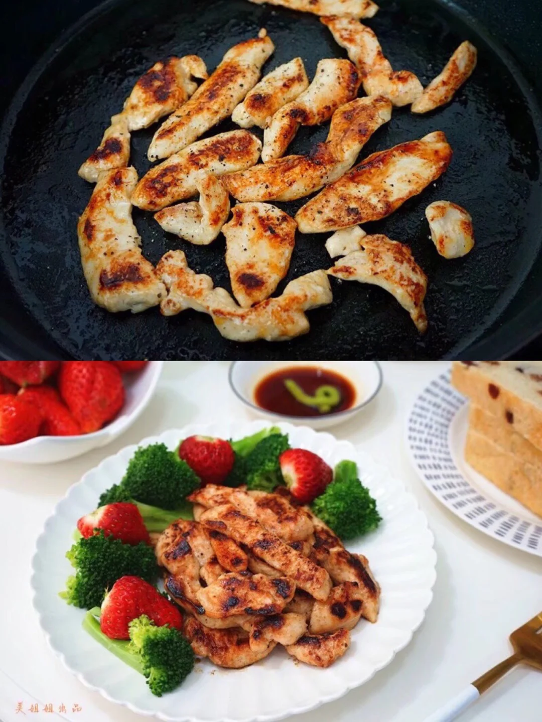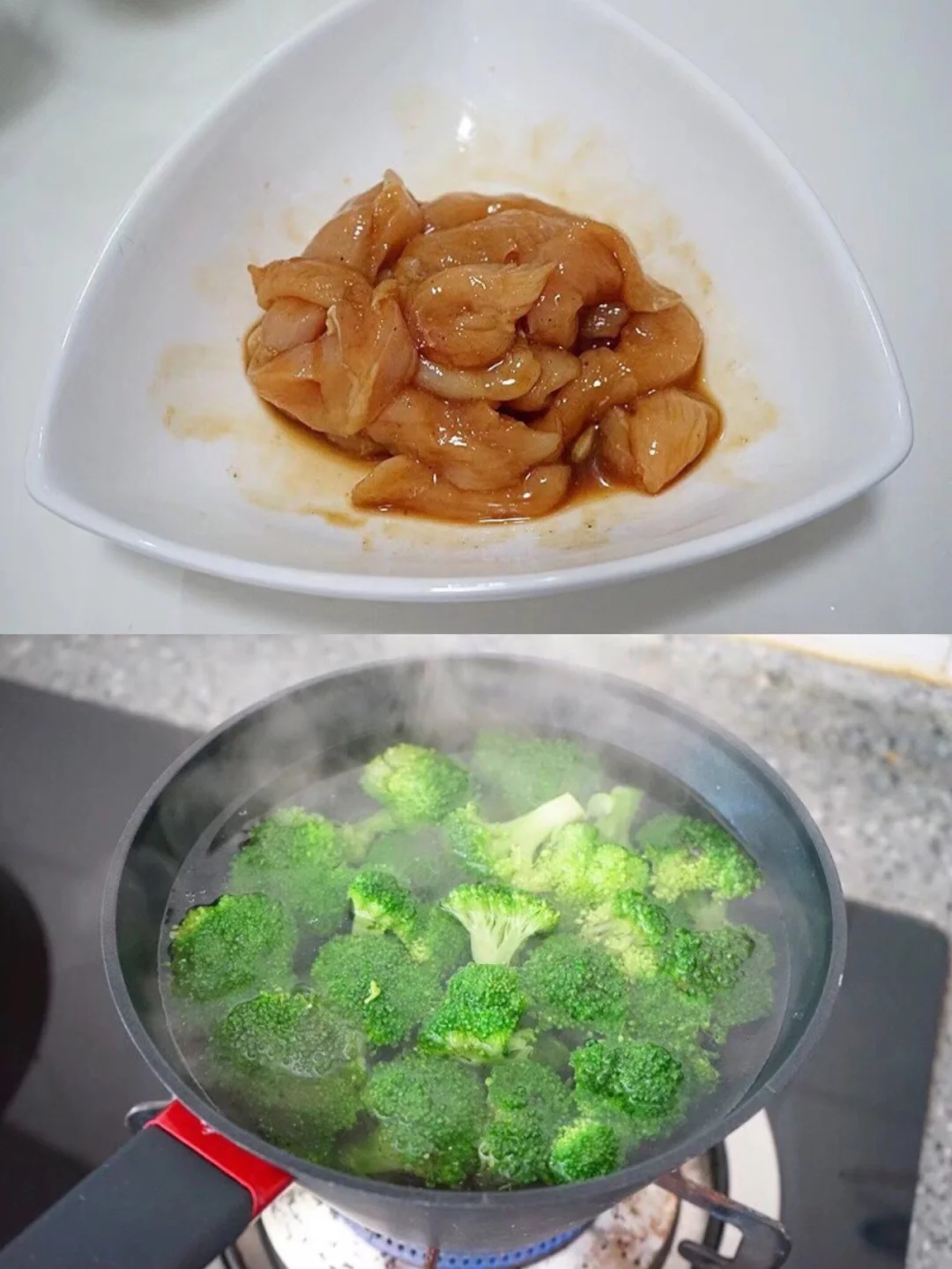 材料:鸡胸肉一块,蚝油一勺半,生抽两勺,蜂蜜半勺,胡椒粉适量,柠檬汁少许,西兰花半颗