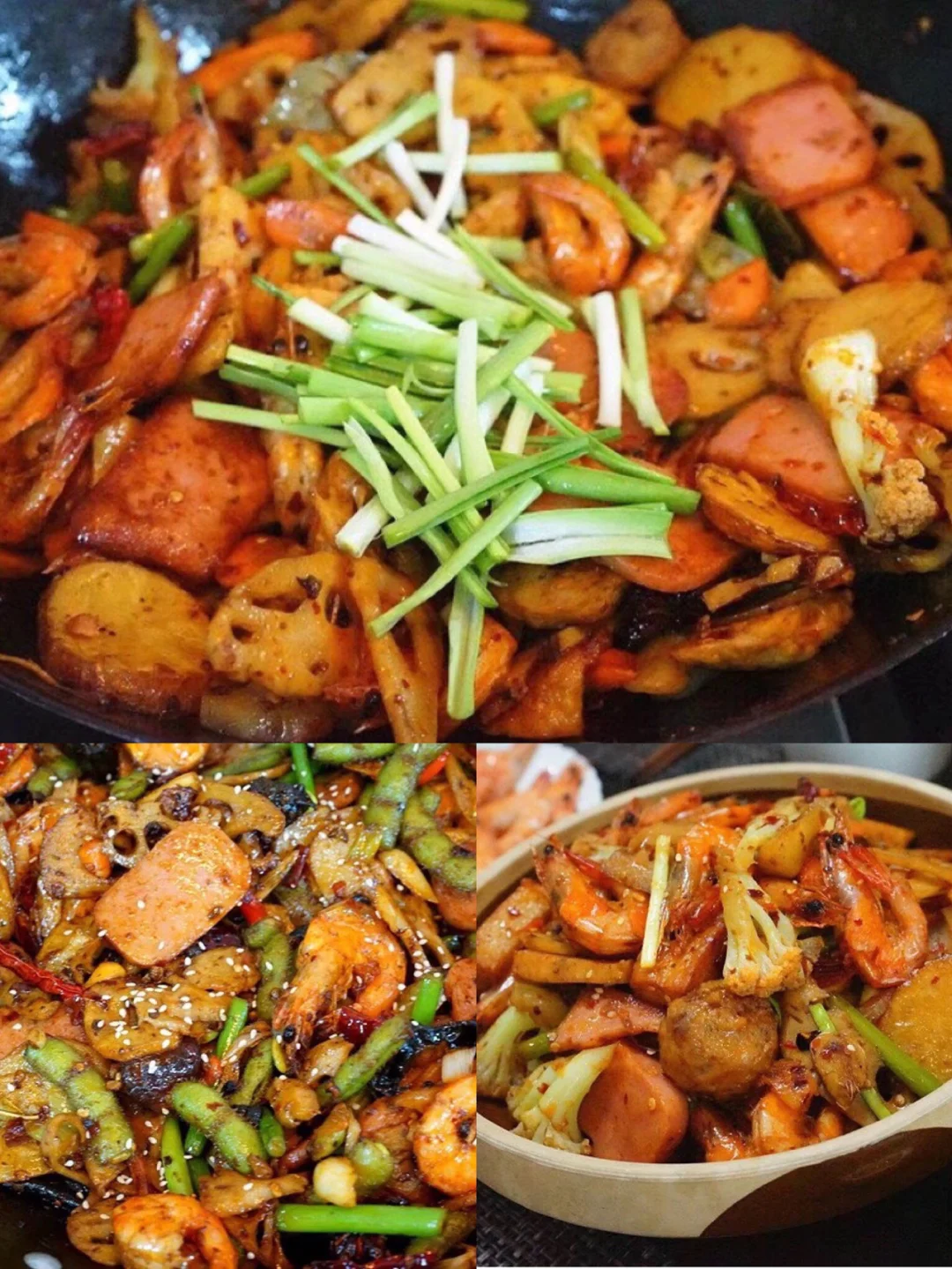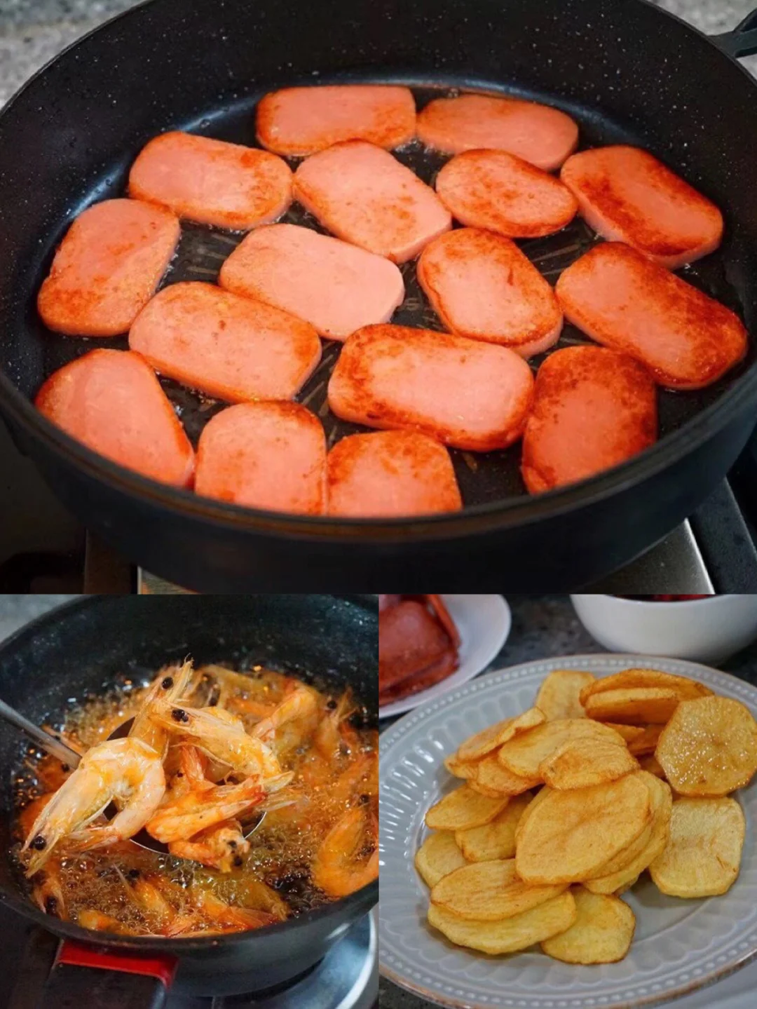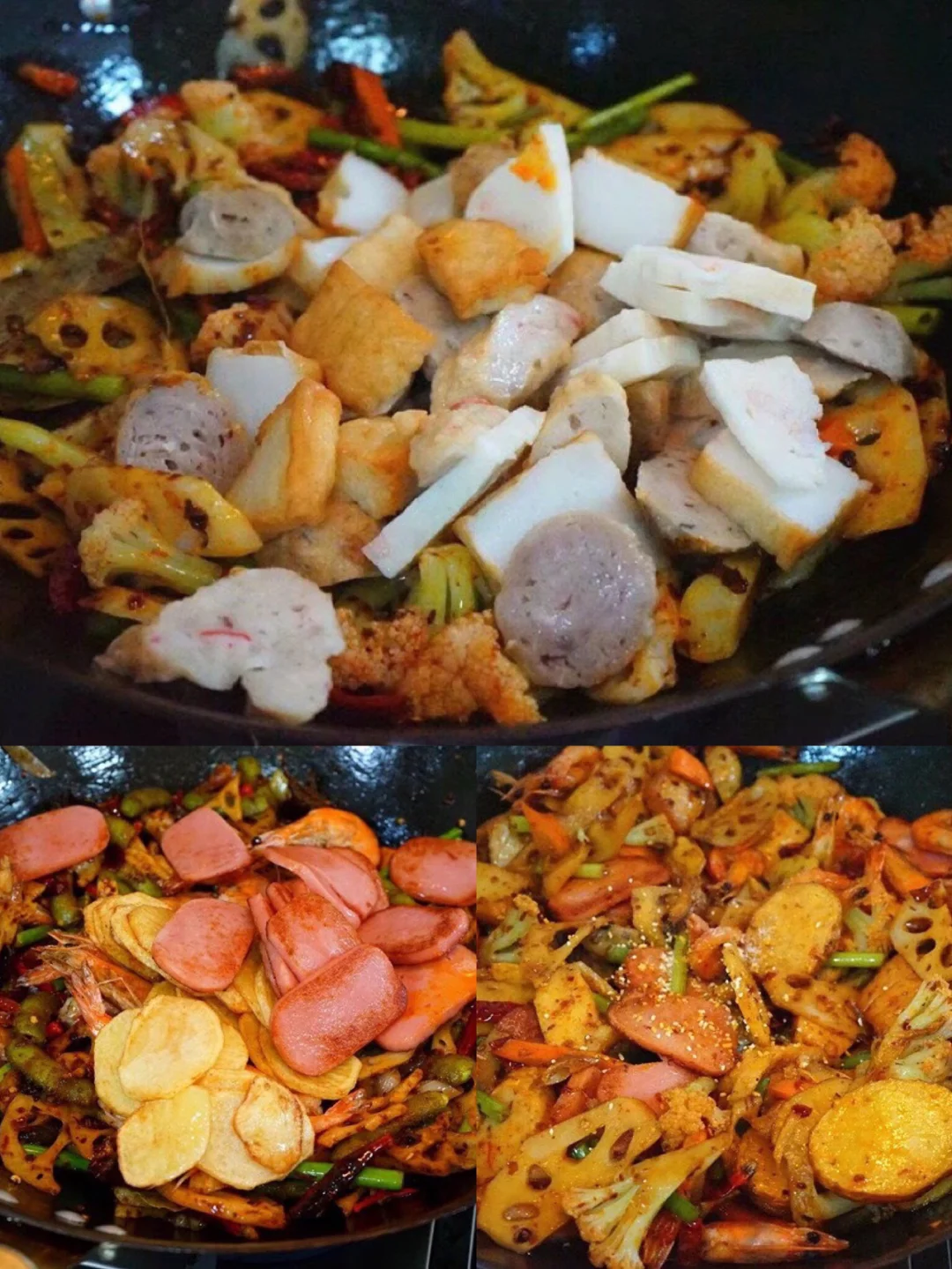 20.炸好的土豆片,午餐肉,虾一起丢进去快速翻炒 21.加入少许盐,鸡粉,白糖四分之一勺调味儿 这个不绝对火锅底料里已经有咸度了 所以悠着点先尝一下