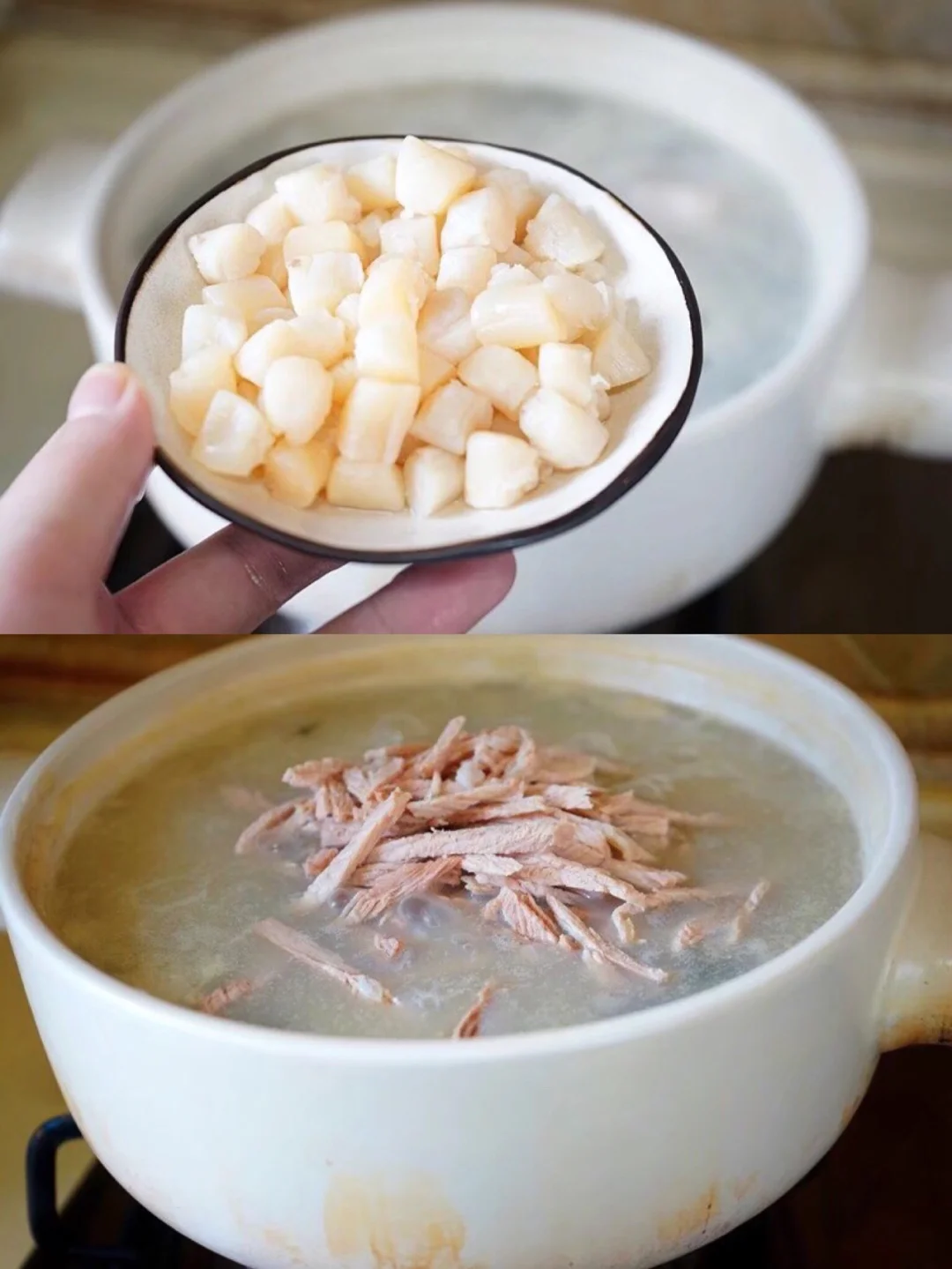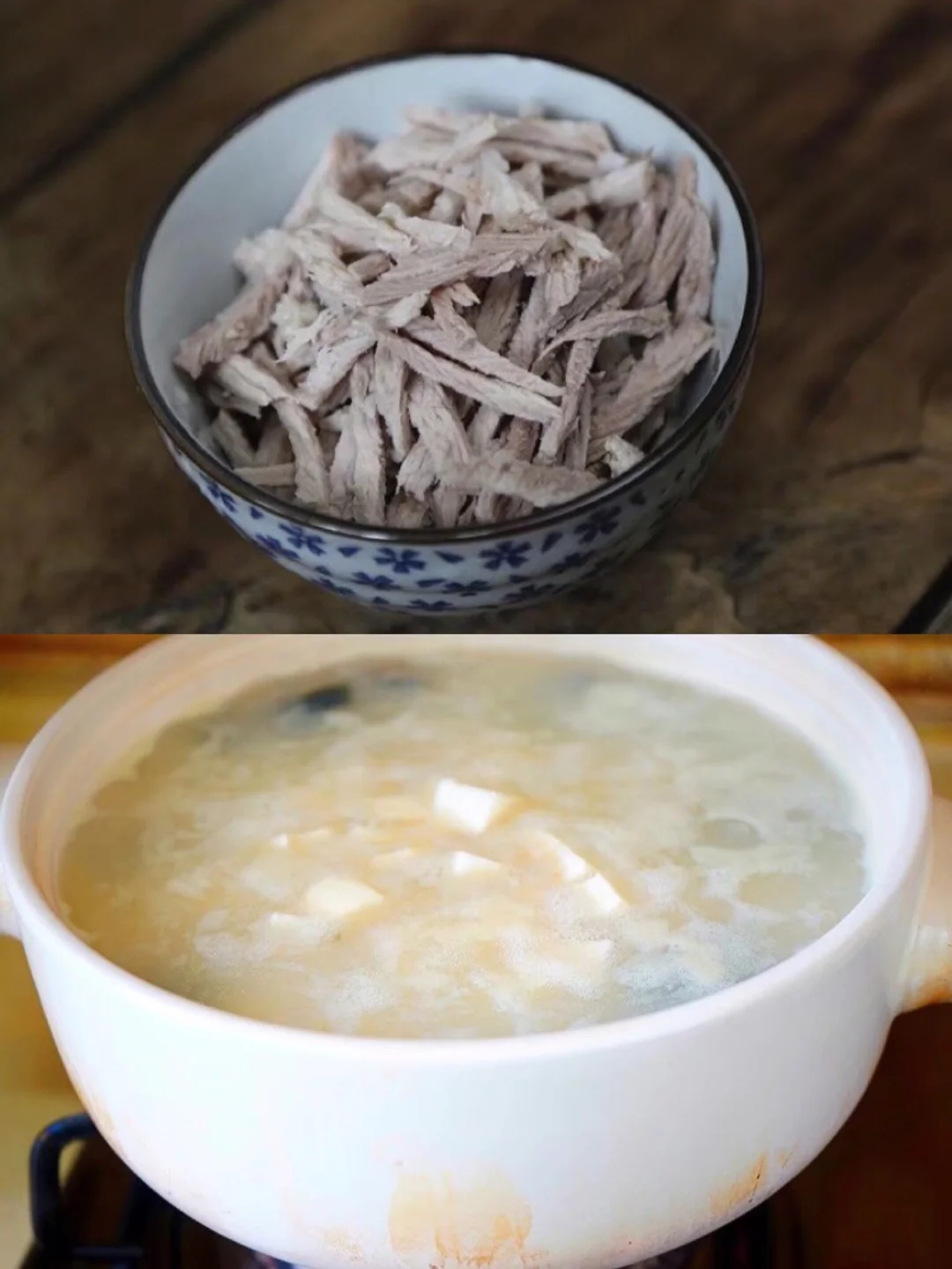 7.粥差不多六七成熟的时候肉拿出来,撕成丝儿 怕烫直接刀上就行