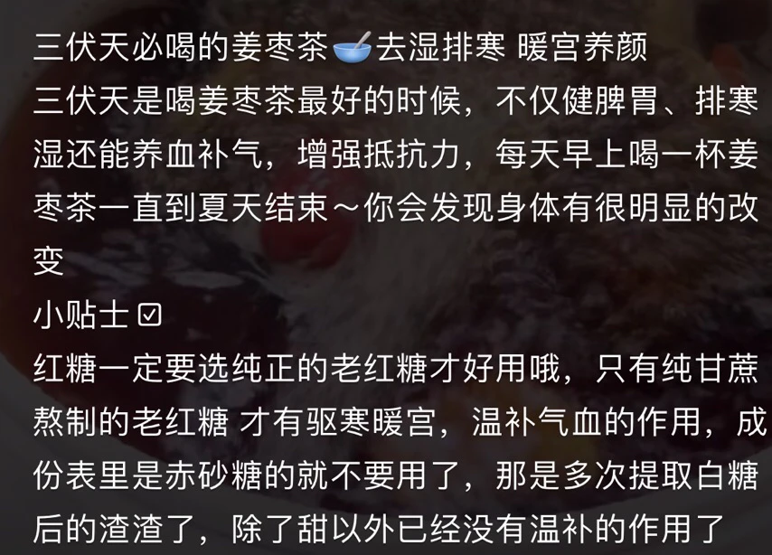 姜枣茶: 三伏天是喝姜枣茶最好的时候,不仅健脾胃、排寒湿还能养血补气,增强抵抗力,每天早上喝一杯姜枣茶一直到夏天结束~你会发现身体有很明显的改变 小贴士囚 红糖一定要选纯正的老红糖才好用哦,只有纯甘蔗熬制的老红糖才有驱寒暖宫,温补气血的作用,成份表里是赤砂糖的就不要用了,那是多次提取白糖后的渣渣了,除了甜以外已经没有温补的作用了