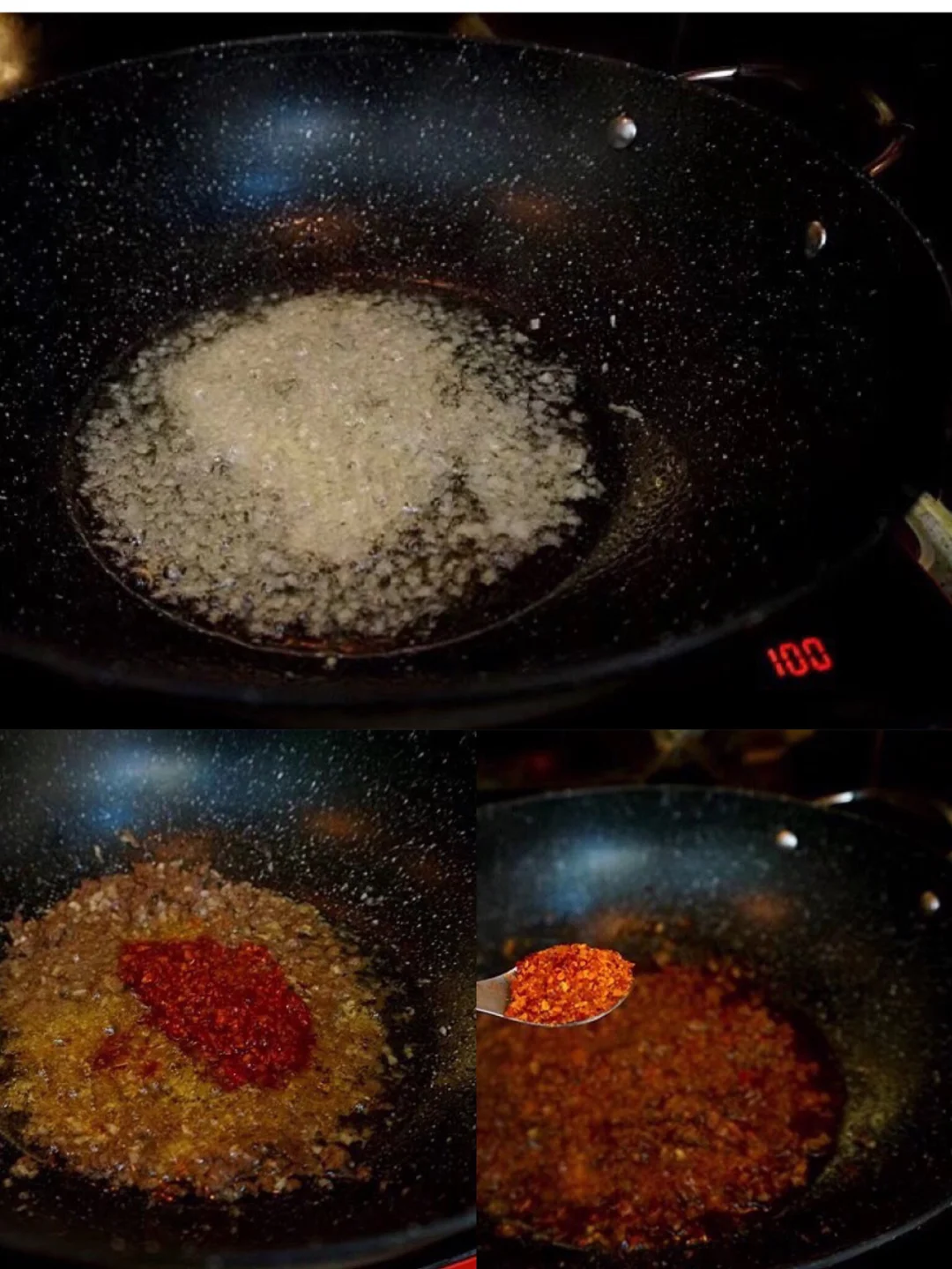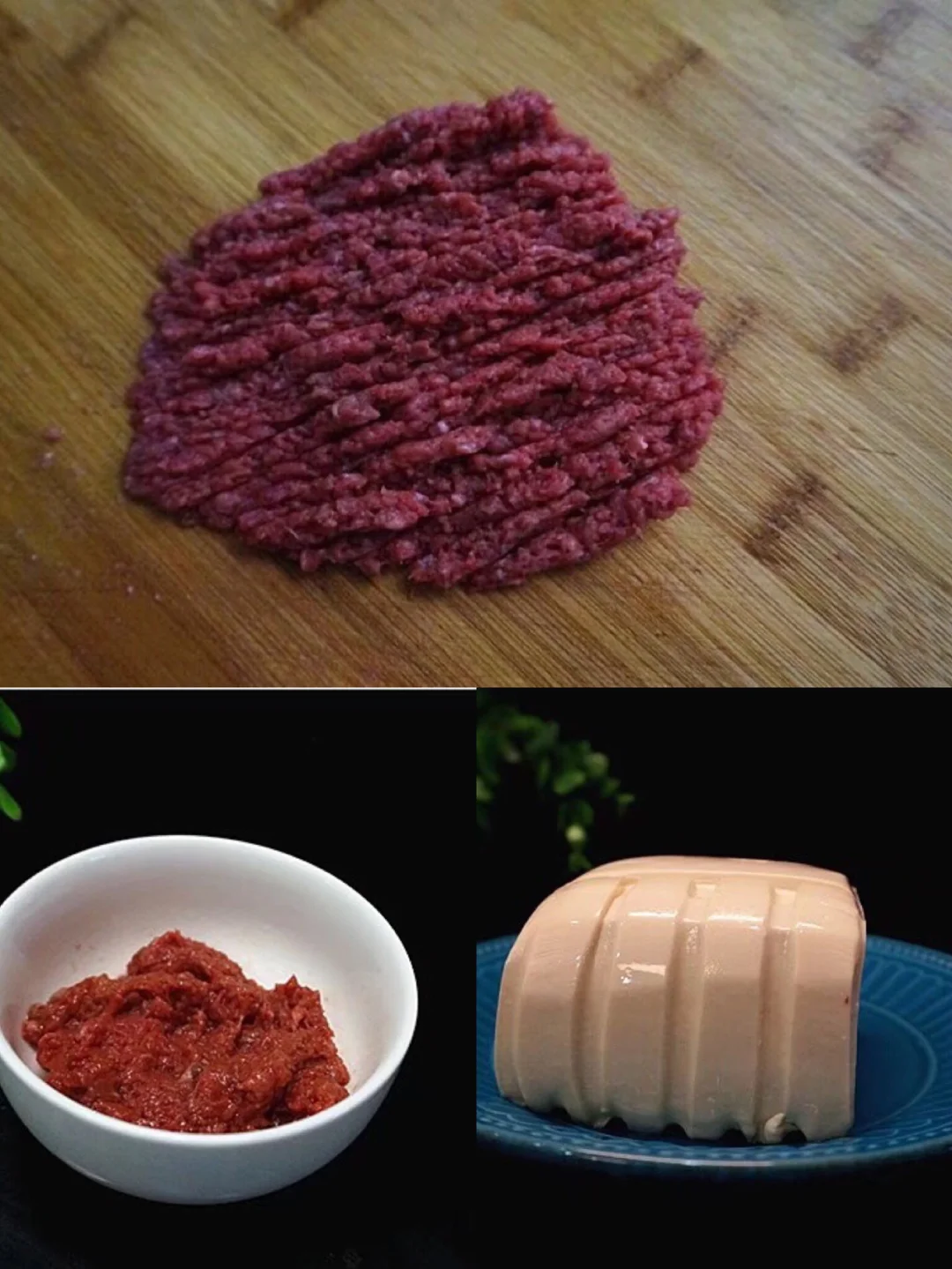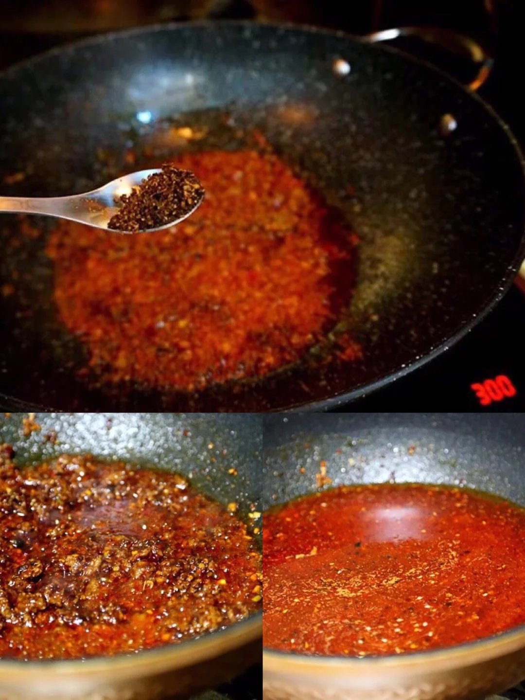 12.放牛肉糜快速滑熟,切好的豆瓣酱加入小火慢慢炒出红油