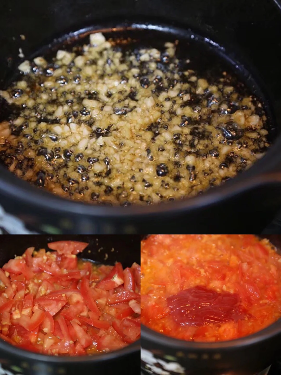 12.用锅铲一扁炒一边压,出沙状态的时候加入多一些的番茄酱【这样味道会更浓郁哦】